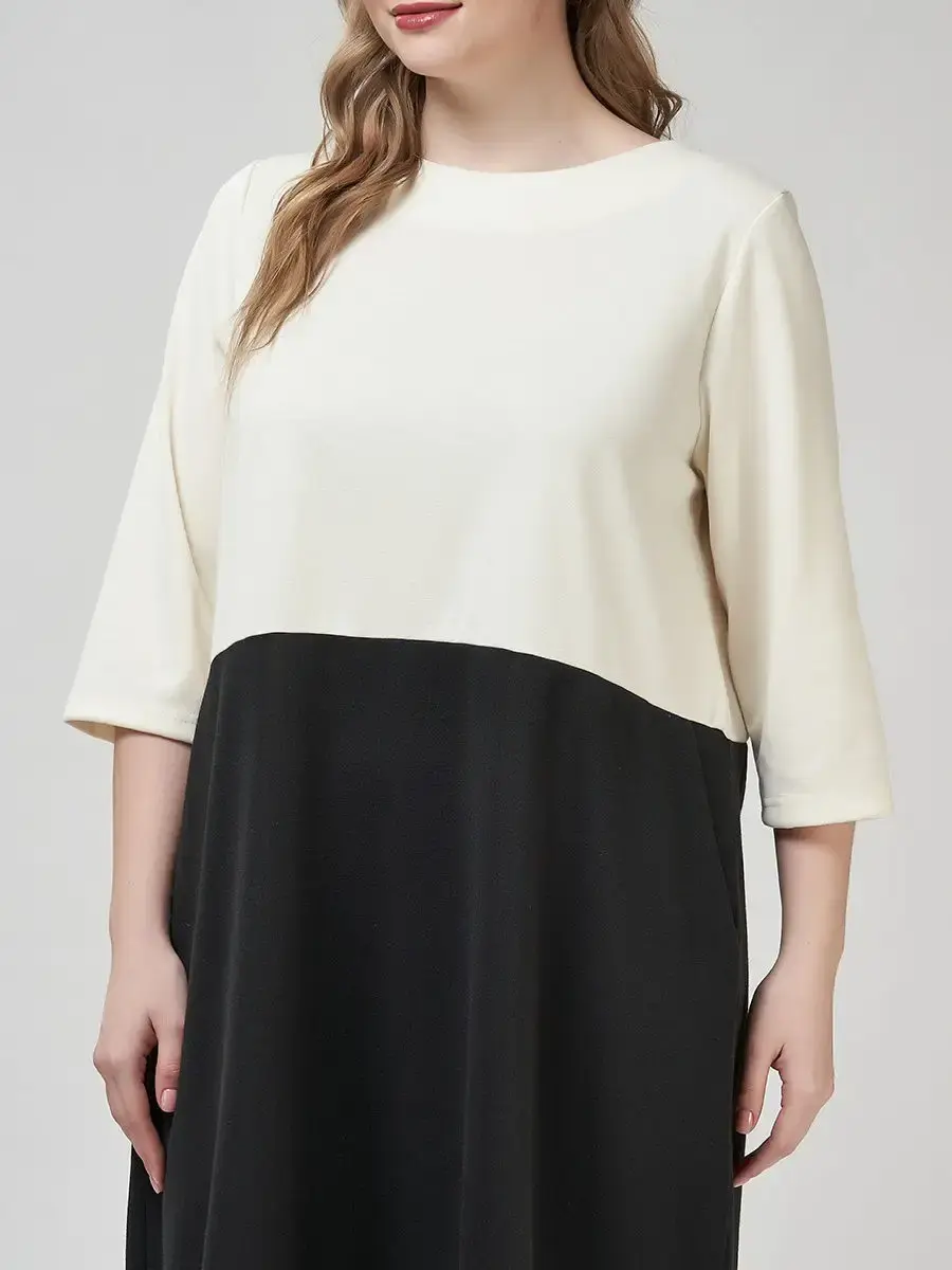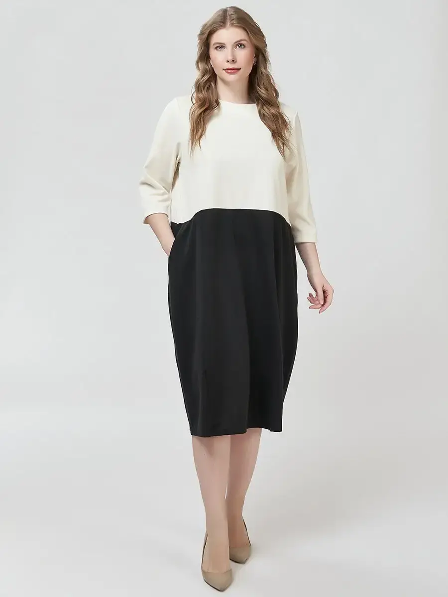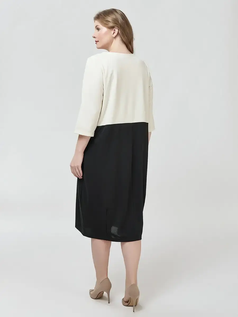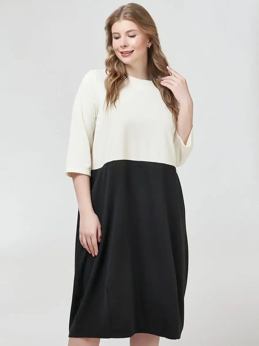 Стильное платье свободного силуэта, выполненное в монохромной комбинации тканей, длиной до середины голени, с прямыми втачными рукавами 3/4, круглым вырезом горловины. Платье отрезное, присборенное выше линии талии.