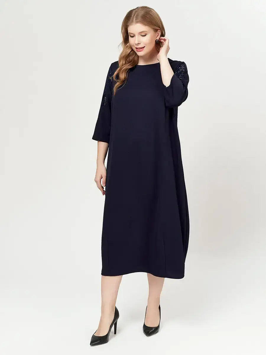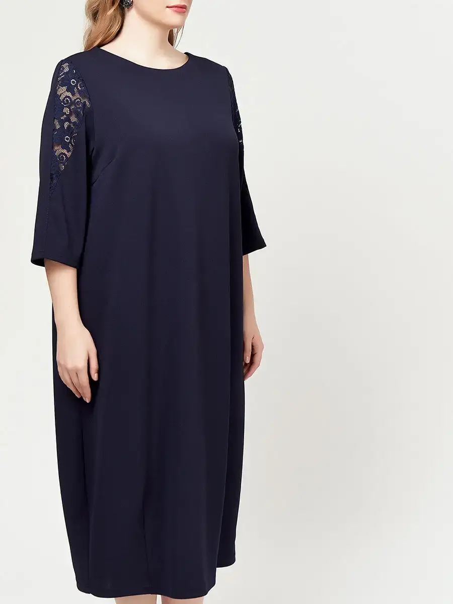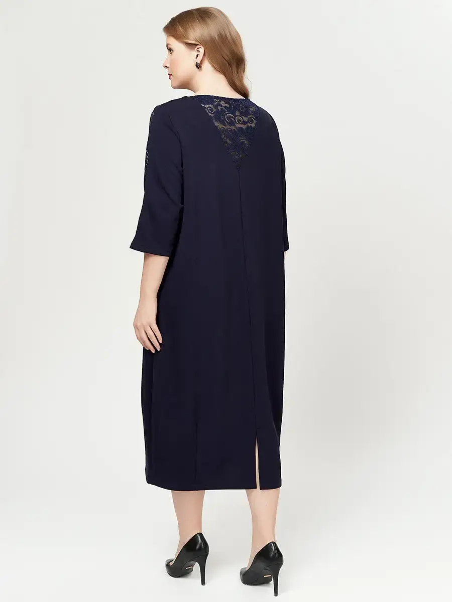 Стильное платье-тюльпан длиной до середины голени, с V-образными гипюровыми вставками вверху спинки и на рукавах длиной 3/4. Изделие свободного кроя, с подчеркнутой линией плеча, конструктивными защипами по низу и небольшим разрезом сзади.