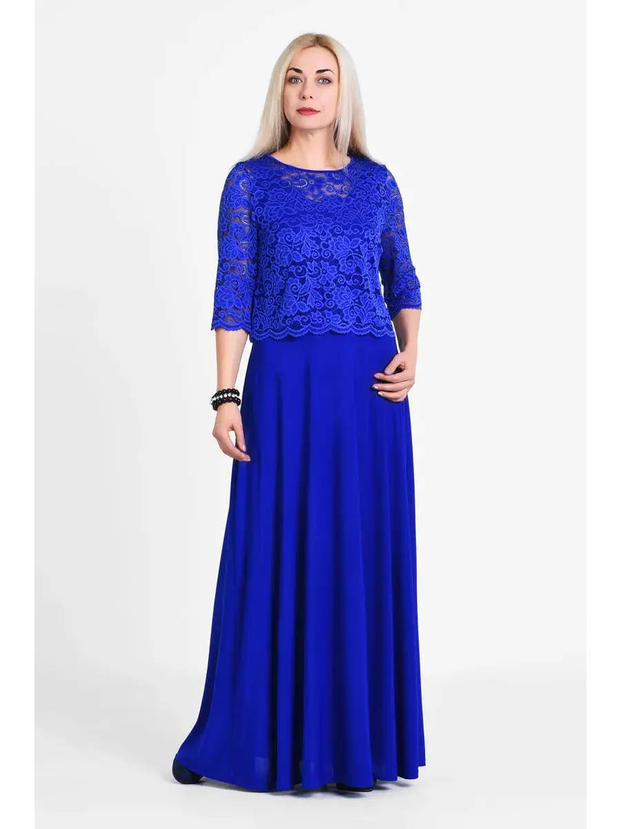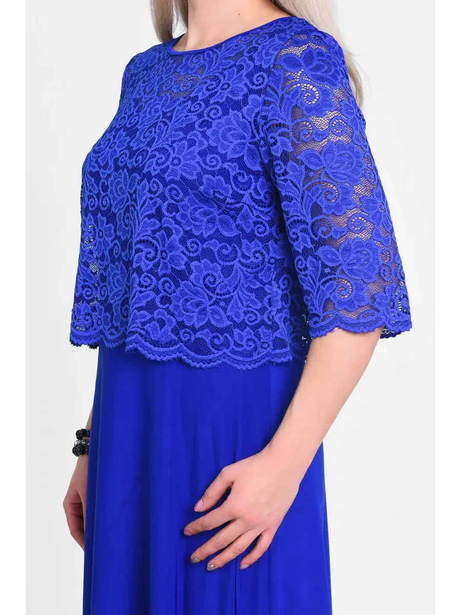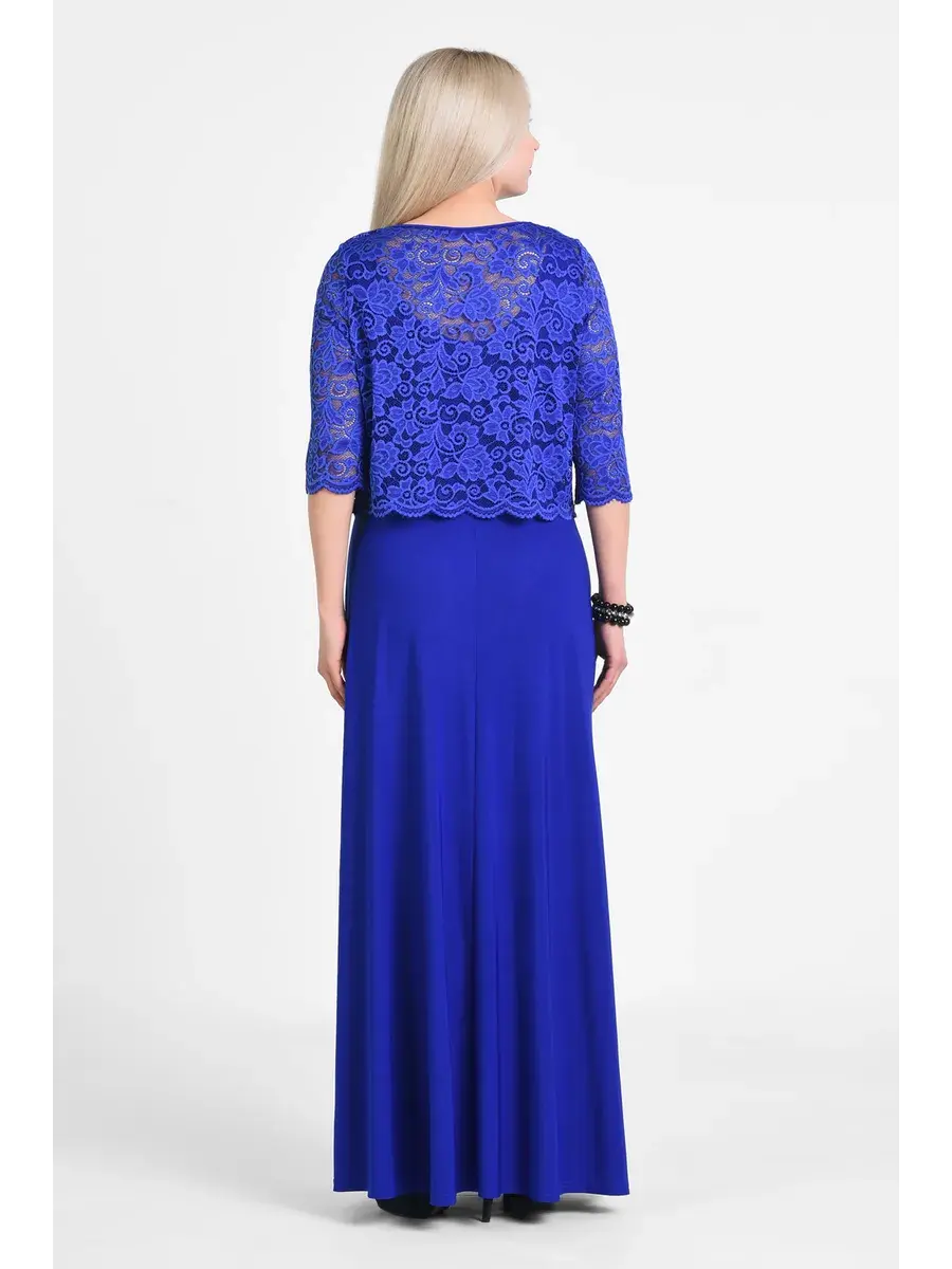 Эффектное многослойное платье макси, выполненное в комбинации струящегося трикотажа-масло и гипюра. Верх изделия в виде кружевного болеро с ажурным низом и обшлагами рукавов 3/4; с круглым вырезом горловины, надетого на полуприлегающий сарафан с глубоким вырезом «подкова» спереди и сзади. Модель придает образу женственность и мягкость, зрительно удлиняет ноги, делает силуэт грациозным. Драпировка нижней части изделия скрадывает формы.