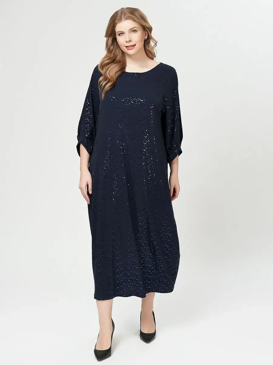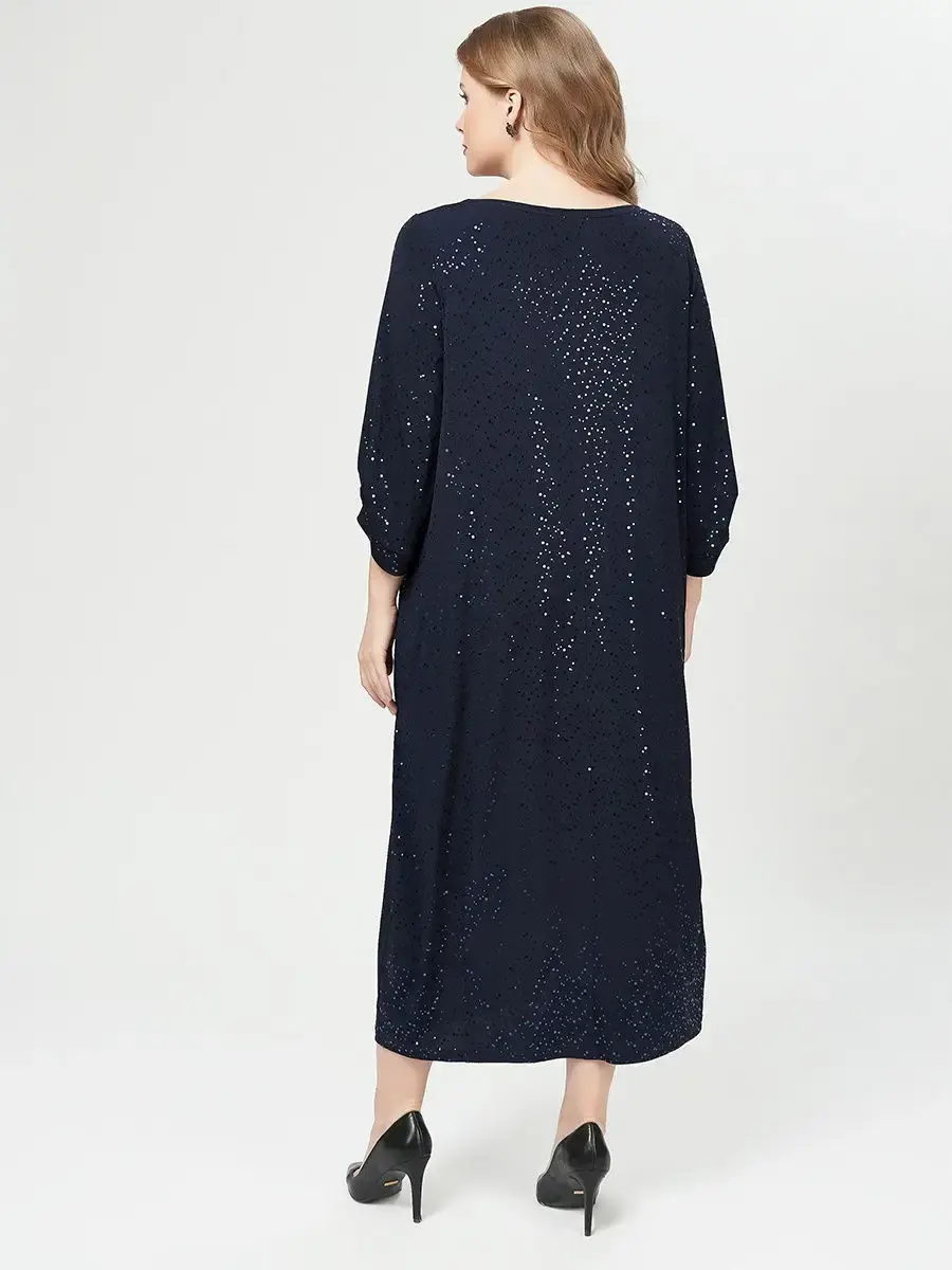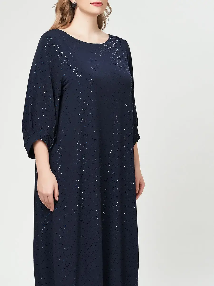 Нарядное платье в стиле бохо из ткани масло с принтом, имитирующим пайетки, классической длины миди. Модель свободного кроя с глубоким круглым вырезом горловины, широкими втачными рукавами с манжетами 3/4.