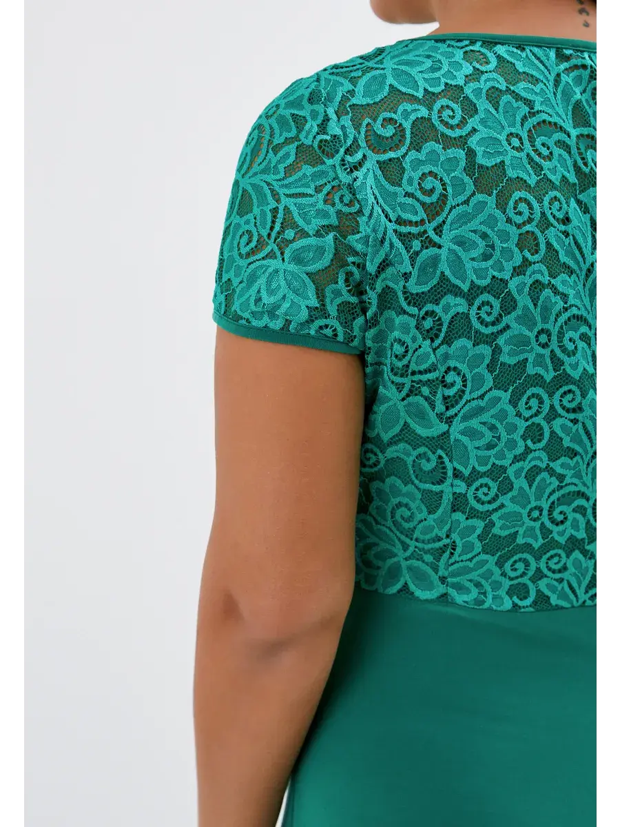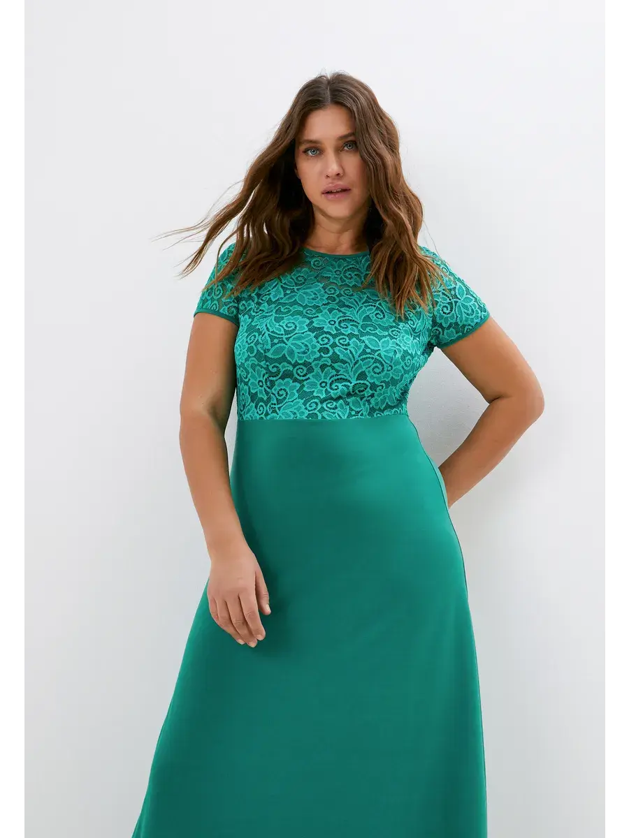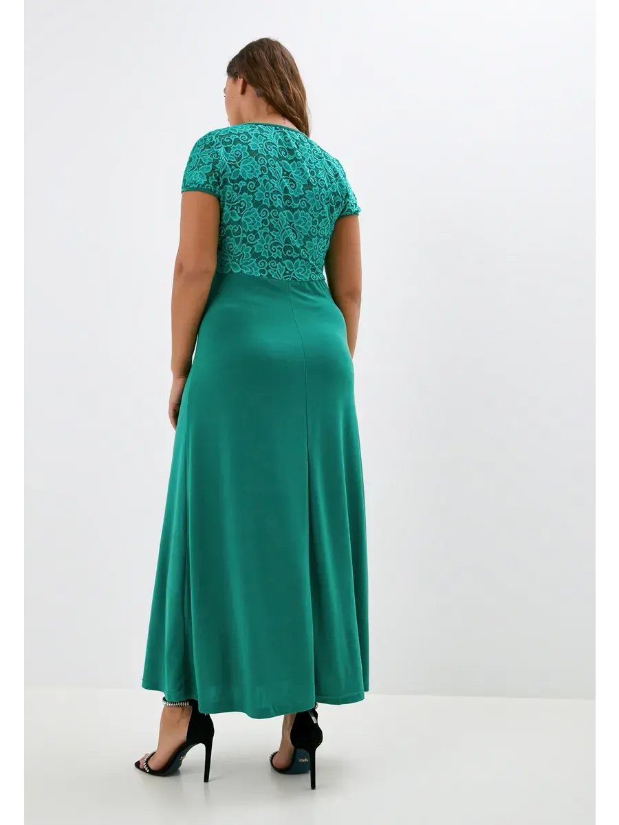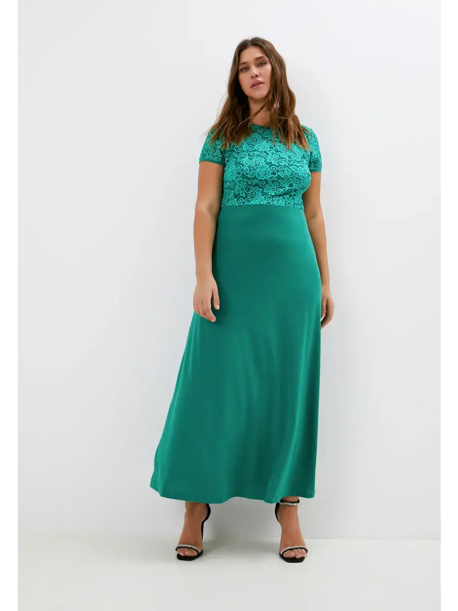 Эффектное нарядное платье макси, выполненное в комбинации струящегося трикотажа-масло и гипюра. Верх изделия и рукава из эластичного кружева; с круглым вырезом горловины. Модель придает образу женственность и мягкость, зрительно удлиняет ноги, делает силуэт грациозным. Драпировка нижней части изделия скрадывает формы.