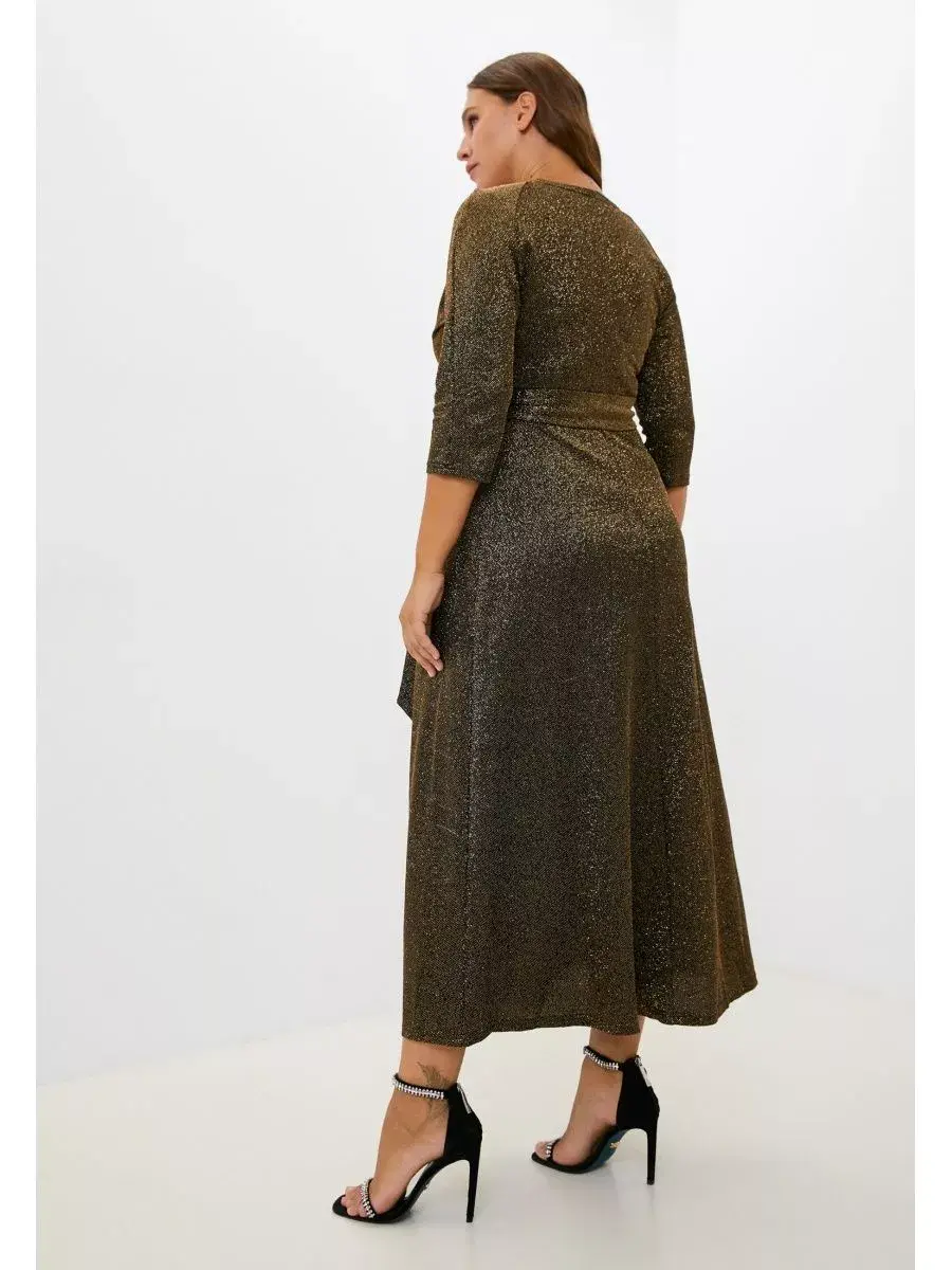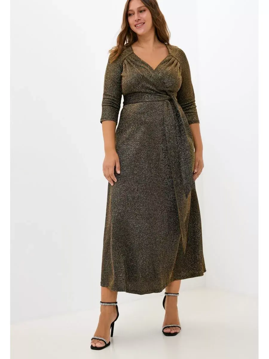 Праздничное изысканное длинное платье макси из струящегося полотна с люрексом. Модель прилегающего силуэта, с поясом в комплекте; отрезная по талии, с глубоким вырезом фигурное каре, рукавами-реглан 3/4, с защипами, придающими форму лифу. Женственный и элегантный наряд подчеркнет талию, шикарную грудь и скроет лишние объемы. Женское нарядное платье большие размеры.