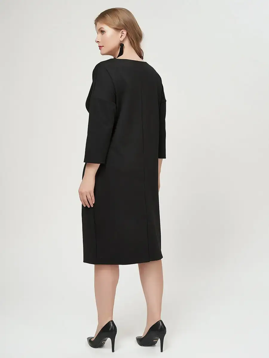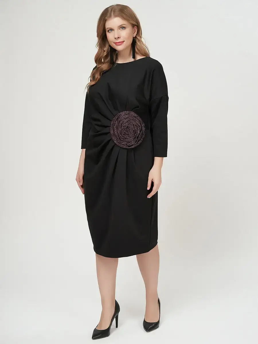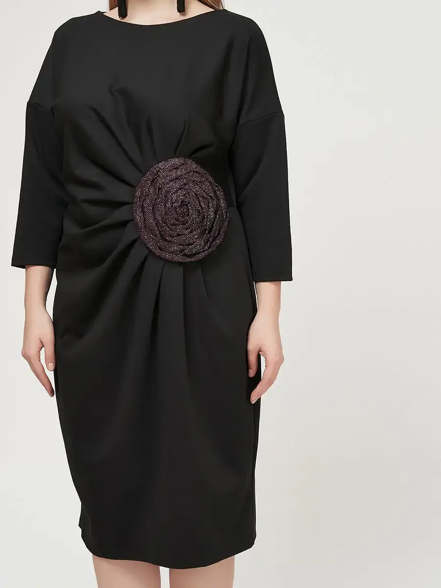 Элегантное нарядное платье в японском стиле, длиной до колен, из плотного полотна с матовым блеском, с рукавами со спущенной проймой 3/4, вырезом горловины – лодочка. Модель чуть заужена книзу, с разрезом-шлицей сзади. По талии платье декорировано розой из ткани с люрексом.