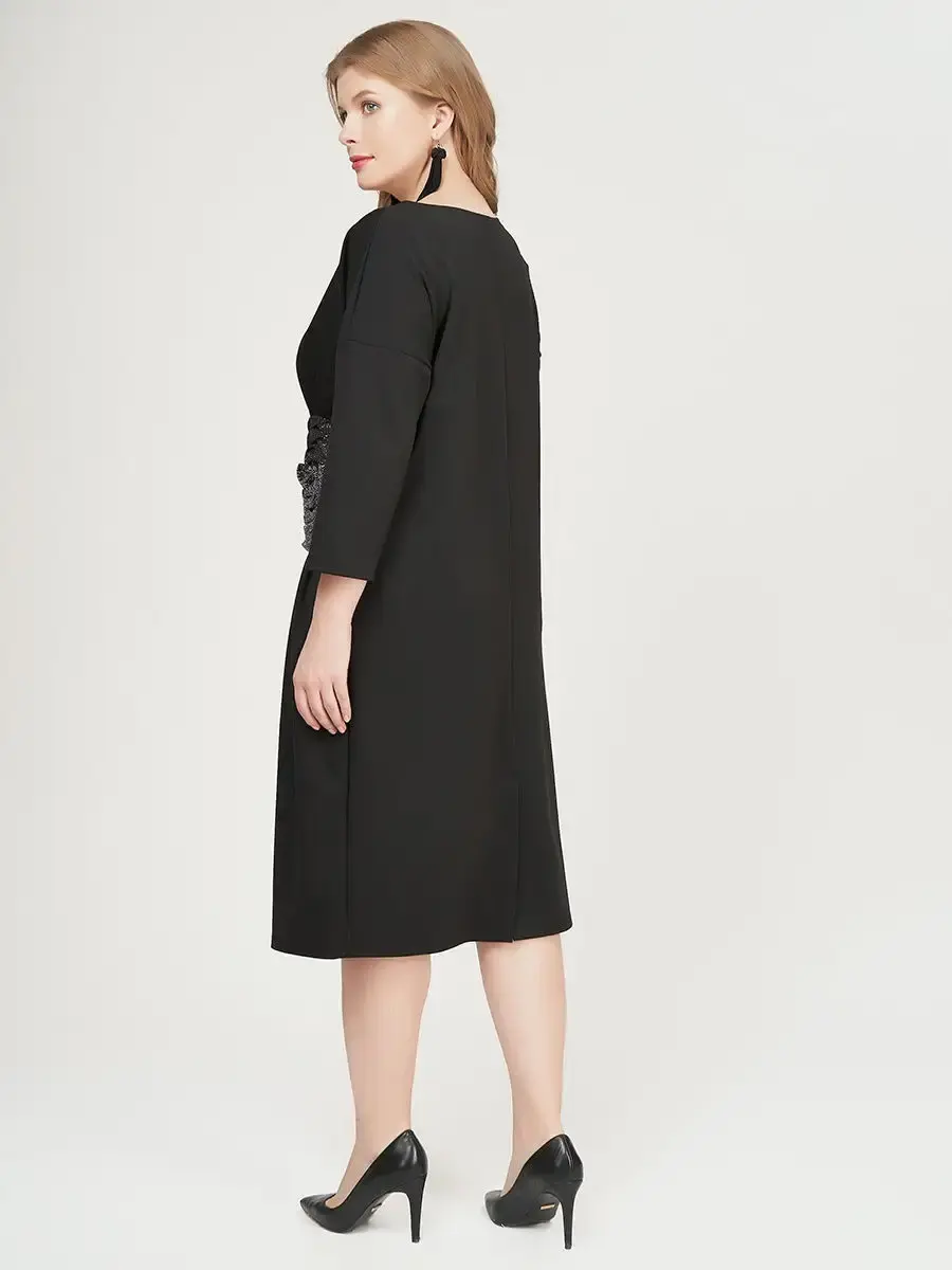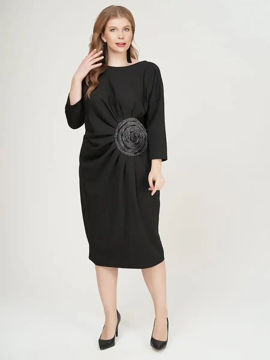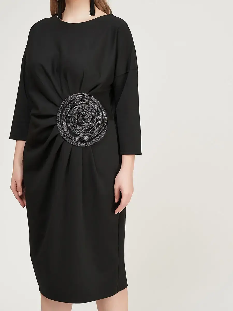 Элегантное нарядное платье в японском стиле, длиной до колен, из плотного полотна с матовым блеском, с рукавами со спущенной проймой 3/4, вырезом горловины – лодочка. Модель чуть заужена книзу, с разрезом-шлицей сзади. По талии платье декорировано розой из ткани с люрексом.
