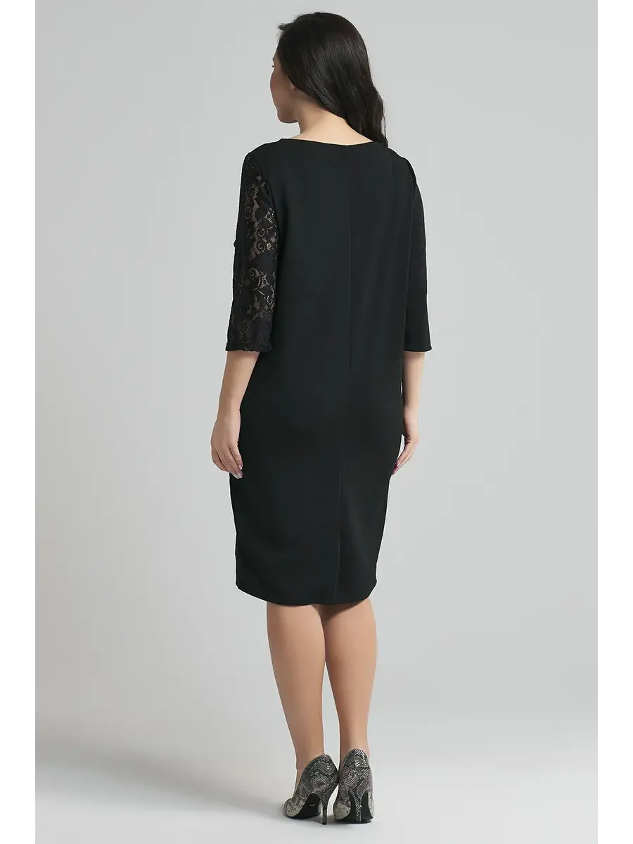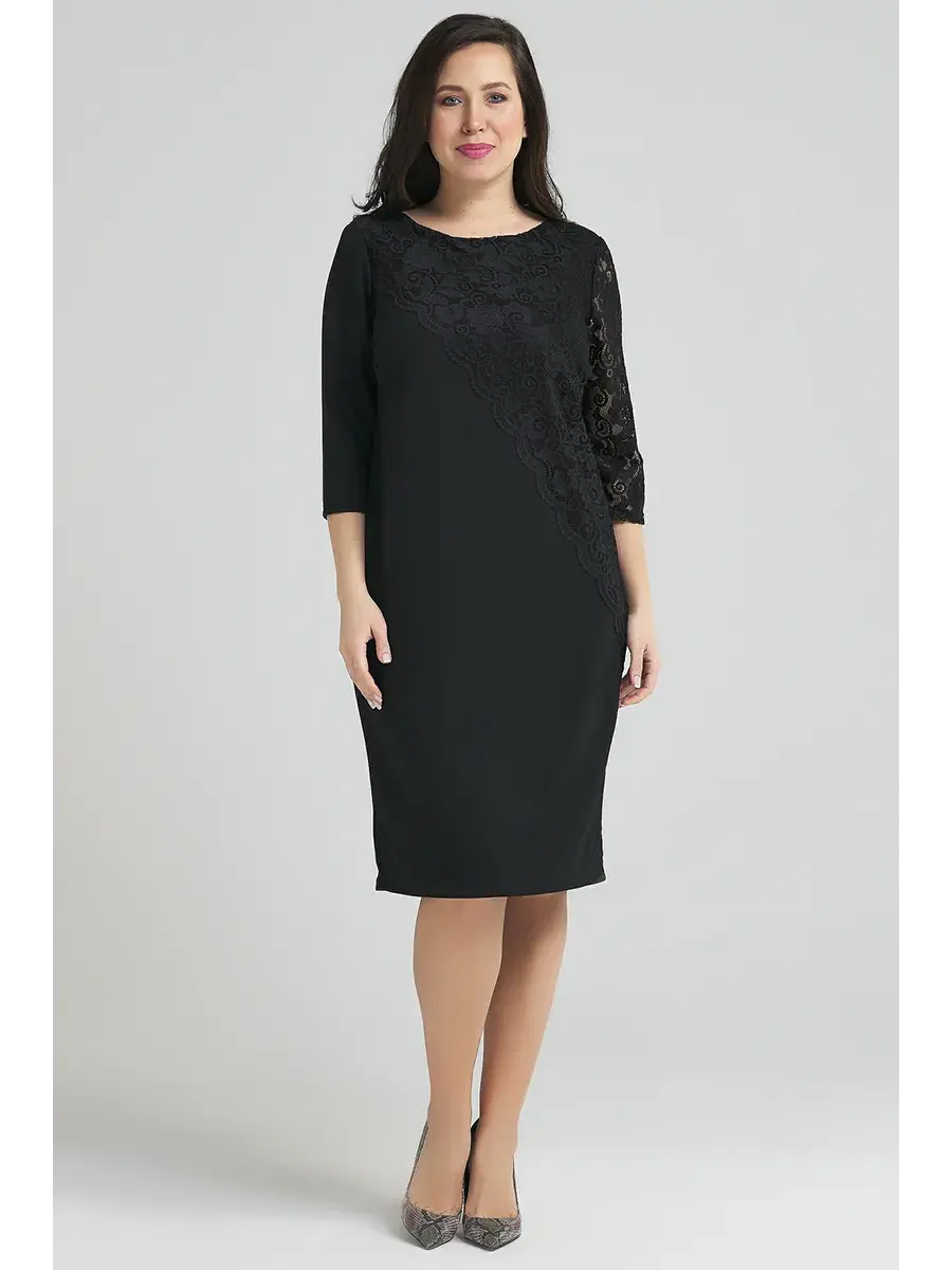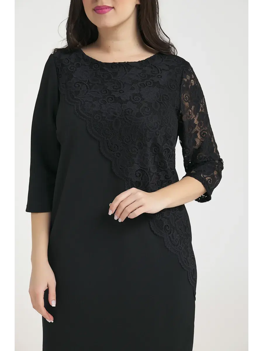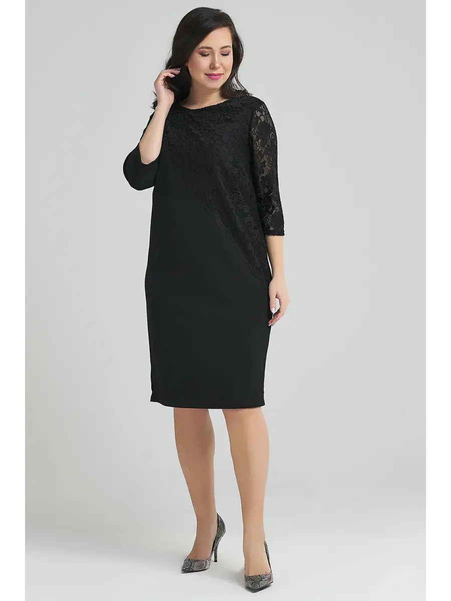 Элегантное и нарядное платье больших размеров от бренда OLSI прямого силуэта выполнено из трикотажного полотна, и декорировано гипюром. Модель длиной до колен, с рукавом 3/4. платье для полных женщин.