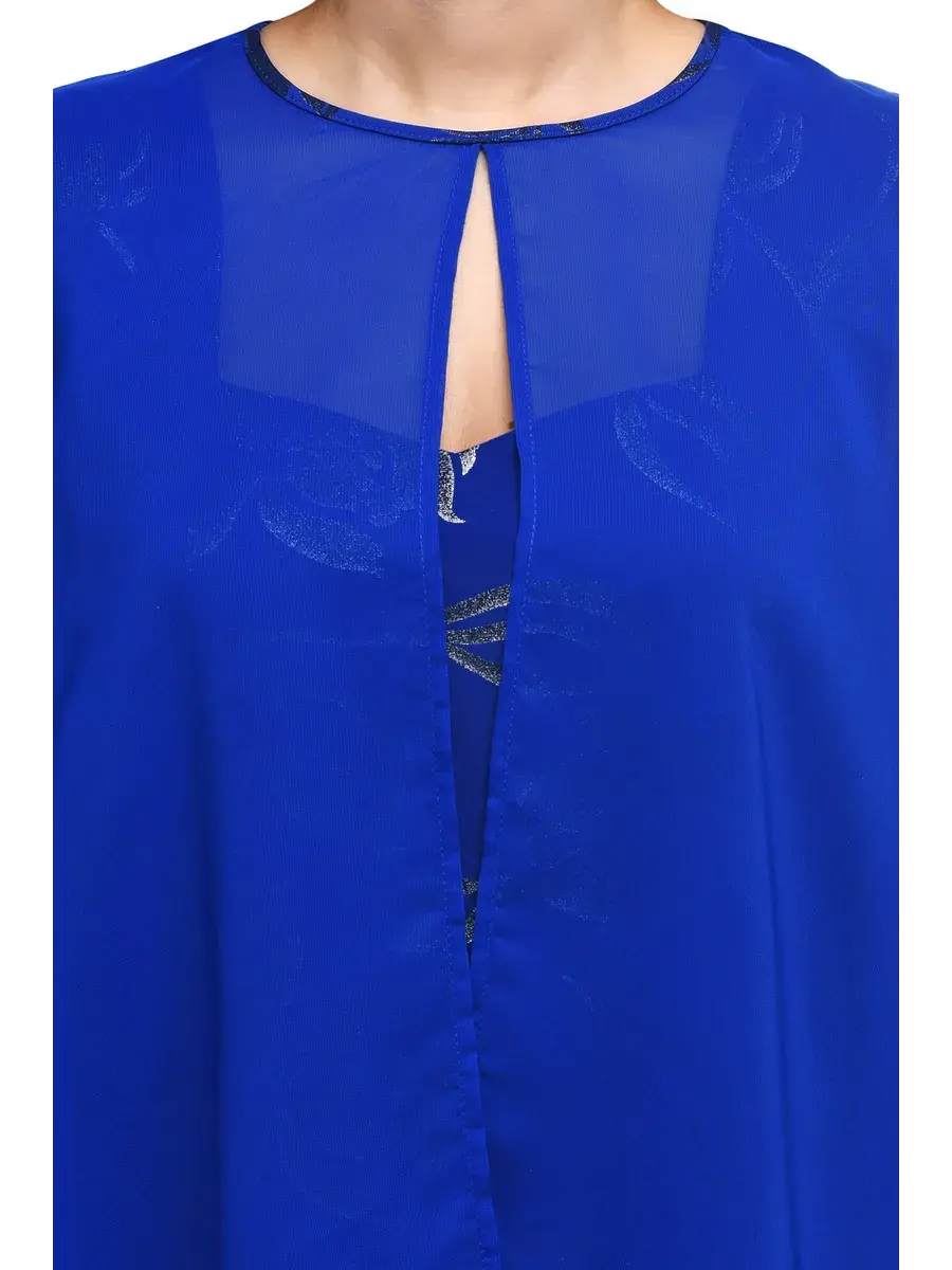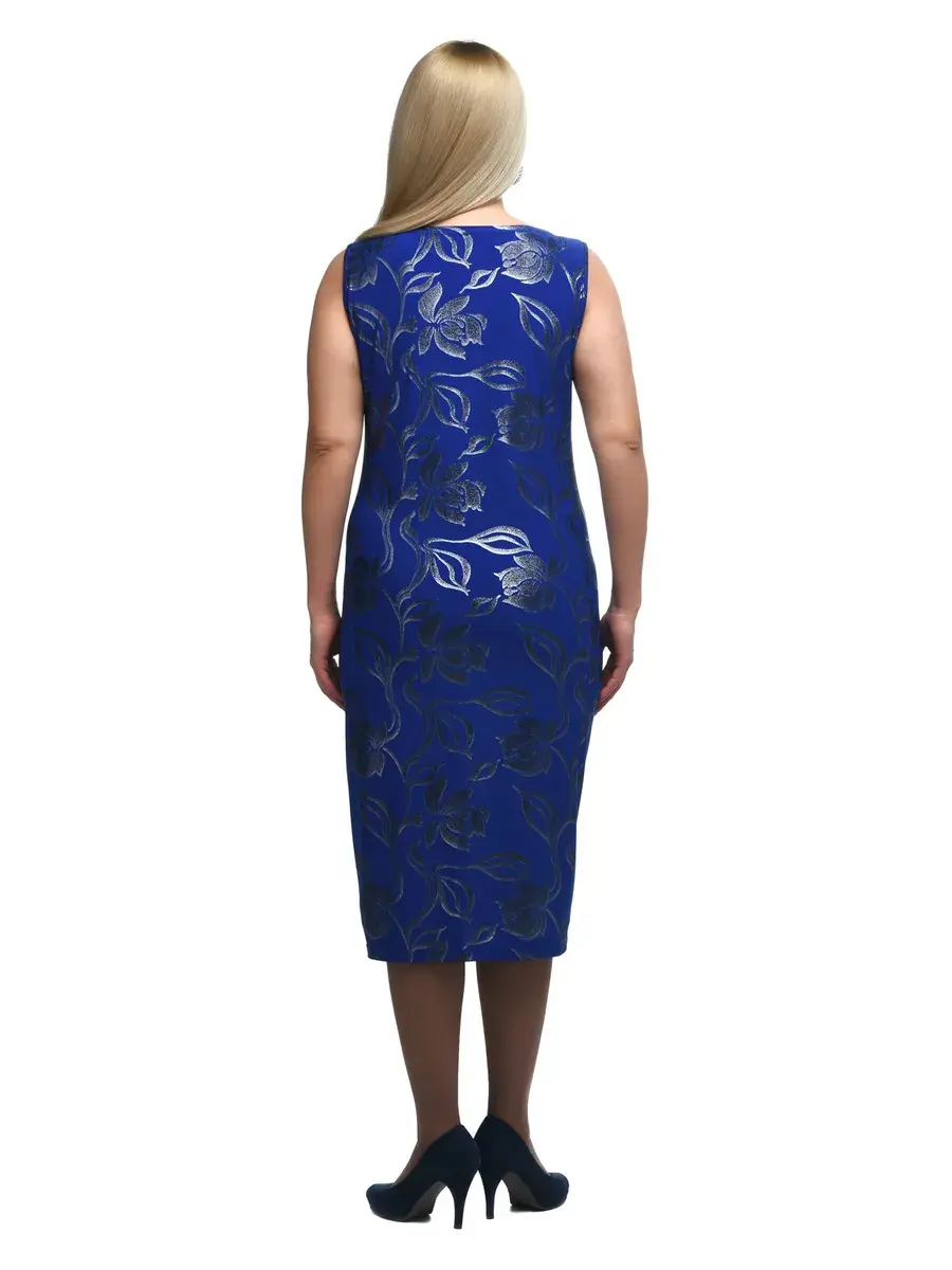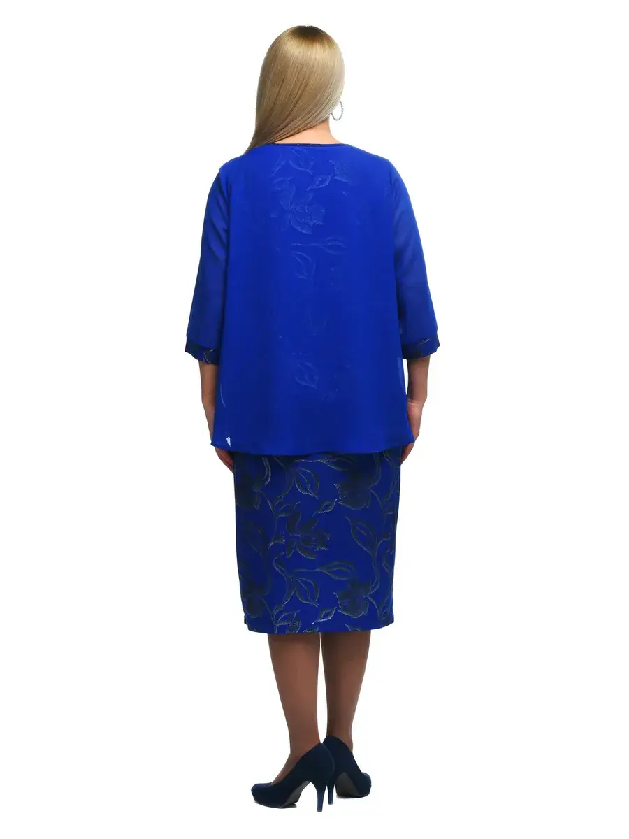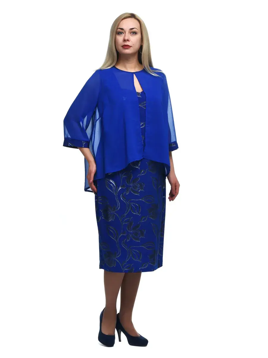 Нарядный комплект двойка для женщин состоит из сарафана и накидки из шифона. Платье без рукавов на широких бретелях выполнен из трикотажного полотна по типу масло с блестящим принтом-фойлом 90% полиэстер, 10% эластан. Несмотря на синтетический состав материала, он очень полюбился нашим постоянным покупателя: приятный, шелковистый к телу, комфортен в жару, не мнется, и не требует глажки. Накидка в форме свободной блузки без застежки из полупрозрачного однотонного шифона 100% полиэстер. Женский костюм двойка больших размеров на праздничное мероприятие