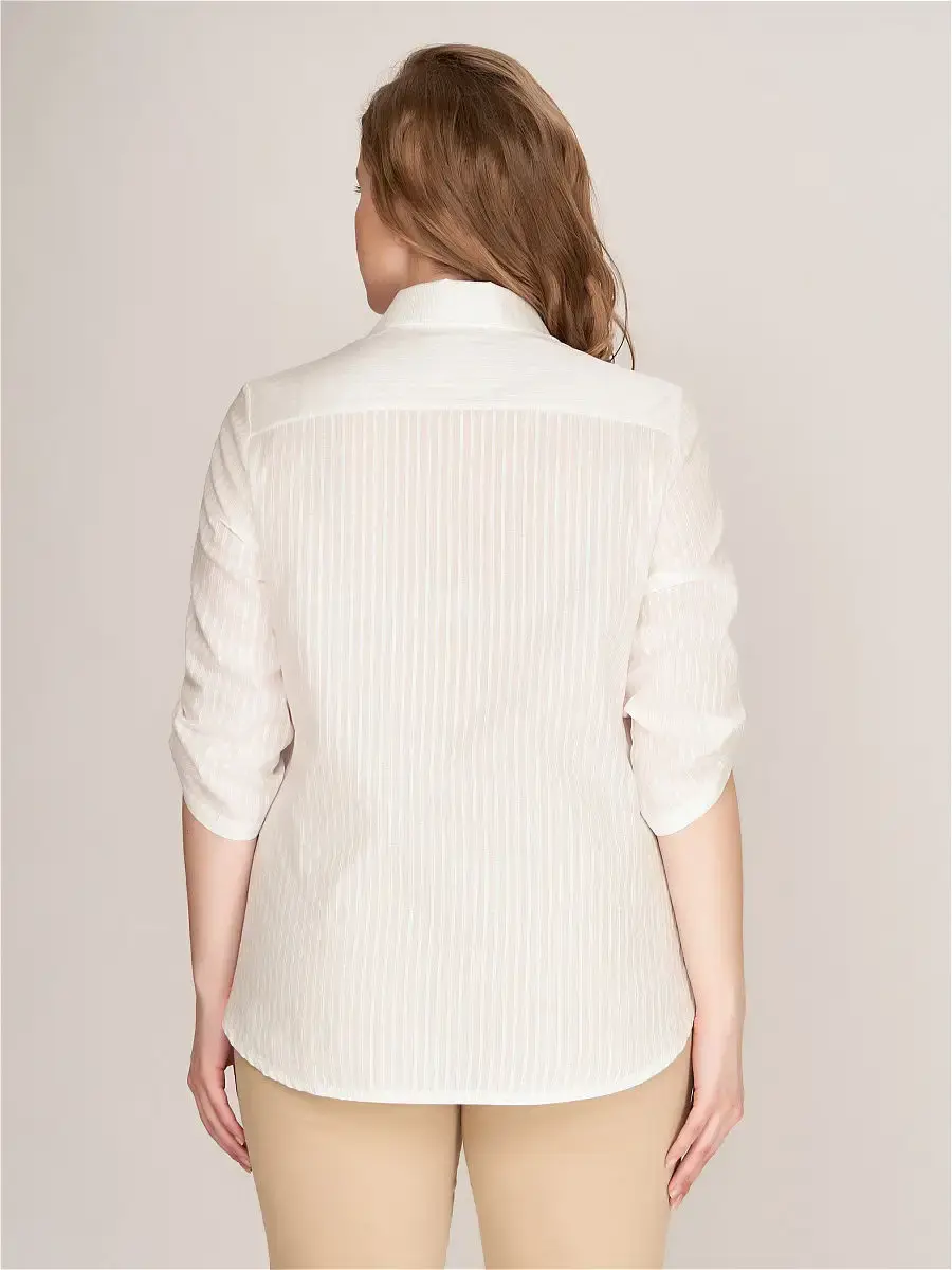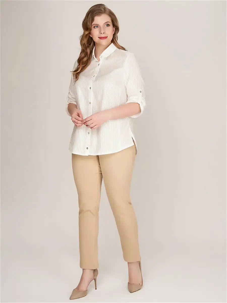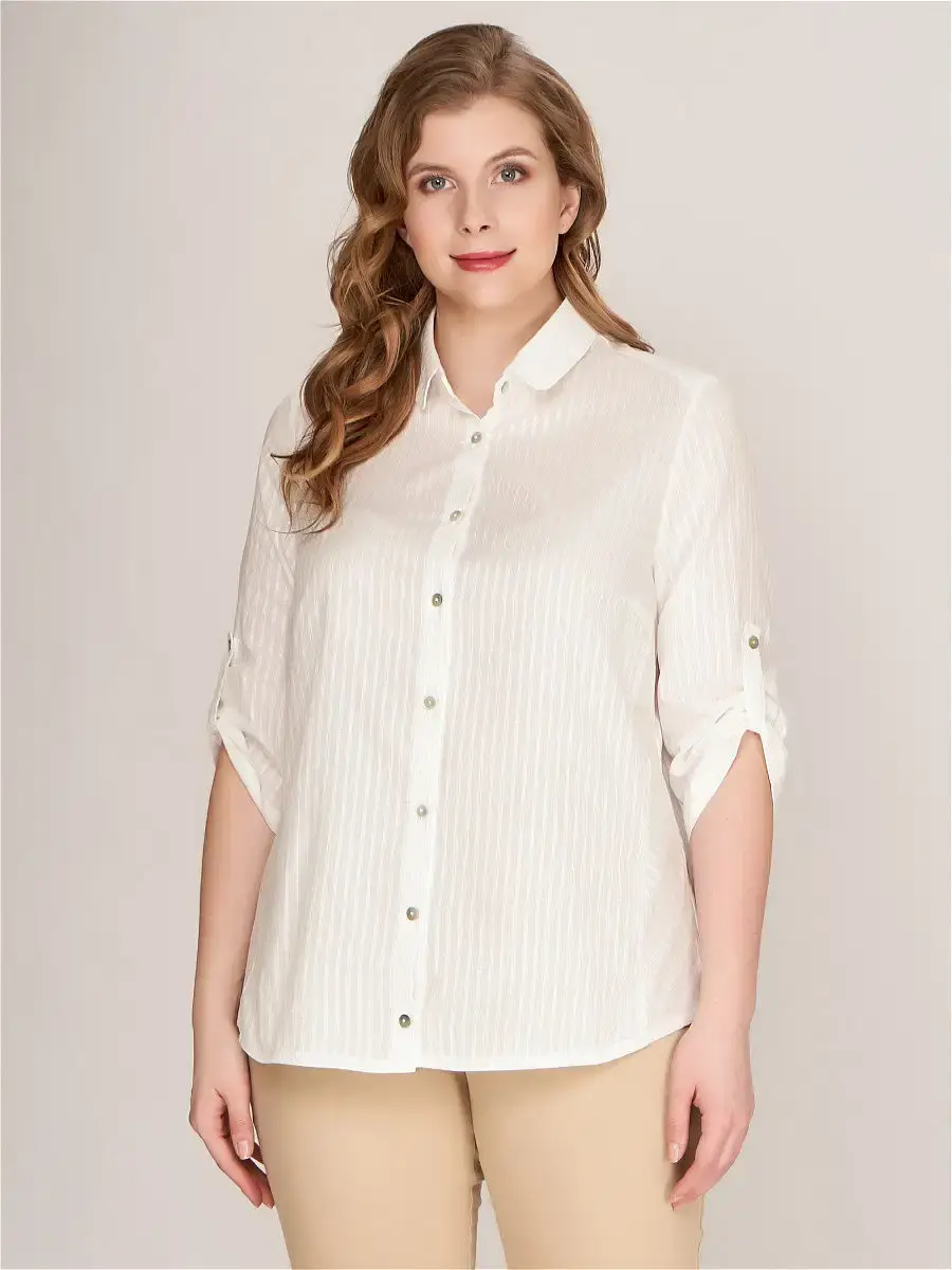 Классическая блуза-рубашка в блестящую вертикальную полоску, прямого кроя с закругленным низом. Изюминка этой строгой офисной униформы – рукава на патах с пуговицей, соблазнительно открывающие запястья и напоминающие, что работать, закатав рукава, можно не теряя женственности и легкости. Блуза выполнена из дышащей хлопковой ткани, в ней будет комфортно и на прогулке и в офисе. Длина изделия по спинке от 70см в р.48 до 75,5см в р.70, длина рукава 44,5см, длина рукава в застёгнутом виде примерно 34,5см.