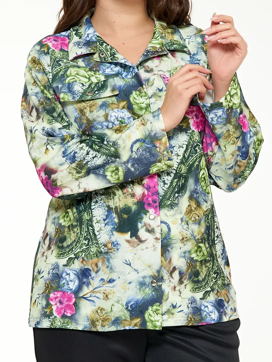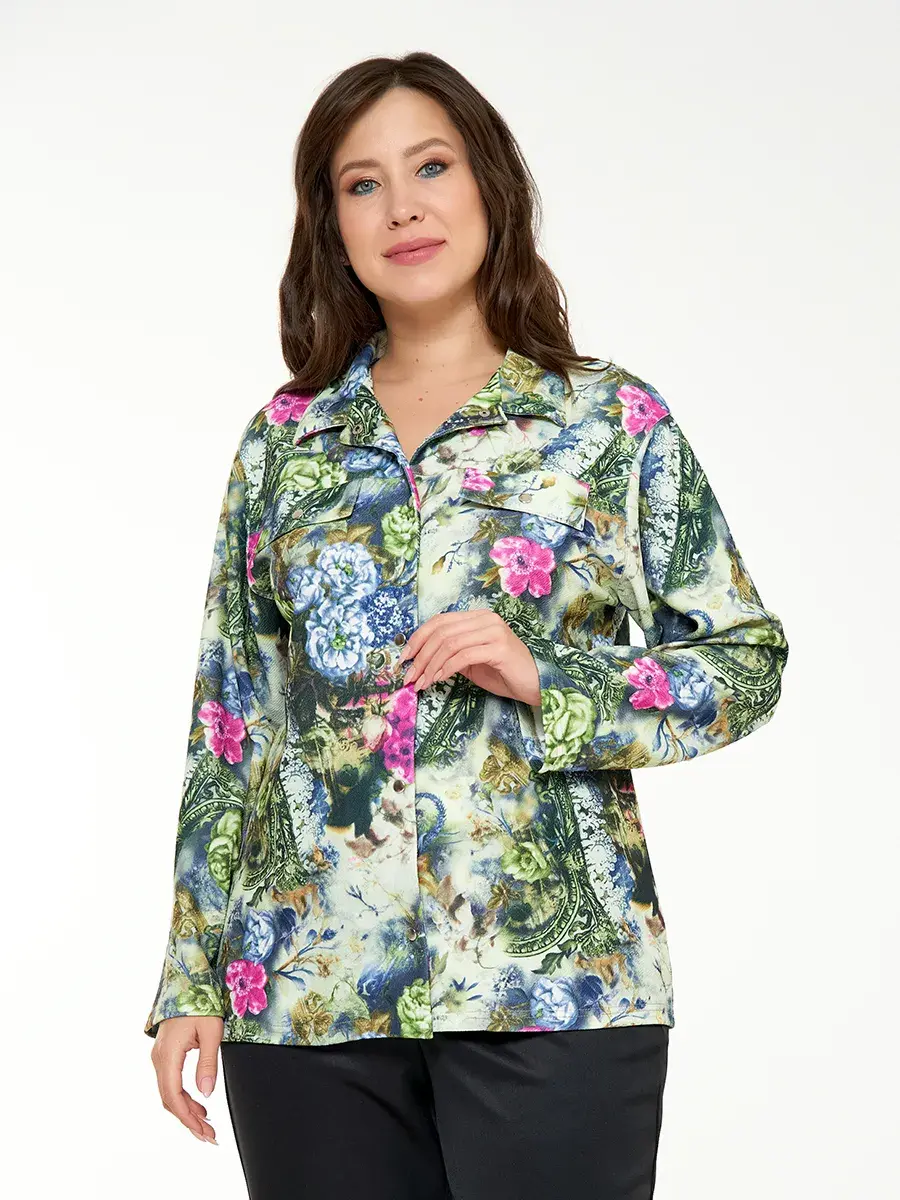 Повседневная блузка-рубашка больших размеров от бренда OLSI прямого кроя с длинным рукавом, застёгивается на кнопки. Модель с отложным воротником, спереди декорирована клапанами карманов. Выполнена из трикотажного полотна со стрейчем. Рубашку ветровку можно носить поверх другой одежды или как отдельный предмет гардероба.
