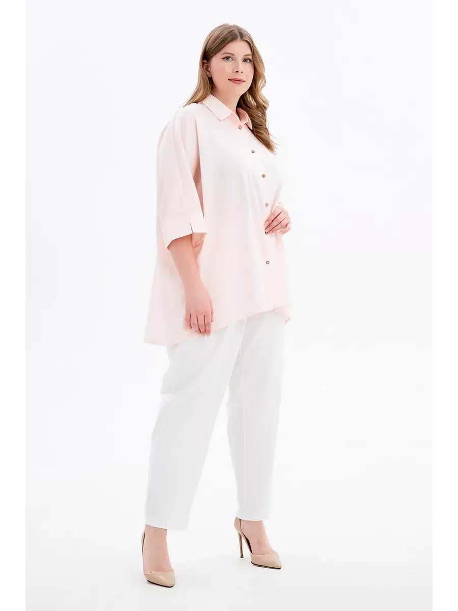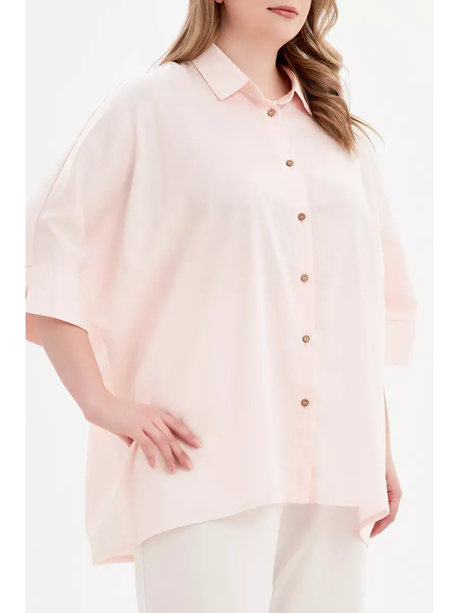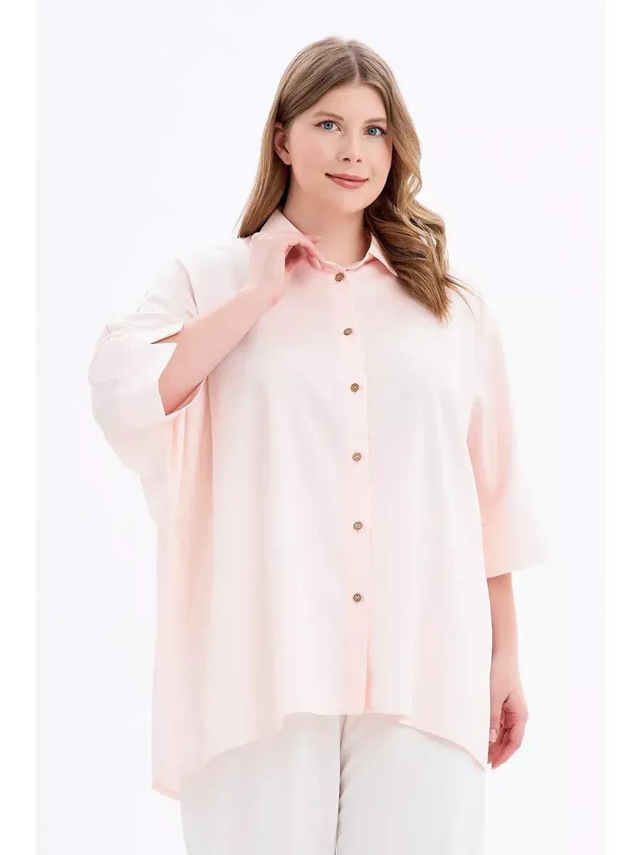 Стильная блузка-рубашка из текстильного полотна приятного на ощупь, с рукавами 3/4 на манжете с разрезом, воротником и застежкой на планке. Свободный крой и спинка на кокетке со складкой бабочкой позволяют легко и свободно двигаться, скрывают несовершенства линий. Модель придает образу раскованность и оригинальность. Длина по спинке/ширина по груди/ширина низ соответственно:р.48-52 80см/78,0см/78,0смр.54-58 81,5см/84,4см/84,4смр.60-64 83см/90,7см/90,7смр.66-70 84,5см/97,0см/97,0см
