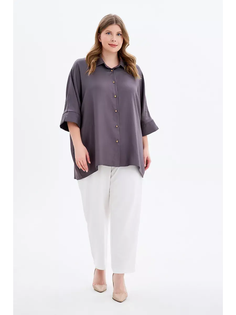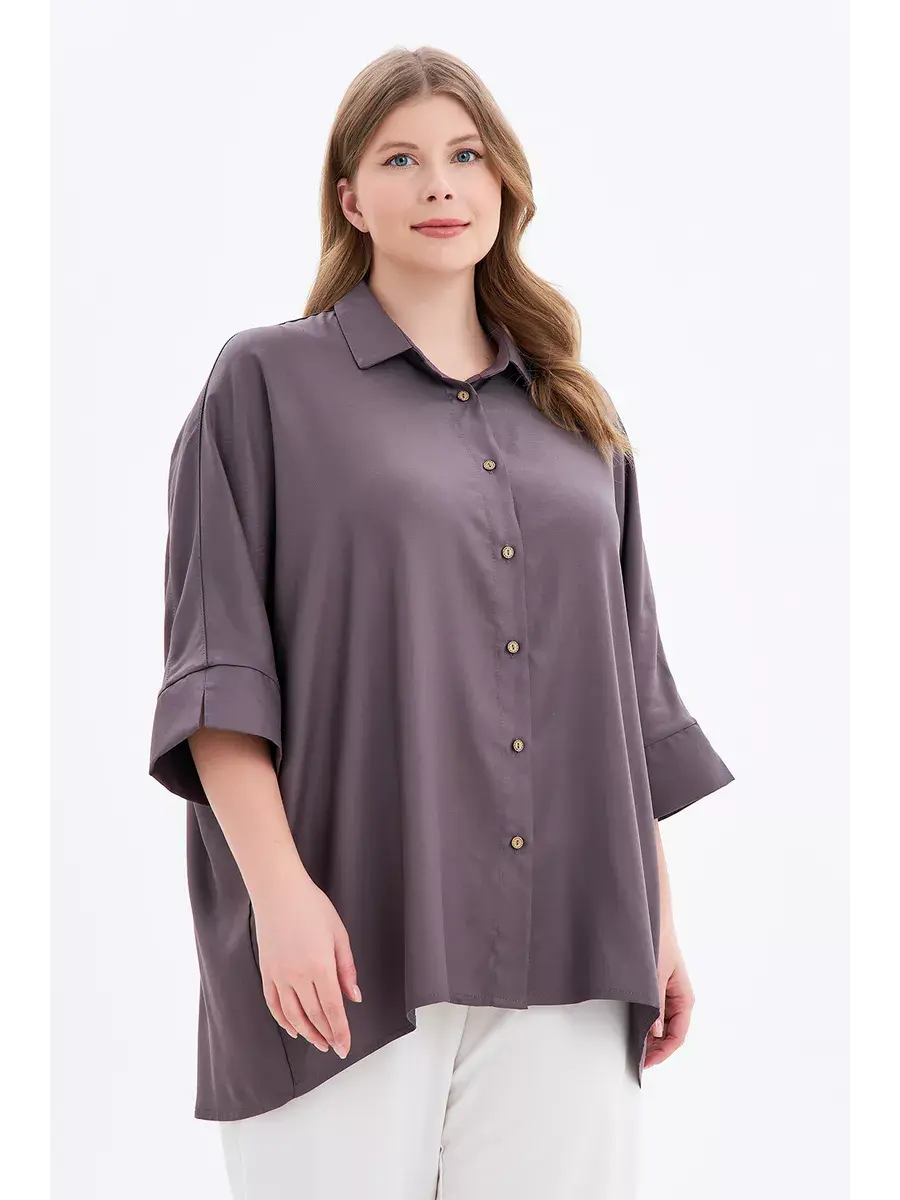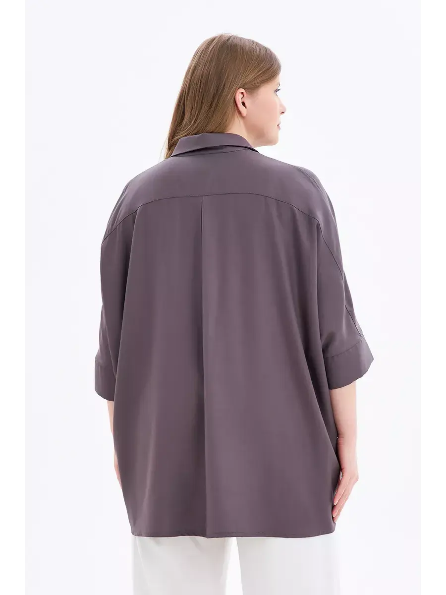Стильная блузка-рубашка из текстильного полотна приятного на ощупь, с рукавами 3/4 на манжете с разрезом, воротником и застежкой на планке. Свободный крой и спинка на кокетке со складкой бабочкой позволяют легко и свободно двигаться, скрывают несовершенства линий. Модель придает образу раскованность и оригинальность. Длина по спинке/ширина по груди/ширина низ соответственно:р.48-52 80см/78,0см/78,0смр.54-58 81,5см/84,4см/84,4смр.60-64 83см/90,7см/90,7смр.66-70 84,5см/97,0см/97,0см