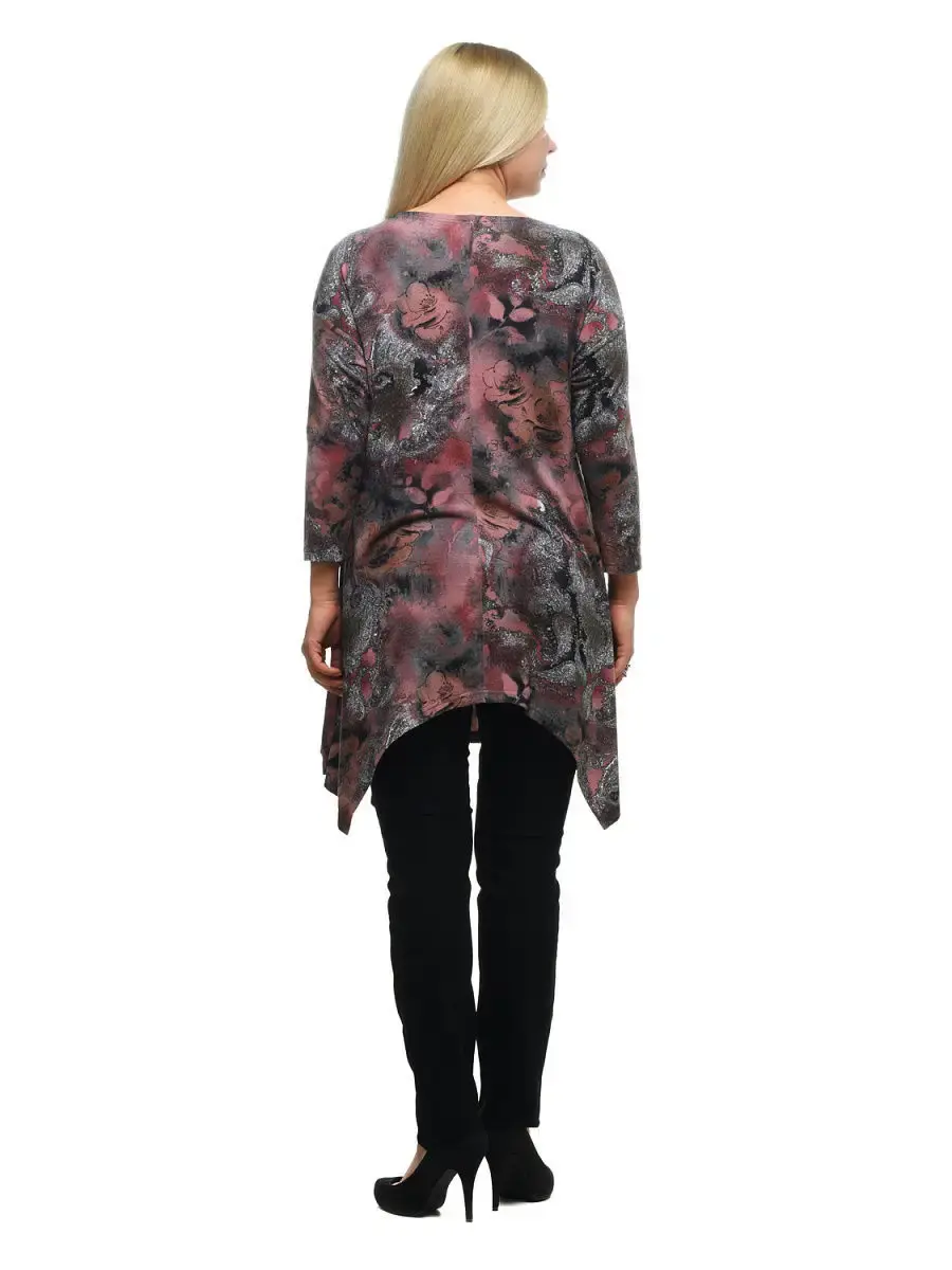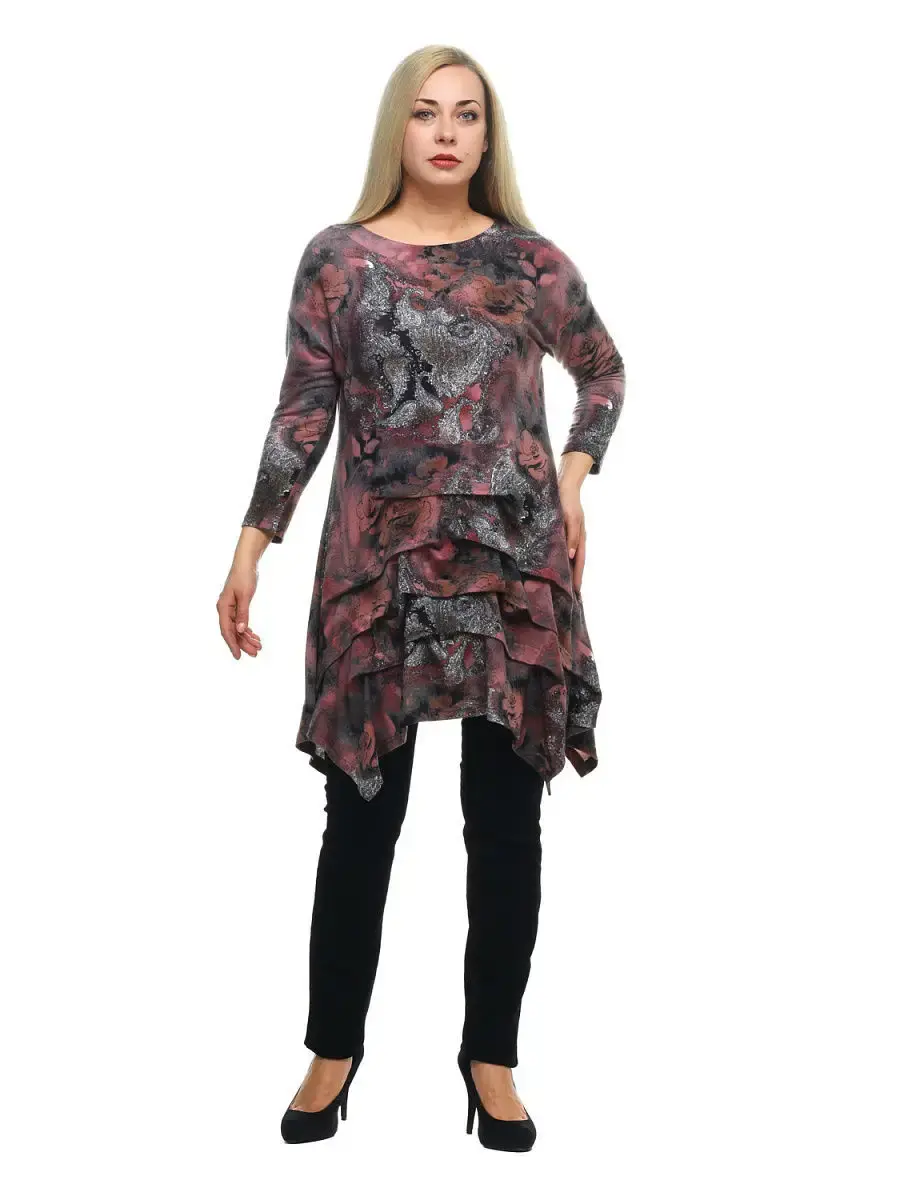 Эффектная туника из тонкого «дышащего» трикотажа с вискозой, с градиентным абстрактным принтом. Изделие A-силуэта; отрезными рукавами длиной 3/4 со спущенным плечом; с вырезом горловины лодочка; асиметричным «рваным» низом. Крой юбки спереди многоярусный, с псевдо воланами. Модель визуально удлиняет ноги, вуалирует объемы, делает фигуру легче и грациознее. Подойдет жизнерадостным романтичным натурам, ценящим комфорт. Длина изделия по спинке/длина рукава соответственно:р.48-79,0см/38,2смр.50-79,5см/38,0смр.52-80,0см/37,9смр.54-80,5см/37,7смр.56-81,0см/37,6смр.58-81,5см/37,4смр.60-82,0см/37,3смр.62-82,5см/37,1смр.64-83,0см/37,0смр.66-83,5см/36,8смр.68-84,0см/36,7смр.70-84,5см/36,5см