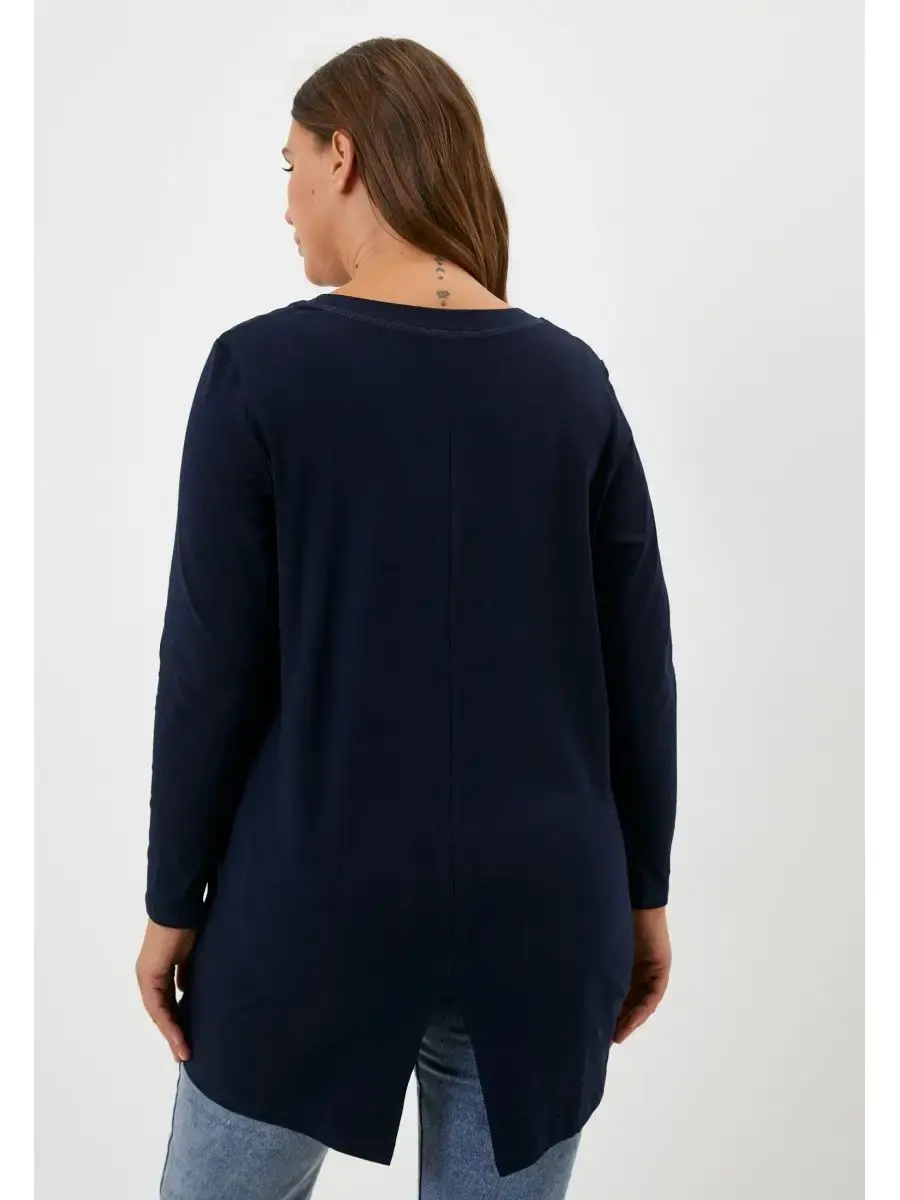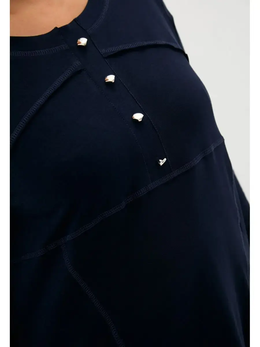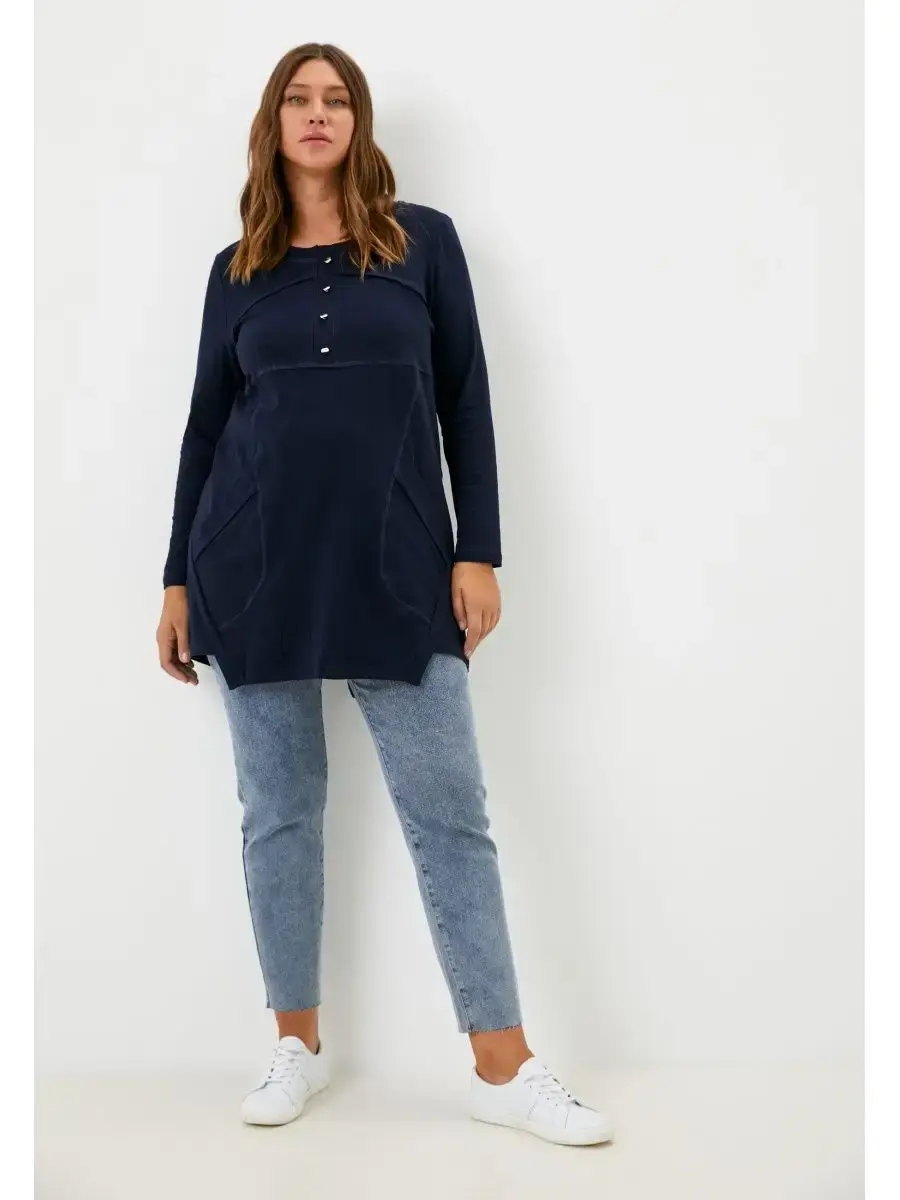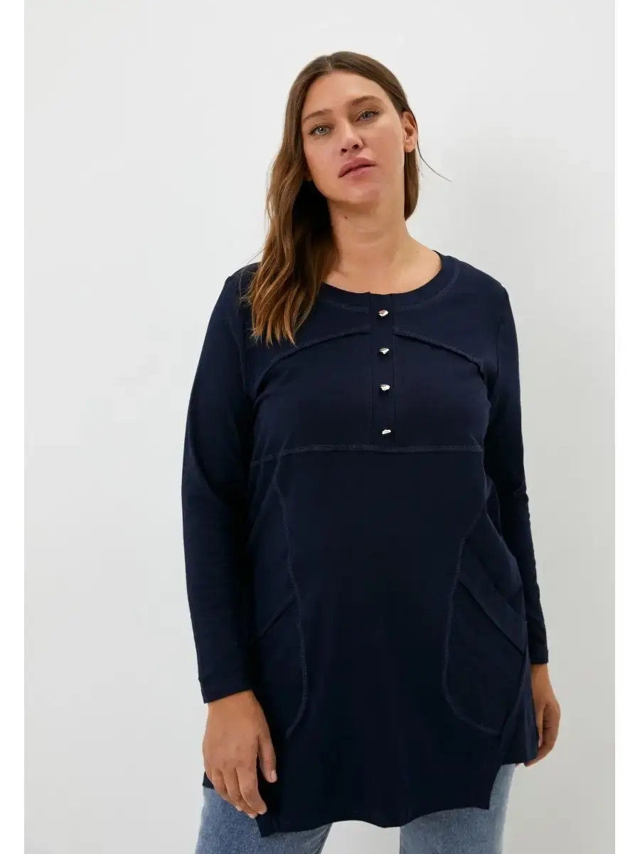 Стильная туника из шелковистого трикотажа, с округлым вырезом горловины, псевдо-застежка до середины груди на золотистых пуговицах-бусинах. Модель на кокетке-арка, отрезная под грудью, с крупными прорезными карманами с листочкой и декоративной прошивкой-зигзагом. Спинка изделия закругленная, с треугольным вырезом внизу. Ассиметричный «рваный» крой и демонстративная обработка деталей двухниточным швом, придает образу независимость и дерзость.