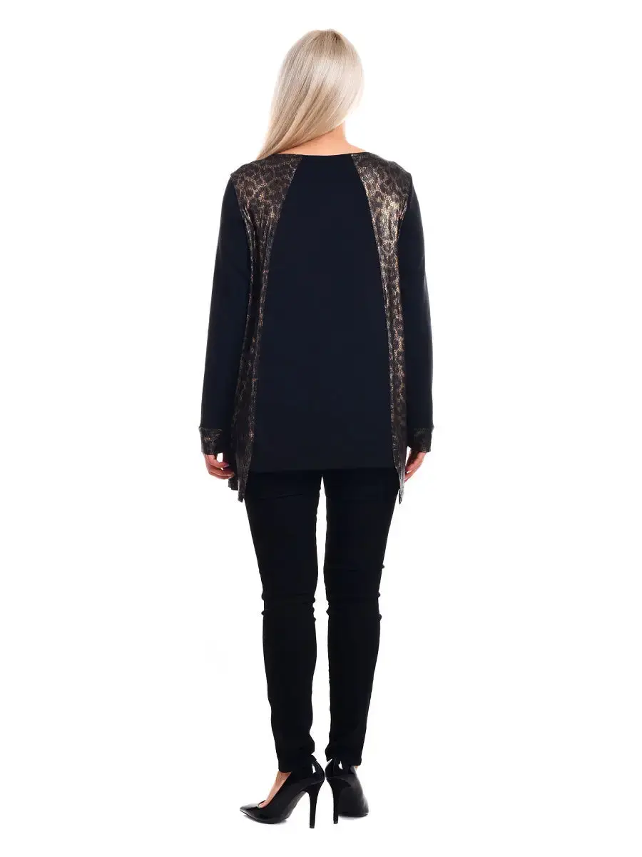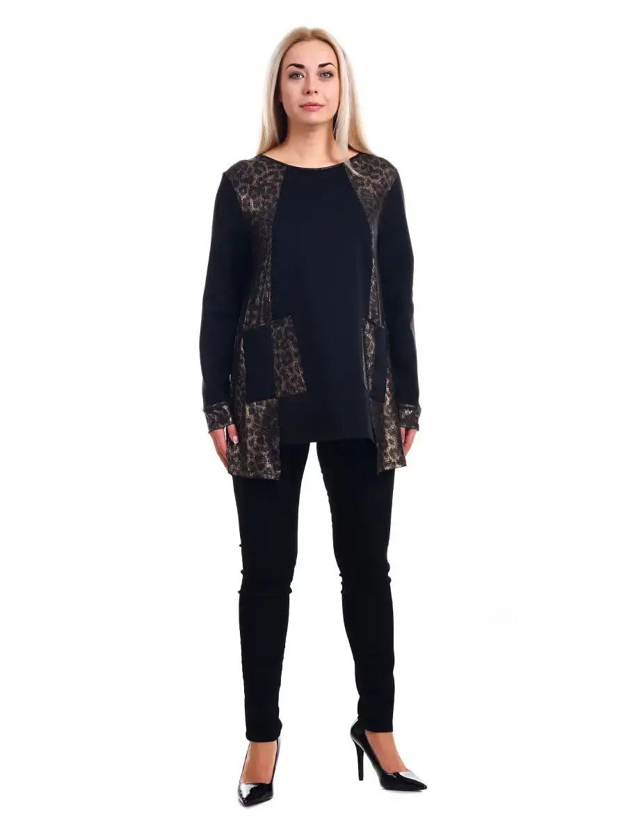 Эффектная стильная туника из однотонного матового трикотажа и ткани с перламутровым принтом. Модель имитирует длинный блестящий жилет без застежки, прикрывающий бедра, надетый поверх прямой чуть укороченной блузы с вырезом горловины лодочка;длинными втачными рукавами с манжетами, повторяющими блеск жилета, и декора квадратных накладных карманов. По спинке изделие выполнено в провокационном тренде: эффект не застегнутой блузы, надетой задом наперед.Длина по спинке: от 71 см до 76,5 см. Длина рукава 62 см.