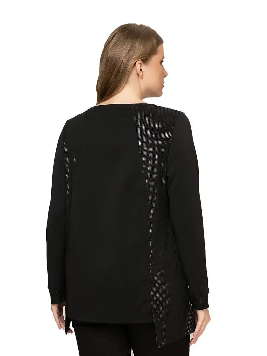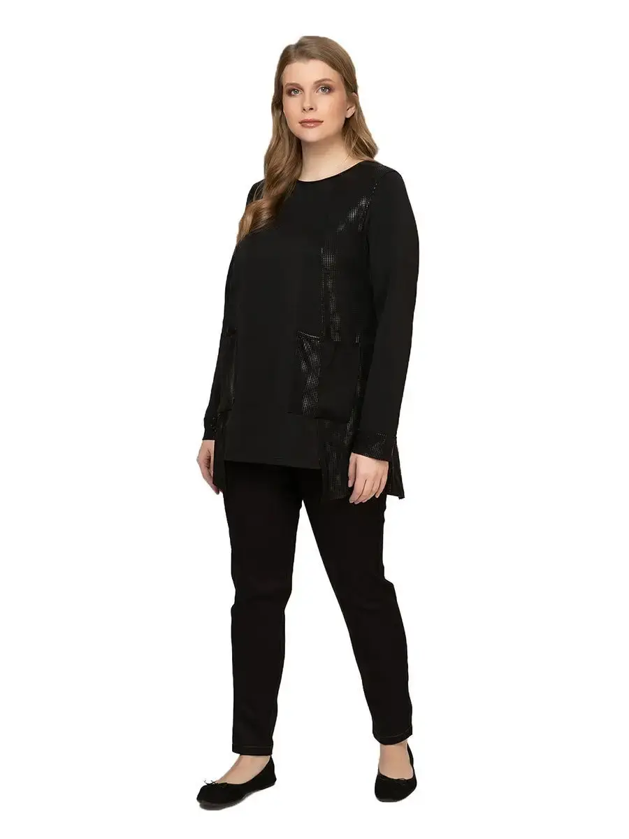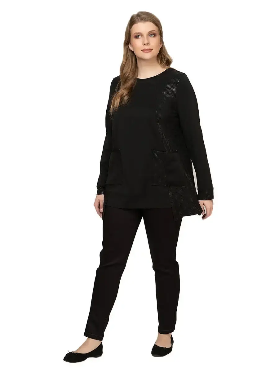 Эффектная стильная туника из однотонного матового трикотажа и ткани с перламутровым принтом. Модель имитирует длинный блестящий жилет без застежки, прикрывающий бедра, надетый поверх прямой чуть укороченной блузы с вырезом горловины лодочка;длинными втачными рукавами с манжетами, повторяющими блеск жилета, и декора квадратных накладных карманов. По спинке изделие выполнено в провокационном тренде: эффект не застегнутой блузы, надетой задом наперед.Длина по спинке: от 71 см до 76,5 см. Длина рукава 62 см.