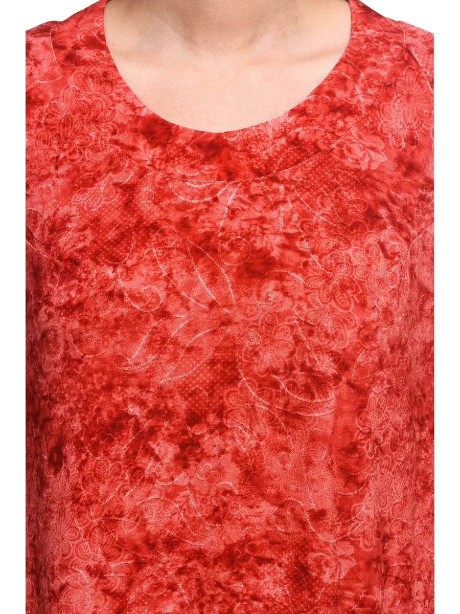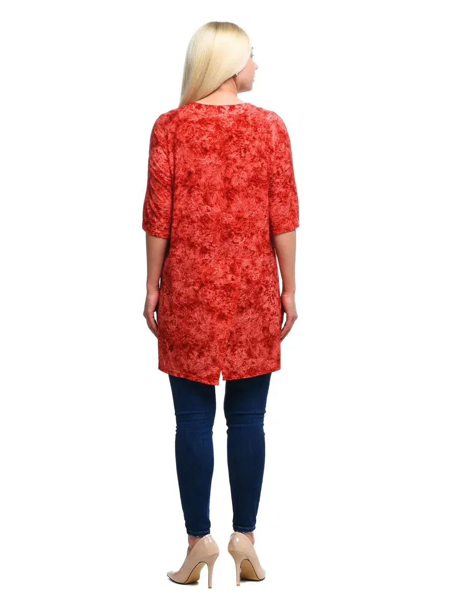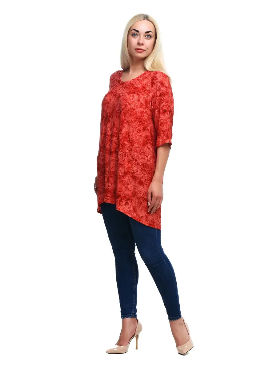 Стильная туника из мягкой ткани с рельефным контурным рисунком поверх мелкого цветочного принта. Модель полуприлегающего кроя, с глубоким круглым вырезом горловины, отделанным окантовкой; рукавами реглан длиной 3/4; с укороченным подолом аркой спереди; отрезная по бедрам, удлиненная, с вырезом-запахом снизу по спинке. Изделие визуально удлиняет ноги, нивелирует особенности фигуры. Прекрасный вариант для повседневного гардероба.