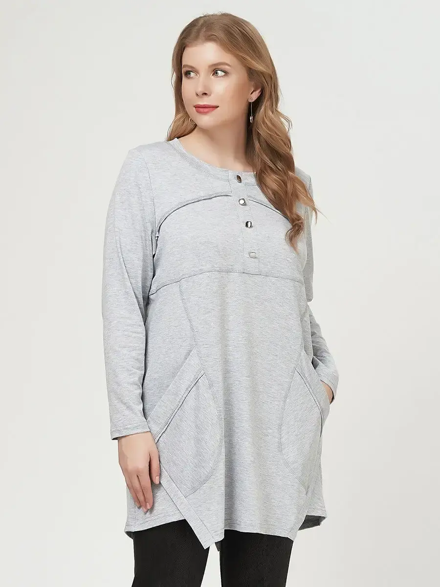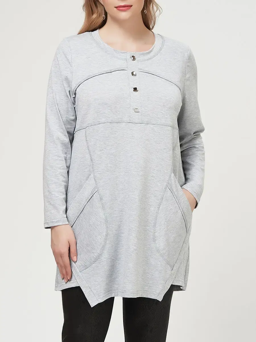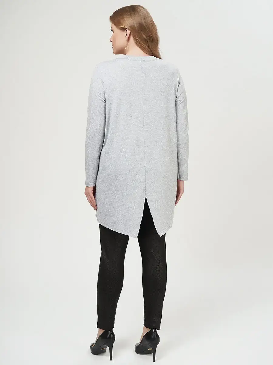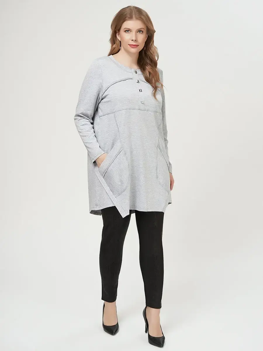 Стильная туника из шелковистого трикотажа, с округлым вырезом горловины, псевдо-застежка до середины груди на золотистых пуговицах-бусинах. Модель на кокетке-арка, отрезная под грудью, с крупными прорезными карманами с листочкой и декоративной прошивкой-зигзагом. Спинка изделия закругленная, с треугольным вырезом внизу. Ассиметричный «рваный» крой и демонстративная обработка деталей двухниточным швом, придает образу независимость и дерзость.