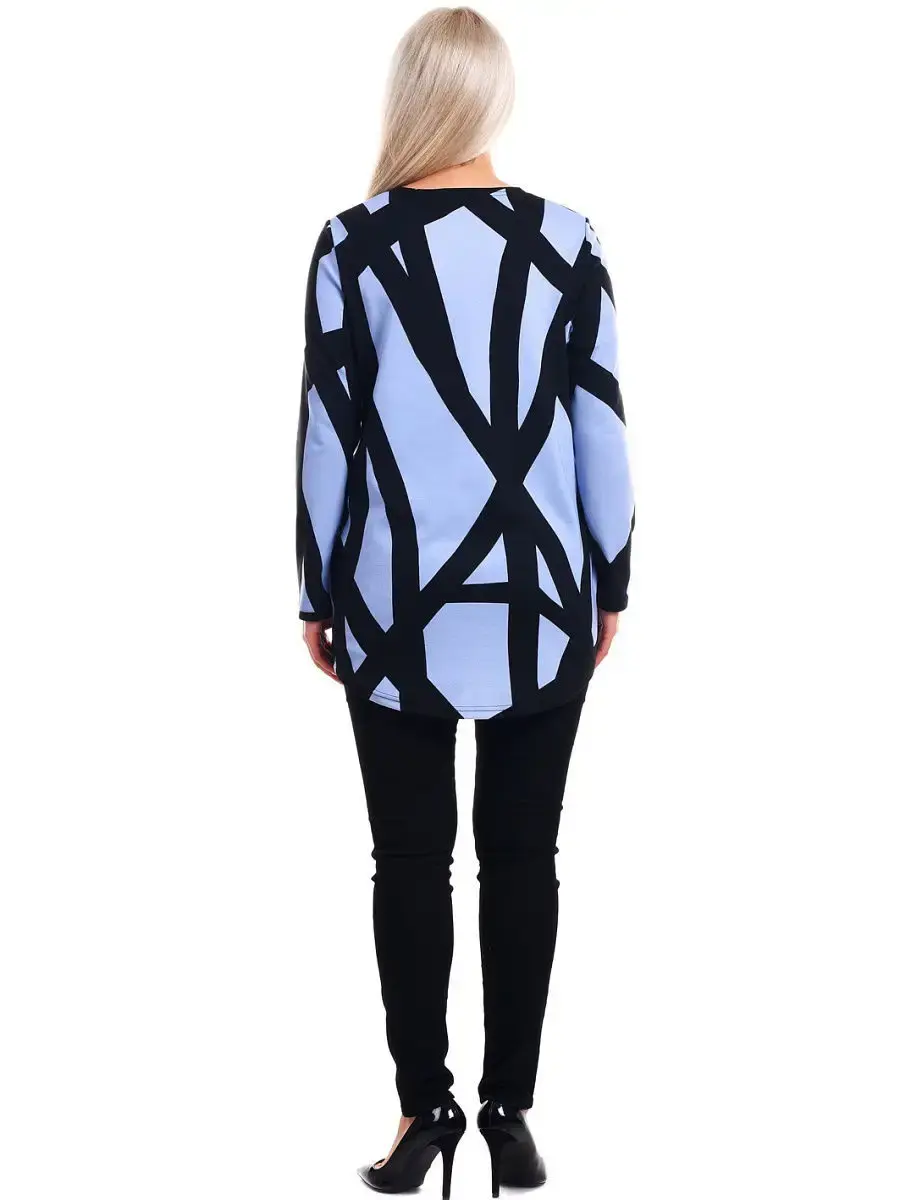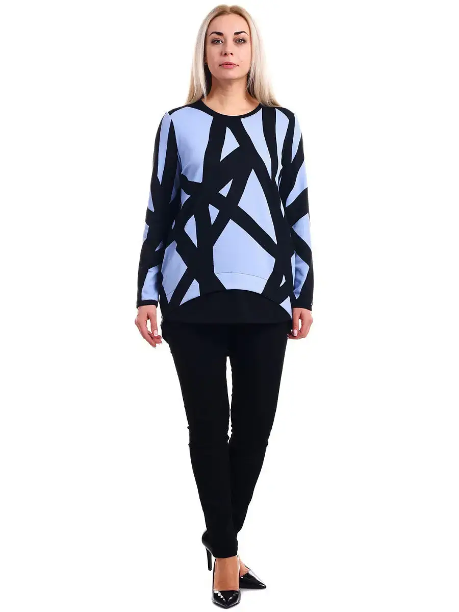 Эффектная туника из тонкого плотного трикотажа с абстрактным геометрическим принтом, в виде хаотично пересекающихся широких полос; с глубоким круглым вырезом горловины; длинными, зауженными книзу втачными рукавами; врезными боковыми карманами. Низ изделия закругленный. Подол спереди выполнен в виде дуги, с прямой вставкой из однотонного материала, имитирующей низ блузки, выглядывающей из-под джемпера, что придает образу нотки продуманной небрежности. Длина по спинке:р.48-82,5смр.50-83смр.52-83,5смр.54-84смр.56-84,5смр.58-85смр.60-85,5смр.62-86смр.64-86,5смр.66-87смр.68-87,5смр.70-88смДлина рукава 62см.