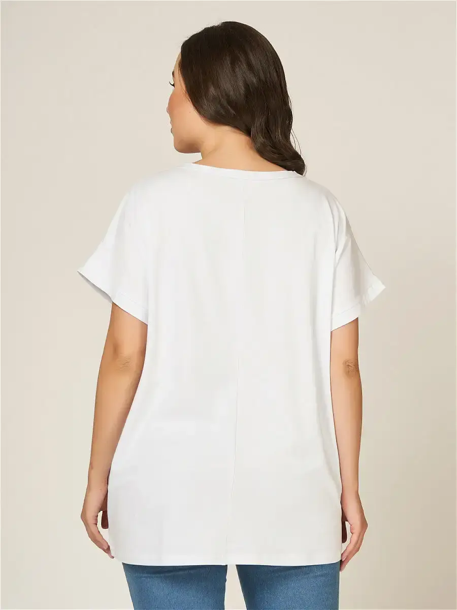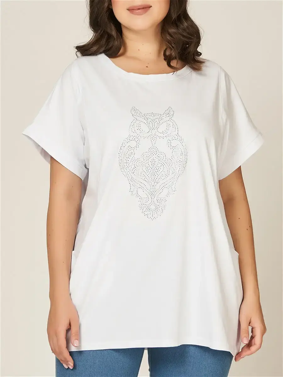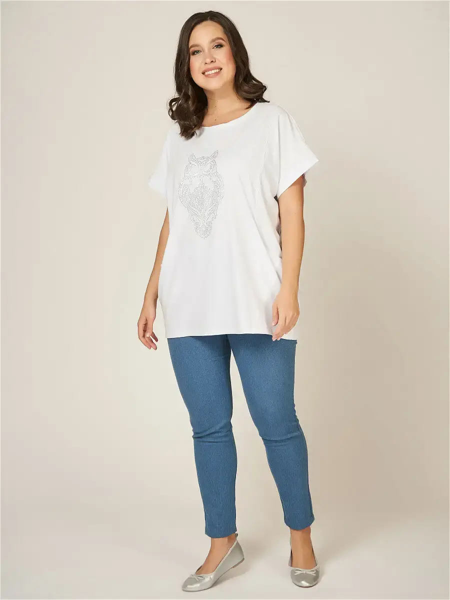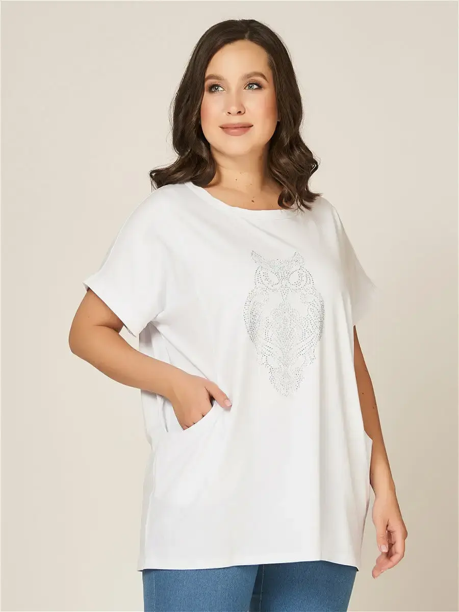 Эффектная туника из тонкого нежного хлопка с короткими свободными втачными рукавами; круглым вырезом горловины; втачными боковыми карманами. Спереди модель декорирована рисунком - совой, выложенной сверкающими стразами. Модель свободного кроя, не стесняет движения, конструктив изделия специально разработан для женщин с формами, поэтому можно быть уверенным, что в такой тунике будет легко и комфортно в любую жару. Длина по спинке:р.48-78,5смр.50-79смр.52-79,5смр.54-80смр.56-80,5смр.58-81смр.60-81,5смр.62-82смр.64-82,5смр.66-83смр.68-83,5смр.70-84смКороткий рукав.