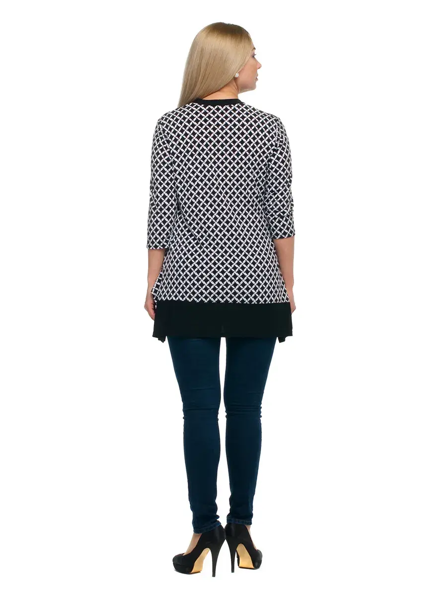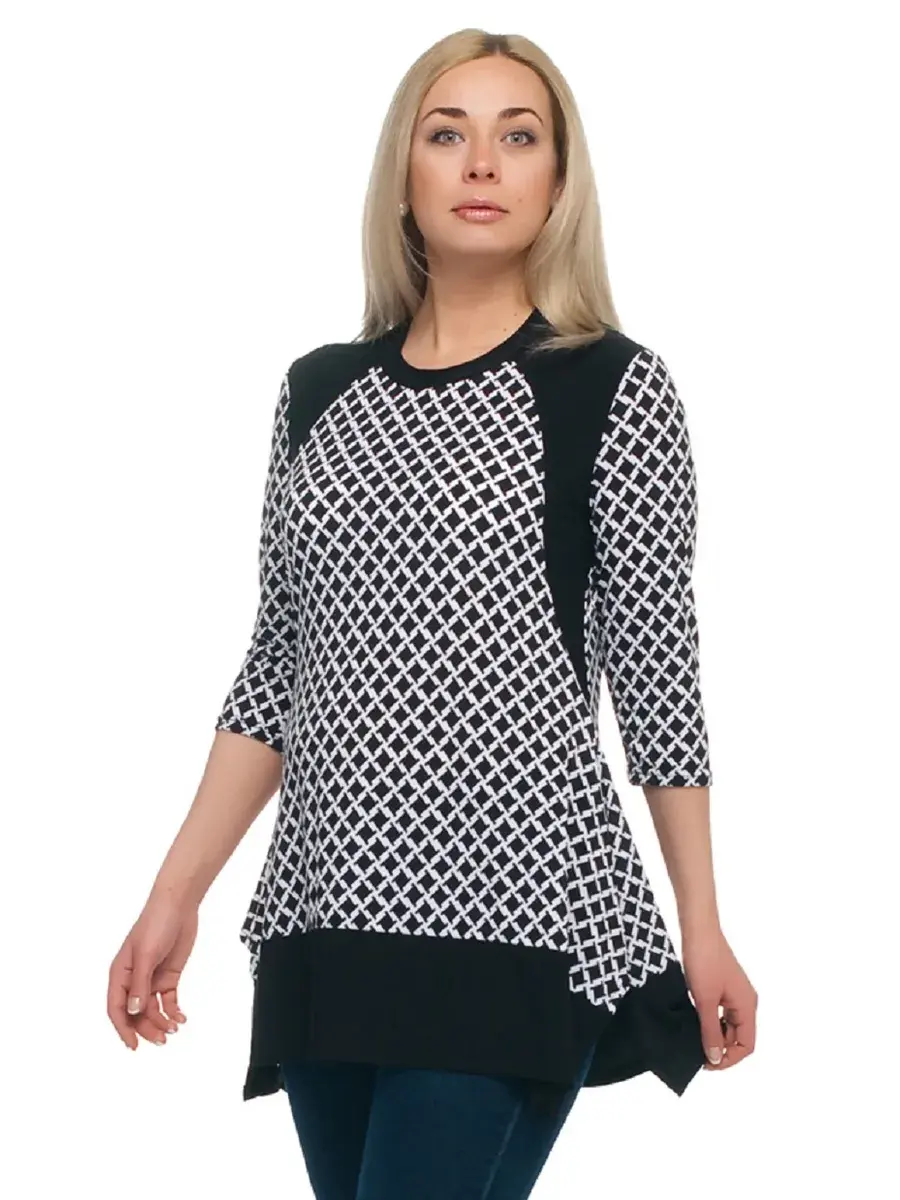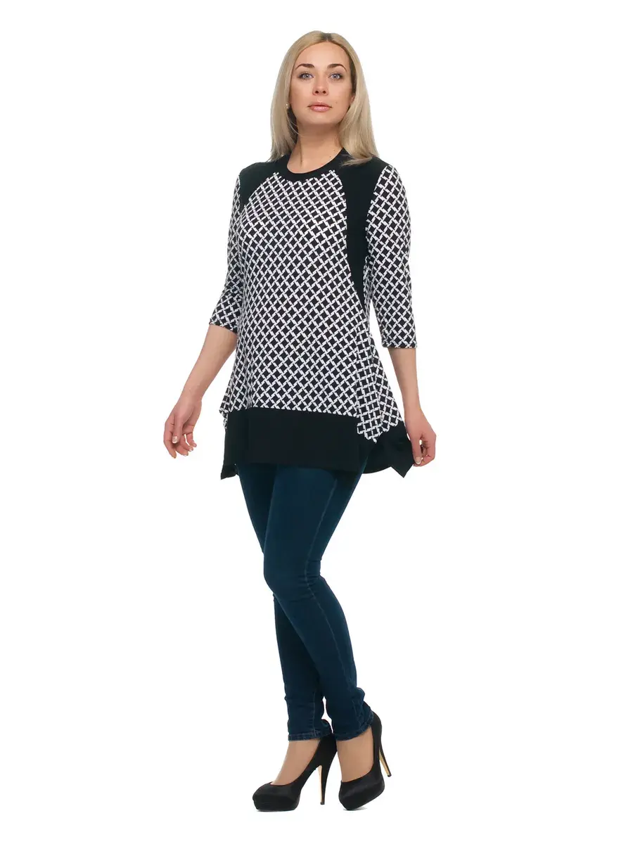 Чудесная стильная туника, выполненная в комбинации темного трикотажа и эластичной ткани с принтом собачий зуб. Модель A-силуэта, расклешенная книзу, с разрезами по бокам; втачными рукавами длиной 3/4; круглым вырезом горловины с однотонной окантовкой, рифмующейся с полосой на подоле и угловыми вставками от плеча, придающими четкость и характерность линиям. Туника корректирует особенности фигуры, не нарушая пропорций, придает образу легкость и жизнерадостность.