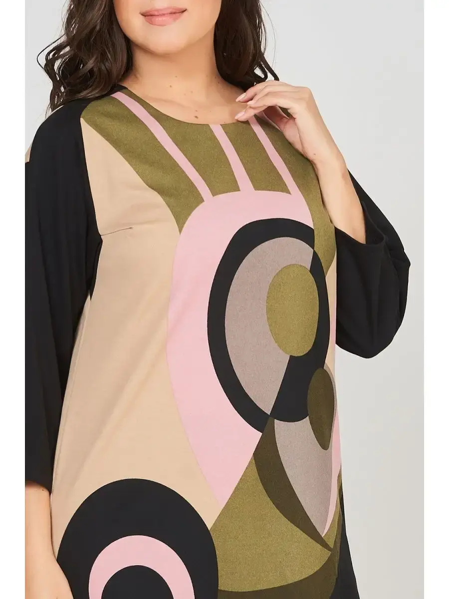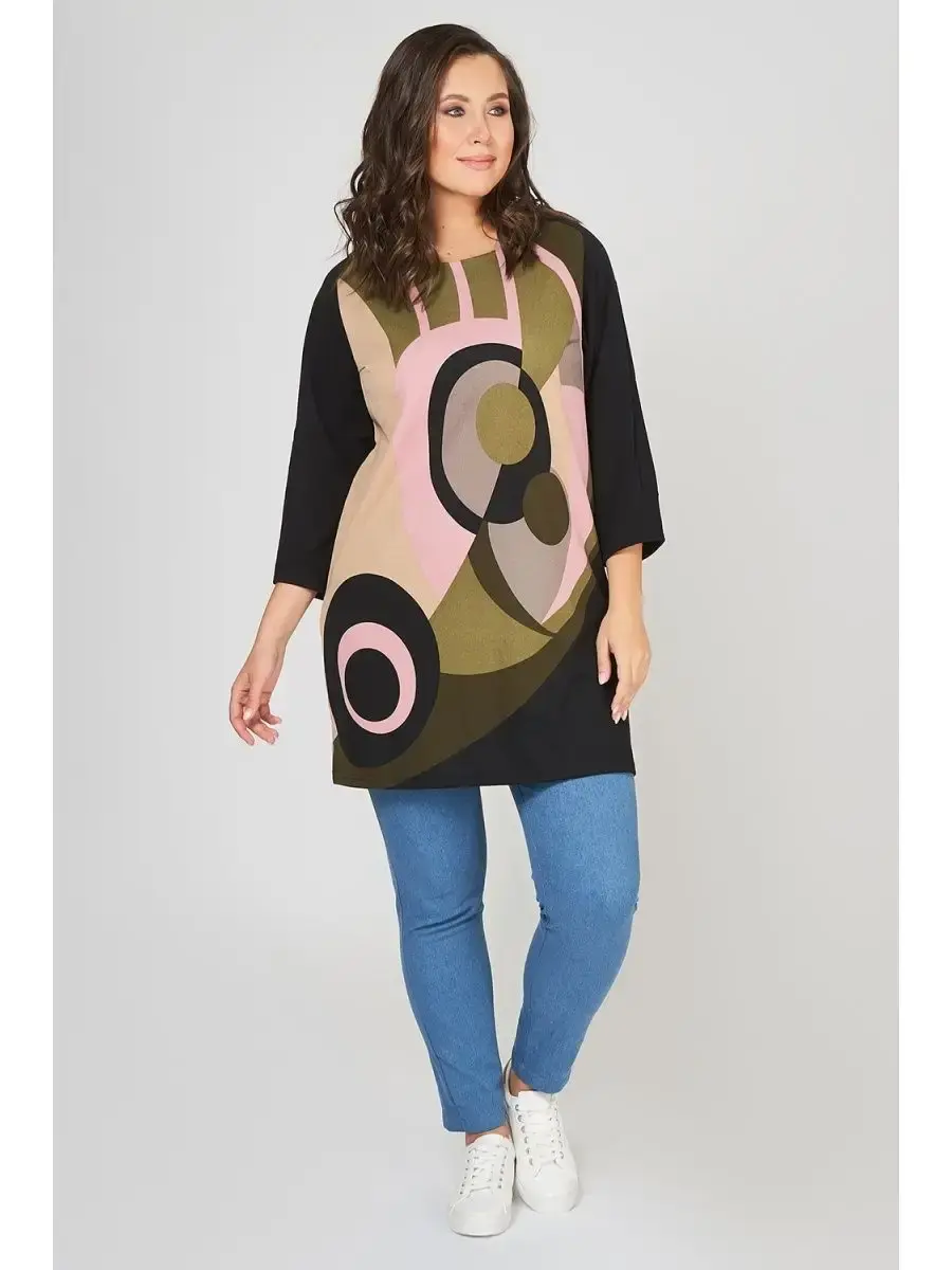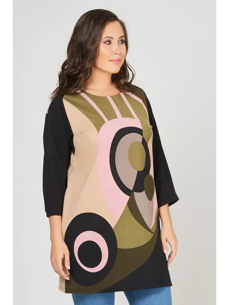 Стильная туника из тонкого трикотажа с геометрическим принтом в стилистике авангардизма начала прошлого века. Модель лаконичного кроя; с округлым вырезом горловины; втачными широкими рукавами со спущенной проймой, длиной 3/4, присобранные узкими манжетами. Низ туники закругленный сзади. Основной акцент в изделии на рисунке, - вертикальные произвольные полосы по спинке вытягивают силуэт, придают эффект прилегания. Геометрия спереди вуалирует несовершенство форм.