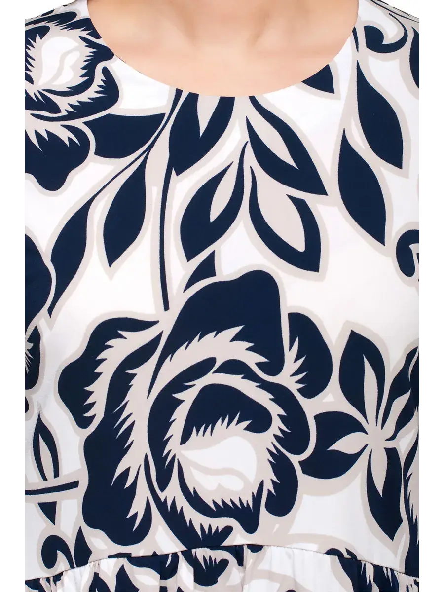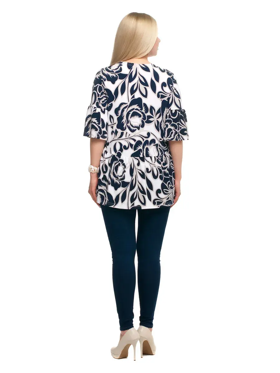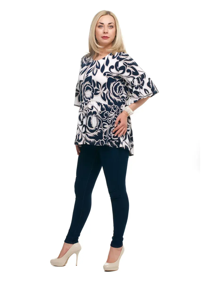 Эффектная стильная туника из тонкой ткани с монохромным цветочным принтом, выполненная в стилистике беби-дол. Модель свободного кроя; отрезная, с оборкой. С чуть «вздернутой» талией спереди и заниженной сзади. С глубоким круглым вырезом горловины; широкими втачными рукавами с воланами. Изделие придает фигуре невесомость, вуалирует ее особенности, подчеркивает плавность и легкость движений. Привносит в образ игривое очарование, кокетство и беззаботность.