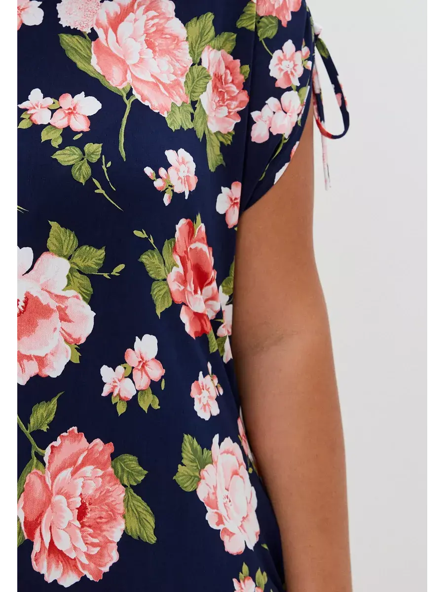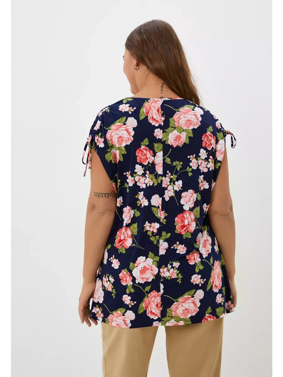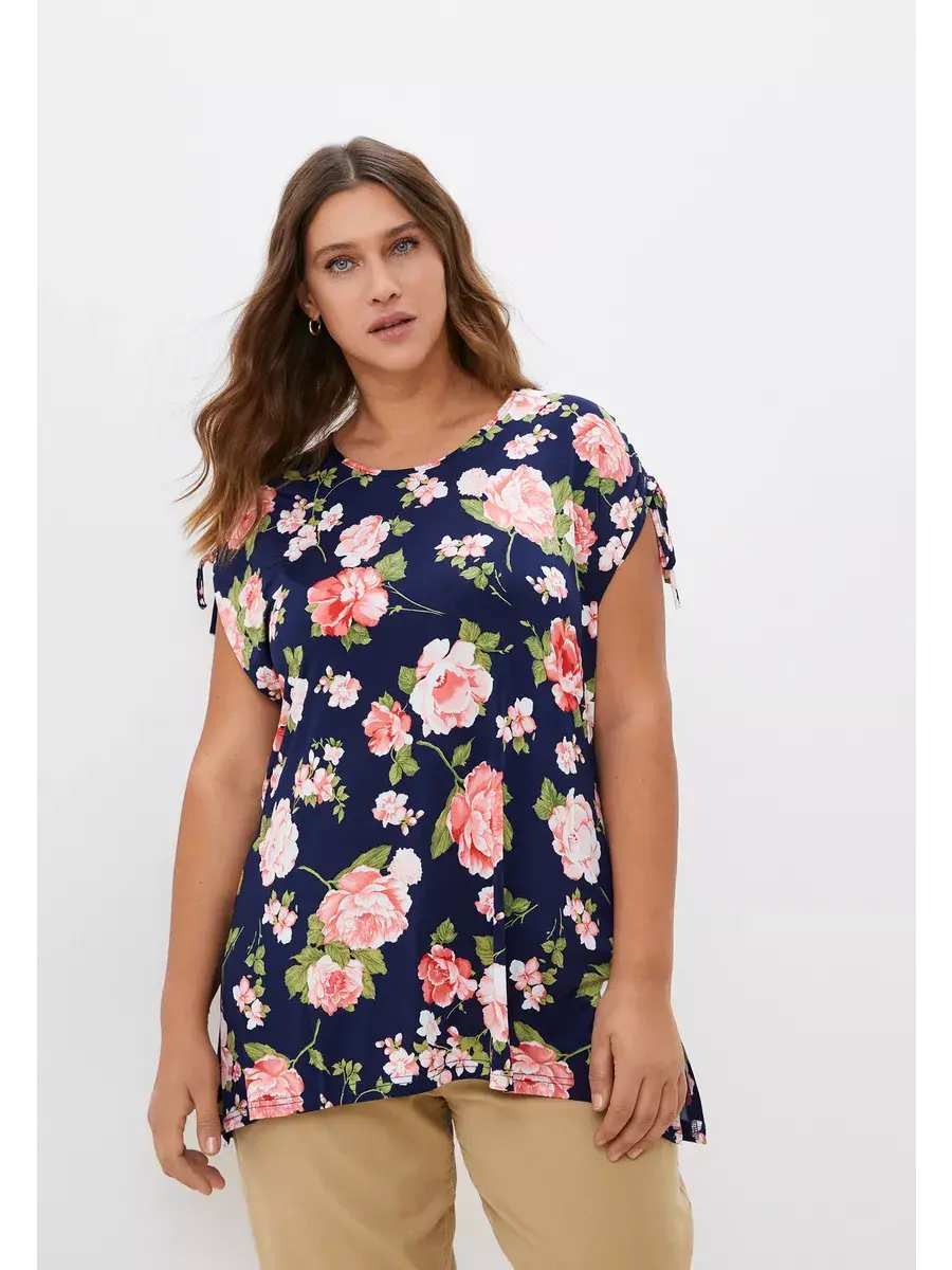 Стильная летняя туника от бренда OLSI из тонкой ткани с крупным цветочным принтом. Женская футболка выполнена из трикотажа масло. Модель с глубоким круглым вырезом горловины; с короткими рукавами крылышко со спущенной проймой; с двойной кулиской с завязками на плечах, с асимметричным низом - аркой спереди, с разрезами по бокам. Изделие полуприлегающего, слегка расклешенного силуэта, придающего фигуре изящество и легкость. Идеально подходит для прогулок, встречи с друзьями, его обязательно нужно взять с собой на отдых.