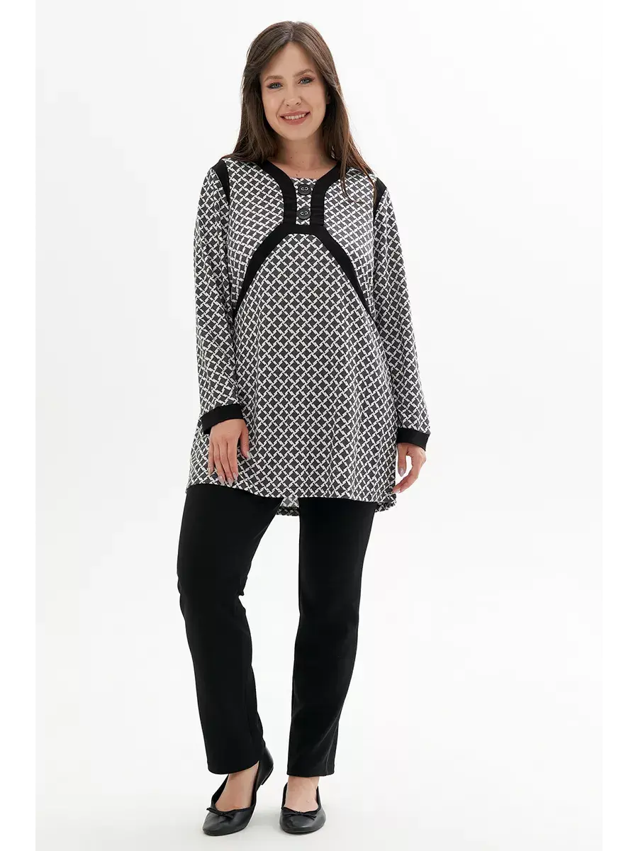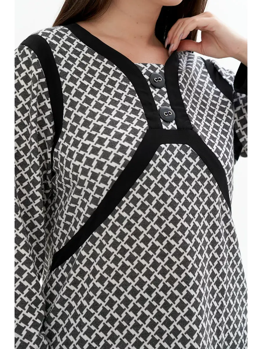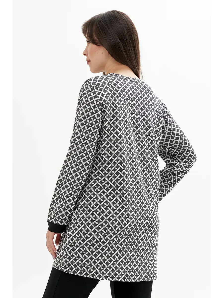 Стильная туника из тонкой плотной ткани с классическим принтом. Модель свободного прямого кроя;с фигурным V-образным вырезом горловины;втачными длинными рукавами, присобранными на манжеты. Гладкокрашеные вставки от плеча к пройме, окантовка горловины, и арка под грудью, придают изделию эффект многослойности: короткого жилета, надетого на платье - шифт с застежкой на три крупные пуговицы. Что визуально корректирует силуэт, нивелирует особенности фигуры, привносит в образ молодежные нотки.
