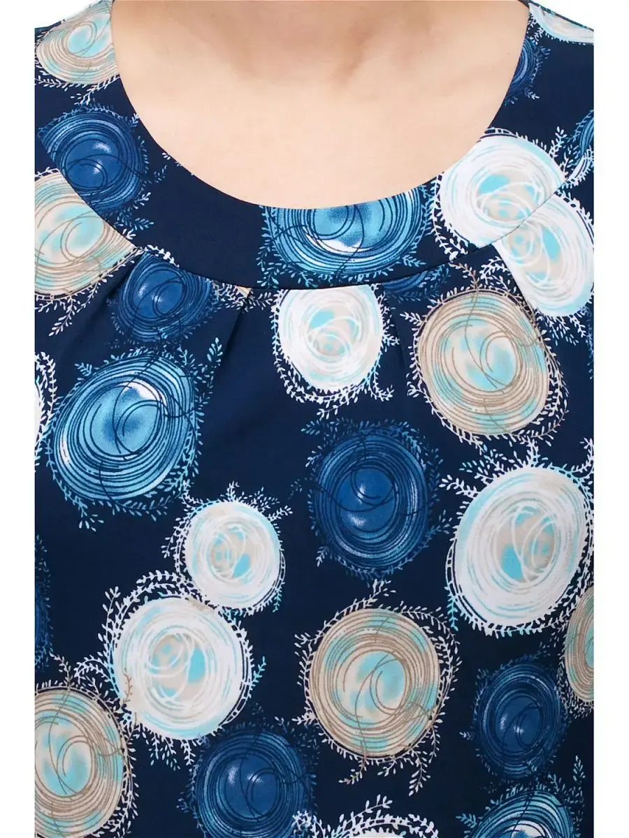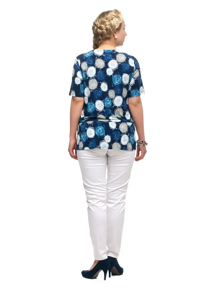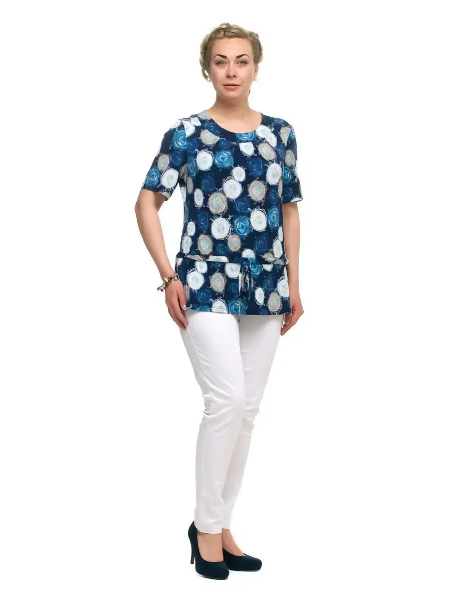 Стильная летняя туника из тонкой ткани с абстрактным принтом в стилизованные под крупный горошек цветы. Модель лаконичного прямого кроя; с круглым вырезом горловины с окантовкой, втачными рукавами до локтей; по бедрам отрезная; на кулиске с завязкой, позволяющей, при необходимости, регулировать объем и высоту напуска, и длину изделия. Туника подтягивает силуэт, мягко нивелирует недочеты фигуры. Идеальна для создания комплектов кэжуал.