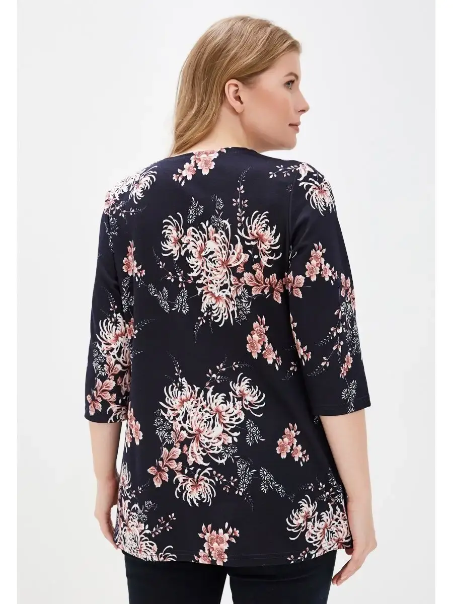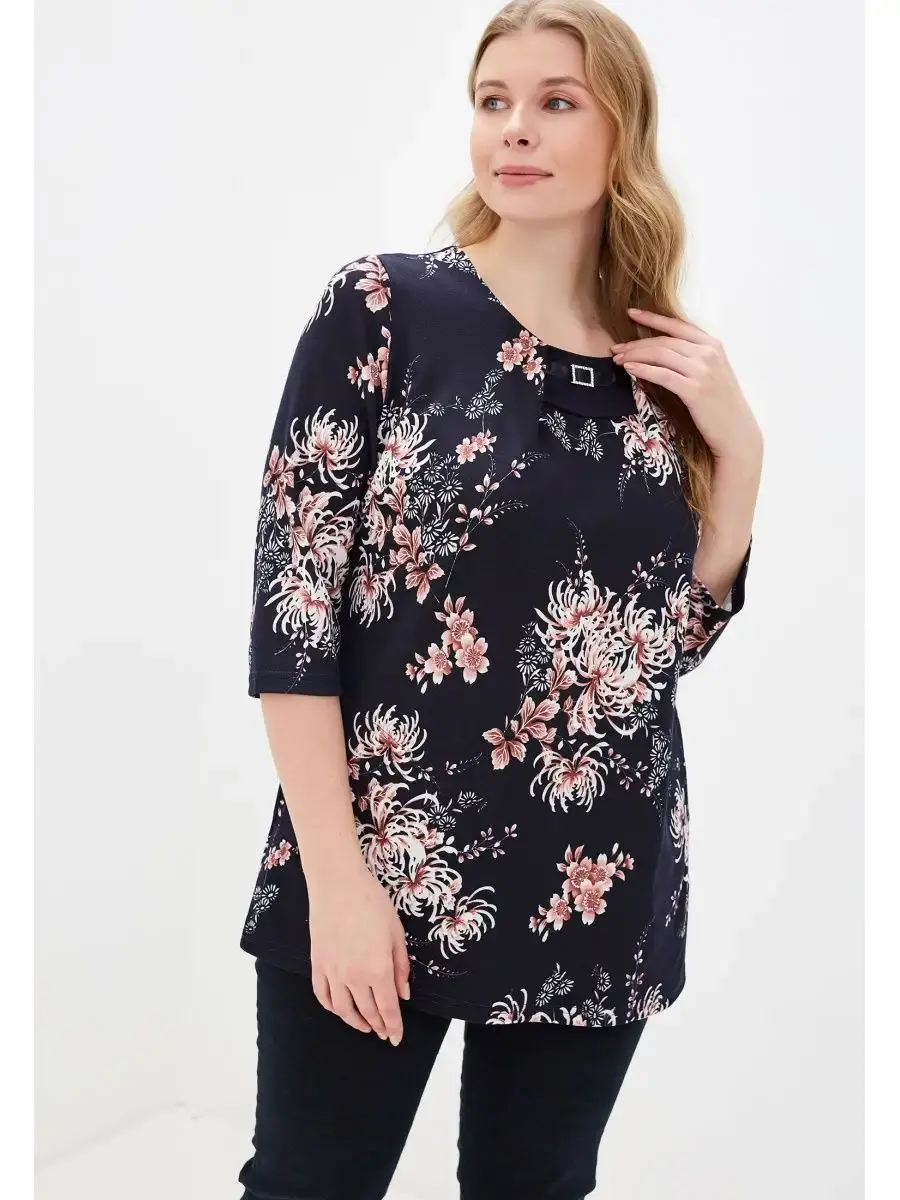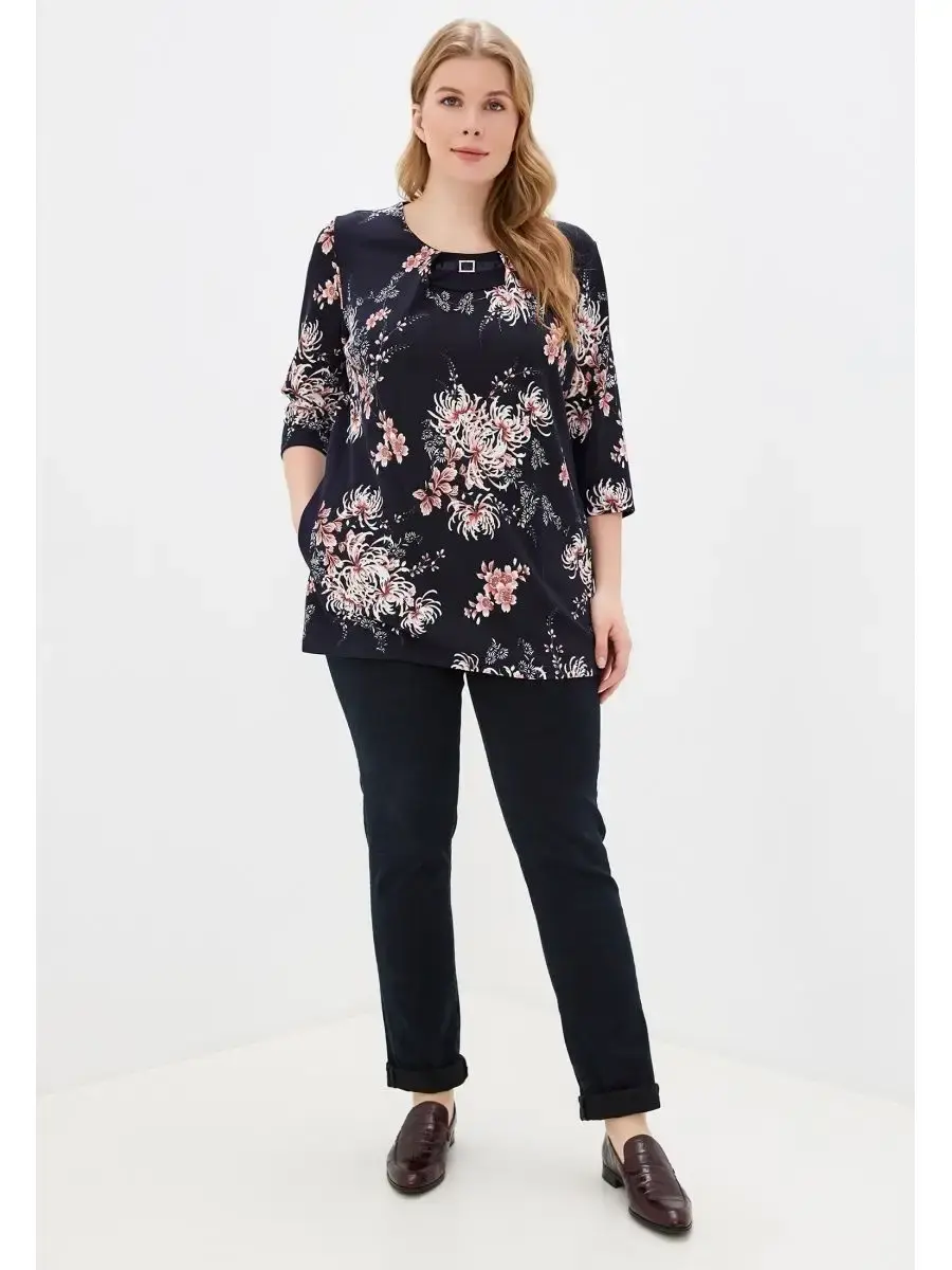 Стильная туника из плотной тонкой ткани с фантазийным цветочным принтом. Модель A-силуэта; с защипами по лифу в области глубокого круглого выреза горловины и декоративной вставкой из однотонного материала с брошью в центре; втачными рукавами длиной 3/4. Туника подчеркивает женственность, выглядит нарядно и элегантно. Лаконичный крой с идеальным балансом стиля и комфорта идеален для различных типов фигур.