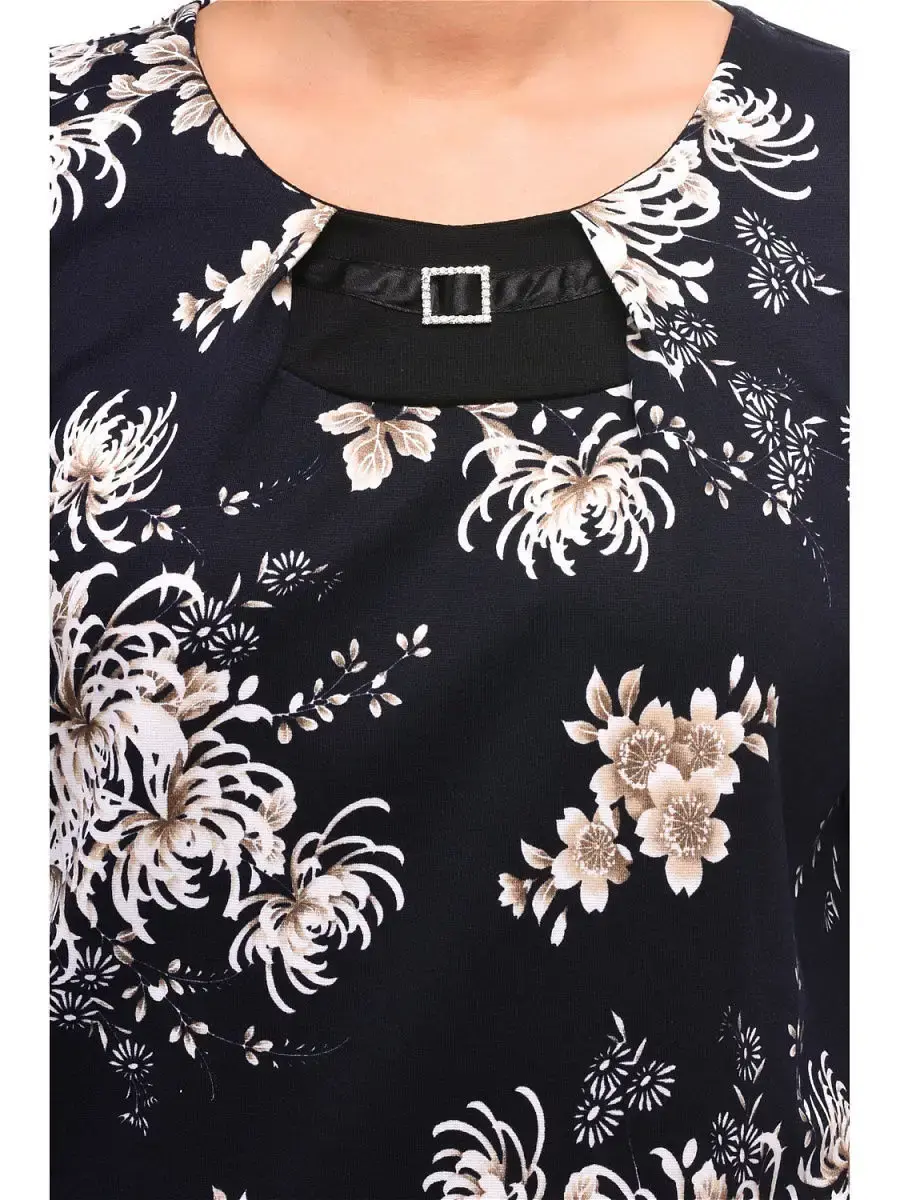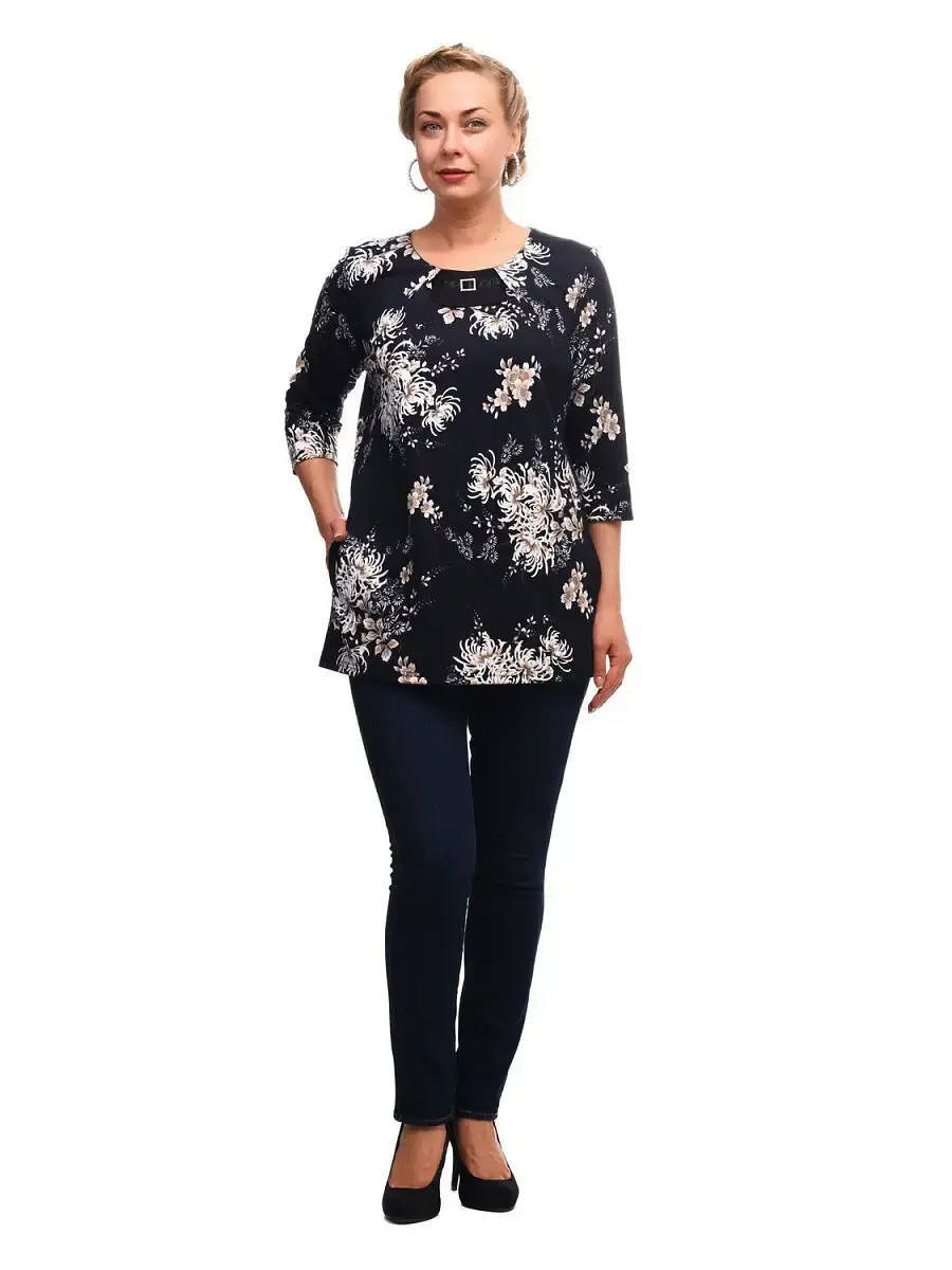 Стильная туника из плотной тонкой ткани с фантазийным цветочным принтом. Модель A-силуэта; с защипами по лифу в области глубокого круглого выреза горловины и декоративной вставкой из однотонного материала с брошью в центре; втачными рукавами длиной 3/4. Туника подчеркивает женственность, выглядит нарядно и элегантно. Лаконичный крой с идеальным балансом стиля и комфорта идеален для различных типов фигур.