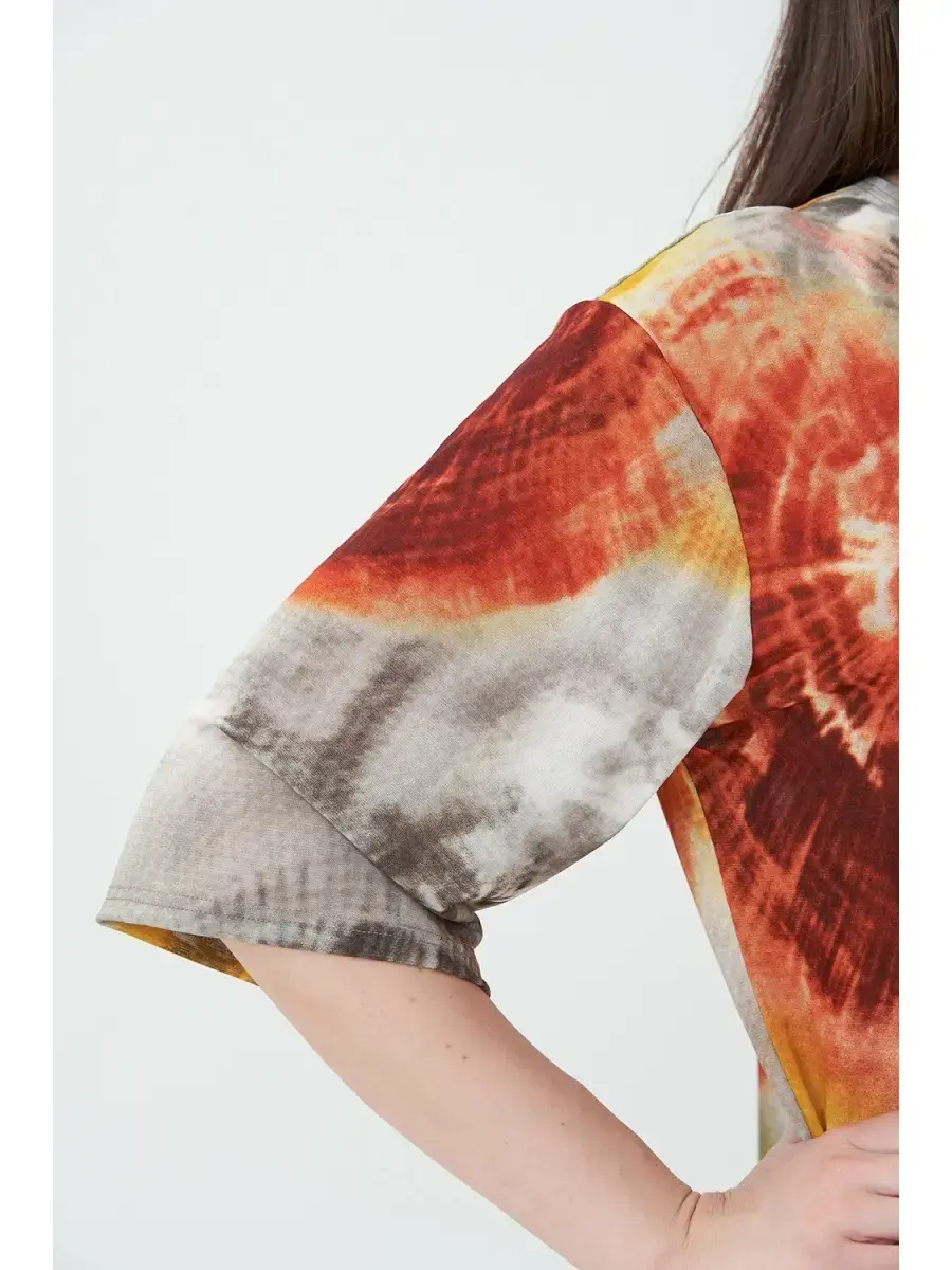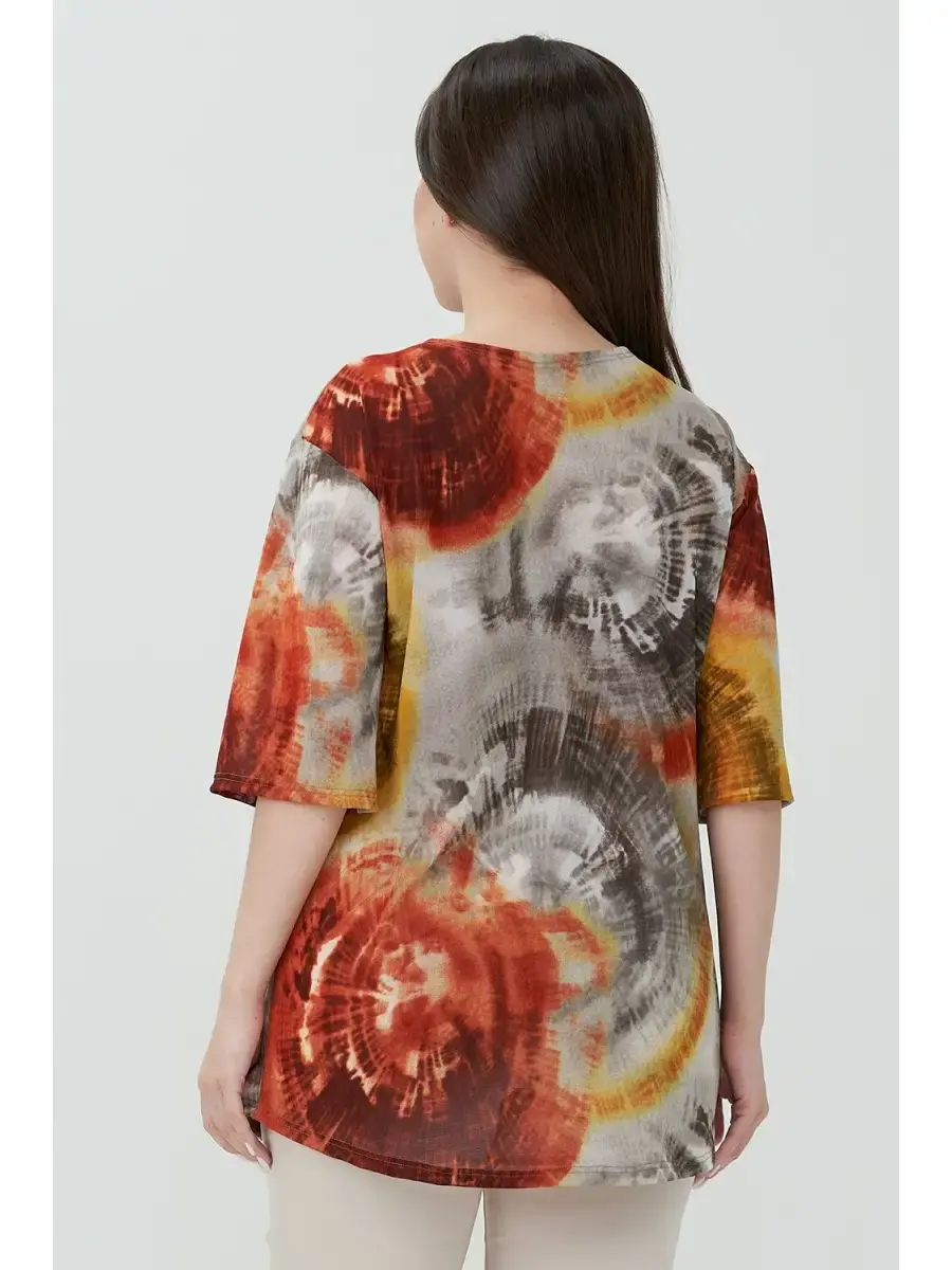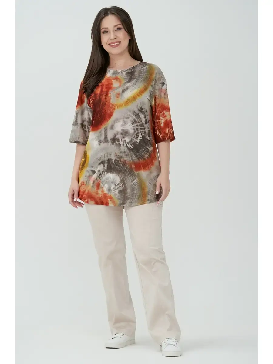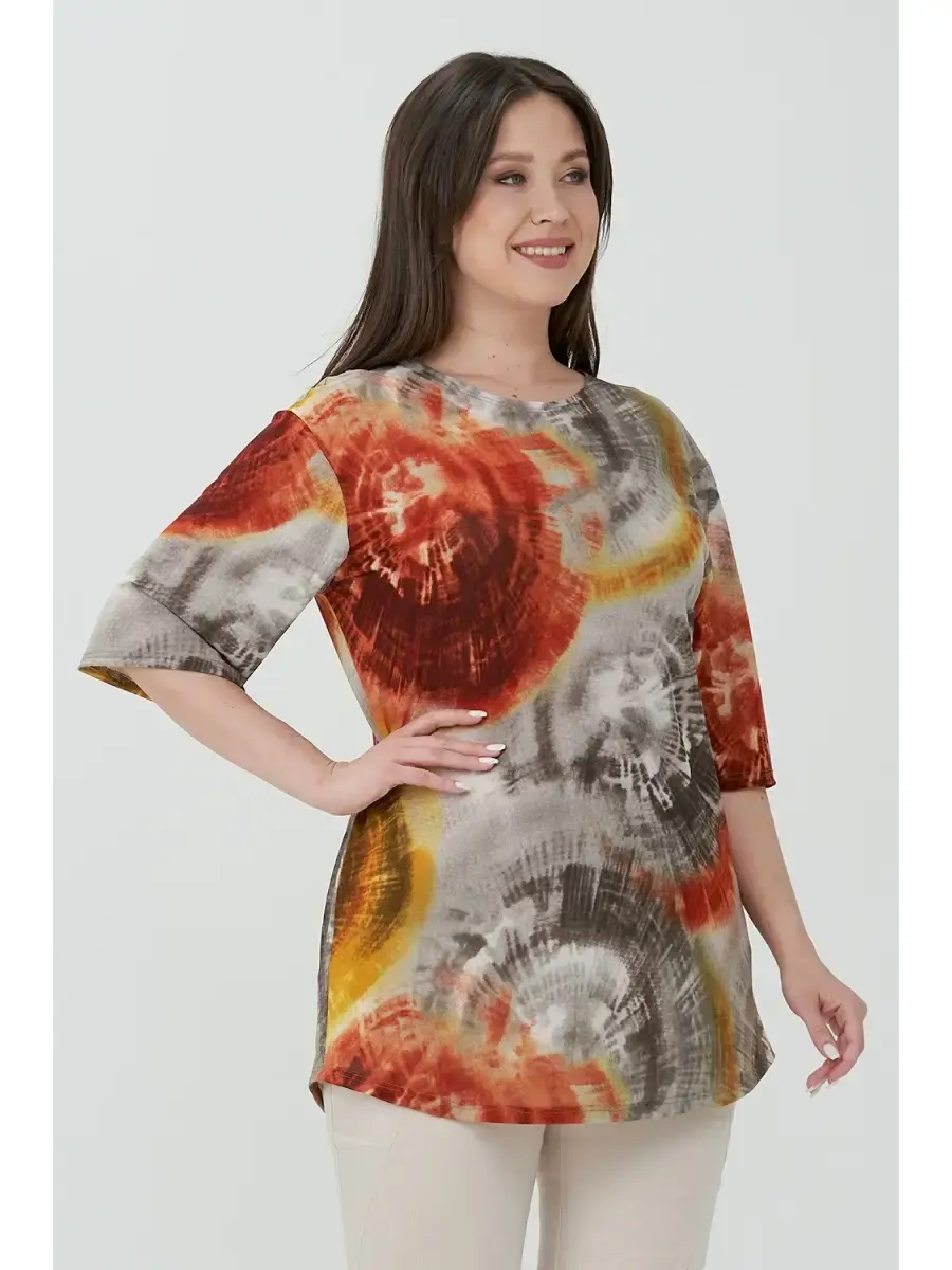 Удлиненная женская футболка свободного кроя выполнена из полотна по типу "сетка" с эластаном. Округлая горловина, широкий рукав длиной до локтя. Базовая вещь современного гардероба, легко гармонирует с джинсами, брючками, шортами, лосинами. Длина изделия по спинке в р.52,54,56,58 -78см.