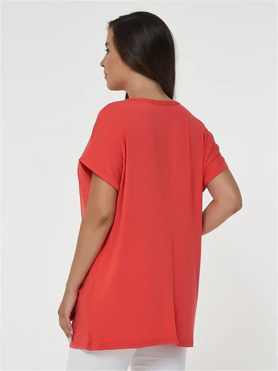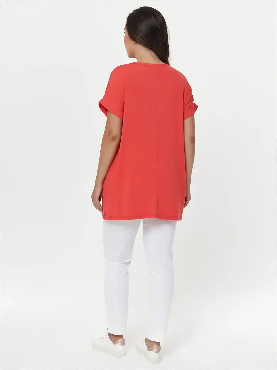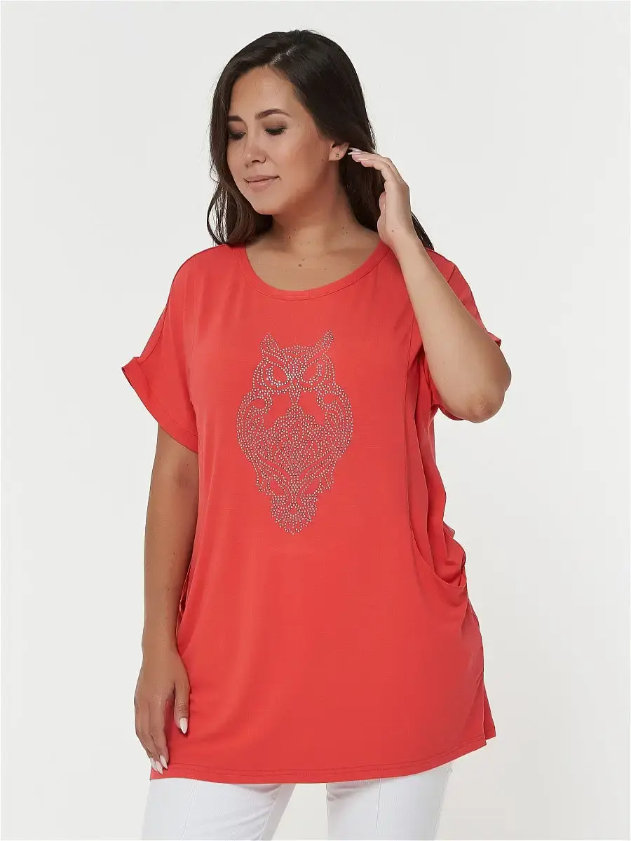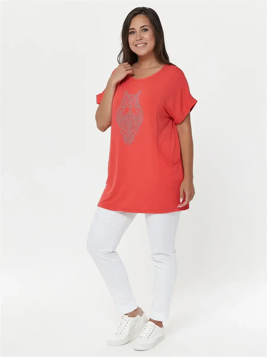 Женская повседневная туника, свободного покроя, выполненная из однотонного хлопчатобумажного трикотажа. Перед и спинка с цельнокроеным рукавом. Перед с рельефами, переходящие в функциональные карманы, горловина и низ рукава обработаны притачной бейкой.Длина изделия ниже бёдер. Отделка: на переде рисунок совы из страза.Длина по спинке:р.50-78,5смр.52-79смр.54-79,5смр.56-80смр.58-80,5смр.60-81смр.62-81,5смр.64-82смр.66-82,5смр.68-83смр.70-83,5смр.72-84смКороткий рукав.