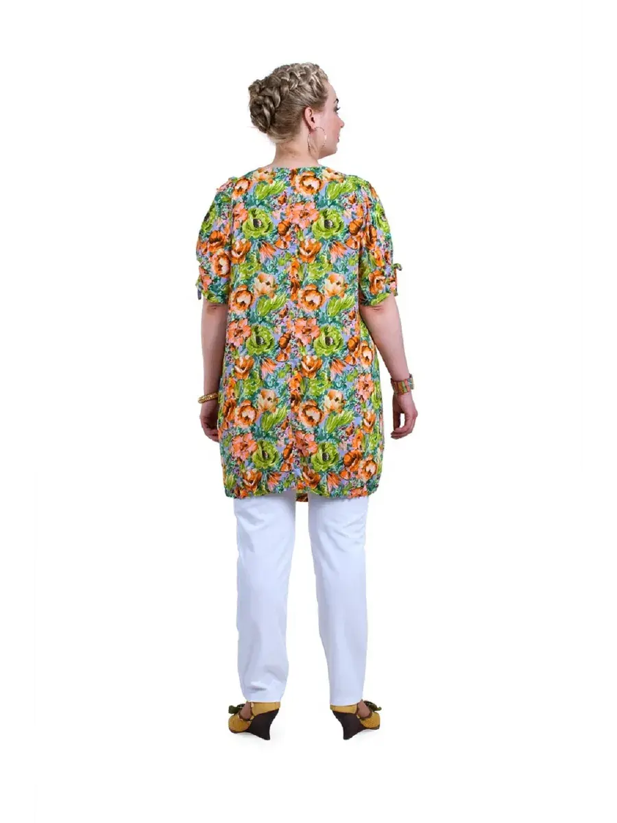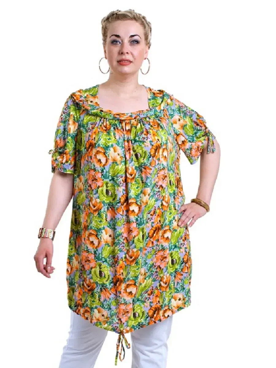 Легкая воздушная туника для женщин от бренда OLSI идеальный вариант для жакрого лета. Удлиненная блузка больших размеров выполнена из качественного хлокового штапеля с ярким принтом. Кулиска по низу изделия поможет создать различные образы, подходящие как для города в стиле кэжуал, так и для отдыха в романтичном образе. Удобная модель рубашки Олси свободного фасона незаменима в теплый сезон, позволяя коже дышать.