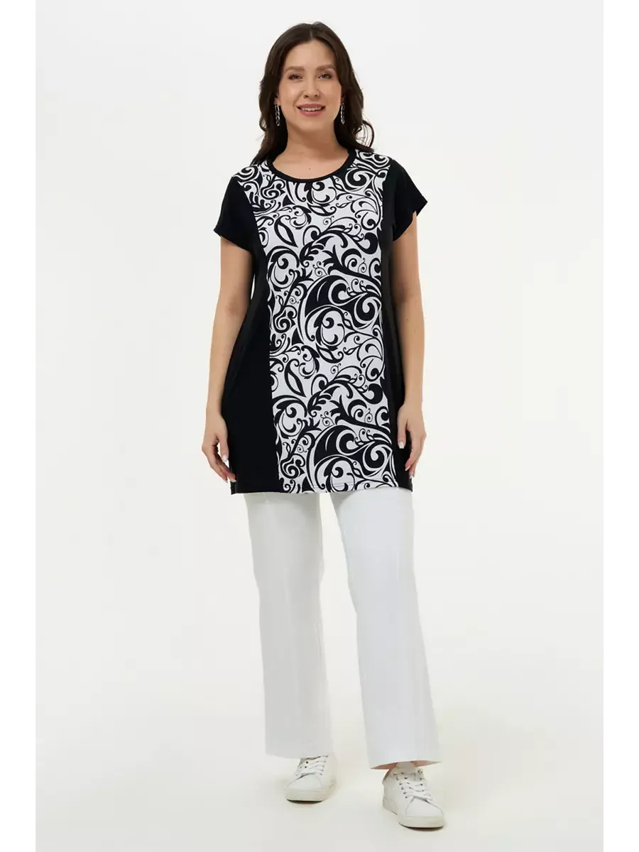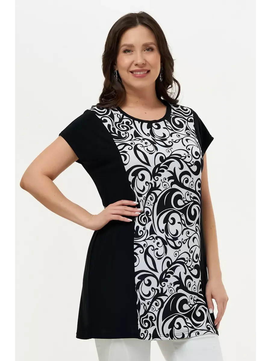 Лёгкий женский топ больших размеров, выполненный из трикотажной ткани масло. Блузка женская по типу футболки с коротким рукавом, очень удобна в носке и у уходе - не мнется, не требует глажки, запимает мало места. Длина по спинке во всех размерах 85см. Блуза женская, футболка больших размеров, футболка удлиненная, туника прямая летняя, футболка для полных женщин