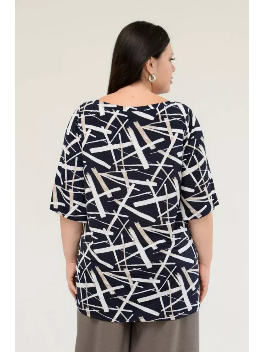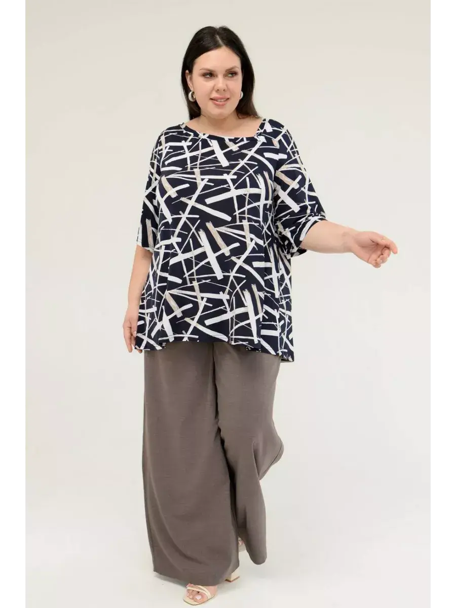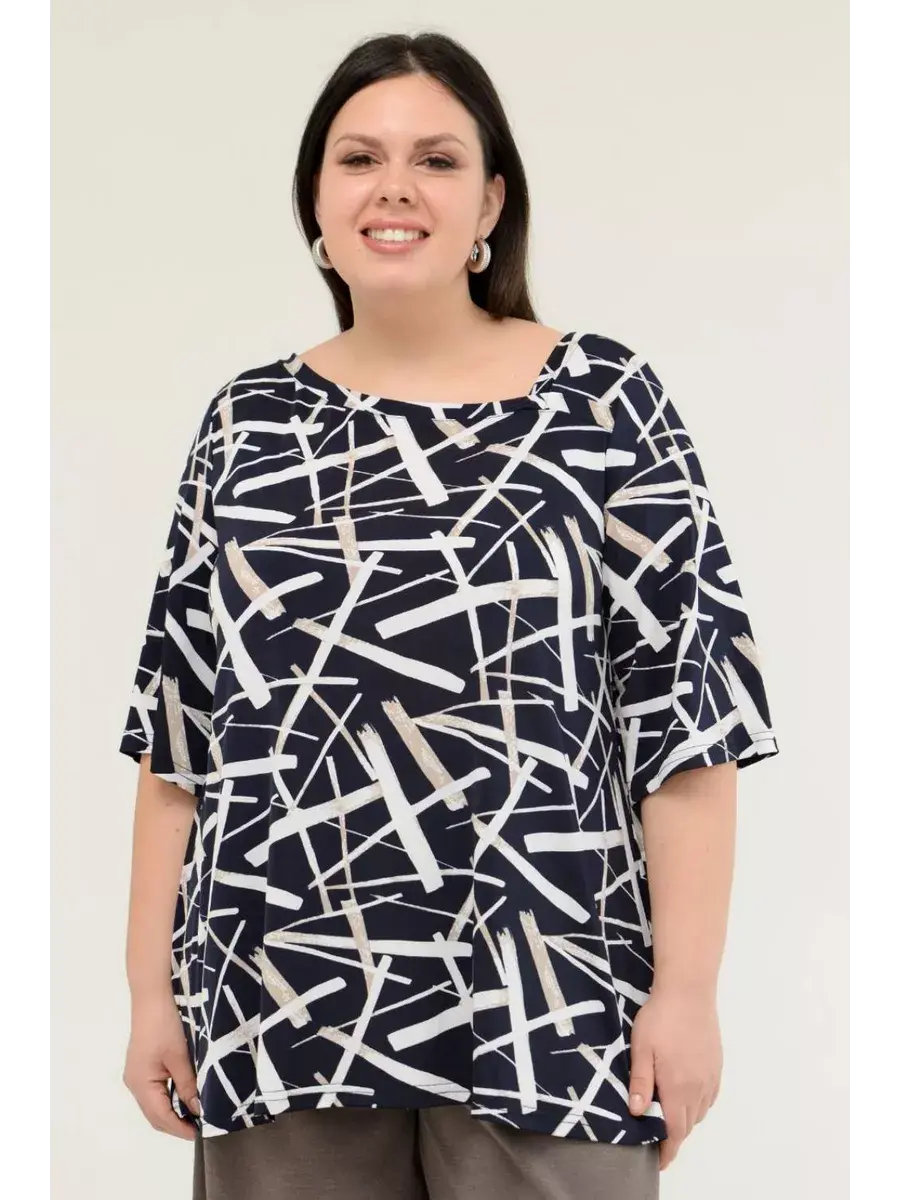 Стильная женская туника больших размеров от бренда OLSI, выполнена из шелковистого трикотажа-масло, с контурным рисунком. Модель расклешенного силуэта, с асимметричным вырезом горловины. Женская летняя блузка визуально удлиняет ноги, нивелирует особенности фигуры. Прекрасный вариант для повседневного гардероба.