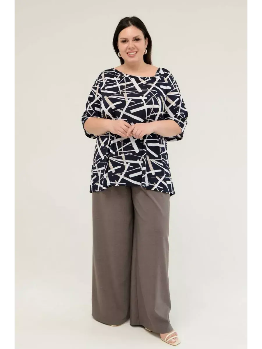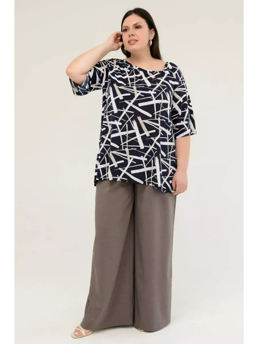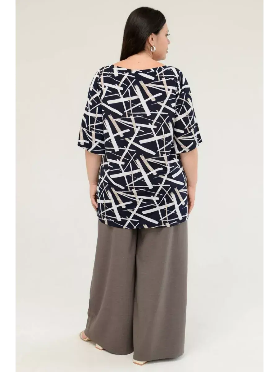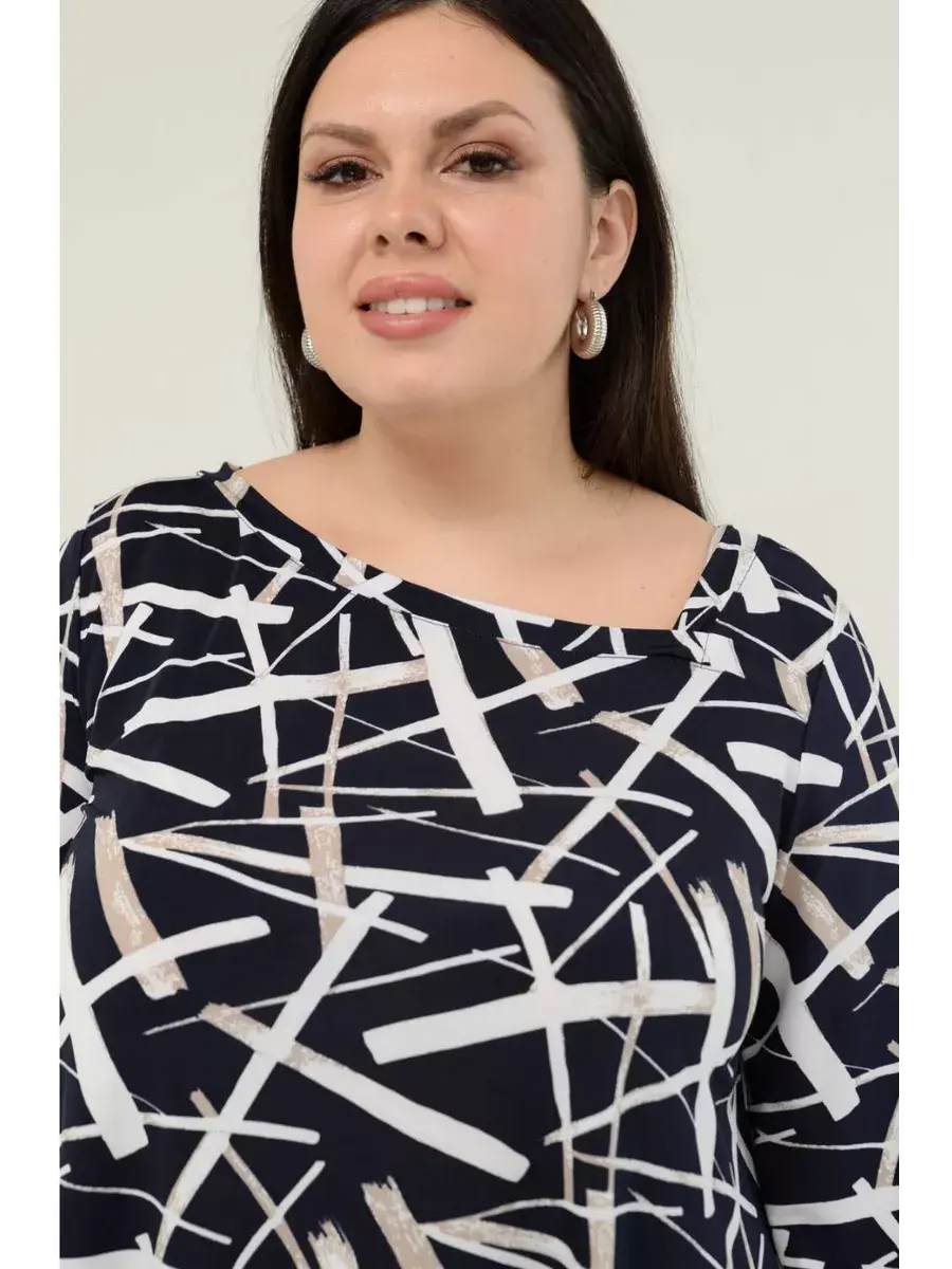 Стильная женская туника больших размеров от бренда OLSI, выполнена из шелковистого трикотажа-масло, с контурным рисунком. Модель расклешенного силуэта, с асимметричным вырезом горловины. Женская летняя блузка визуально удлиняет ноги, нивелирует особенности фигуры. Прекрасный вариант для повседневного гардероба.