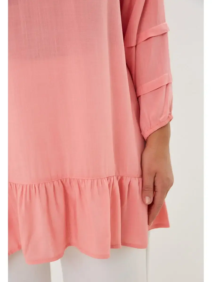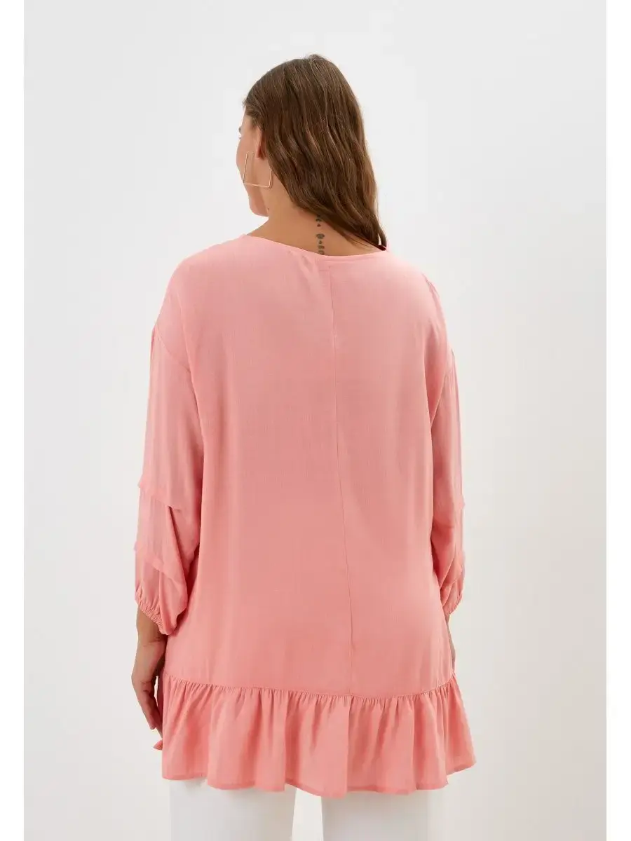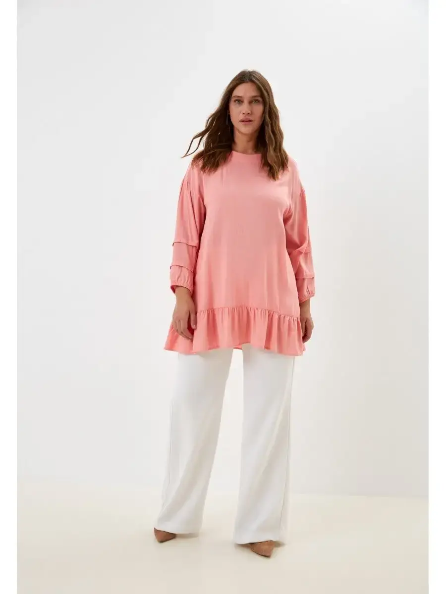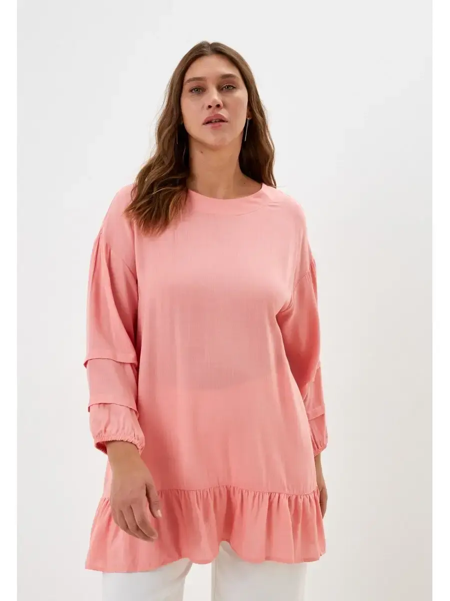 Женская повседневная туника, прямого силуэта, выполненная их вискозы. Рукав одношовный, втачной, со складками, нижний срез на резинке. Длина изделия до бёдер. Низ оформлен сборкой. Длина по спинке от 81см в р.48 до 84,5см в р.70, длина рукава 60см.