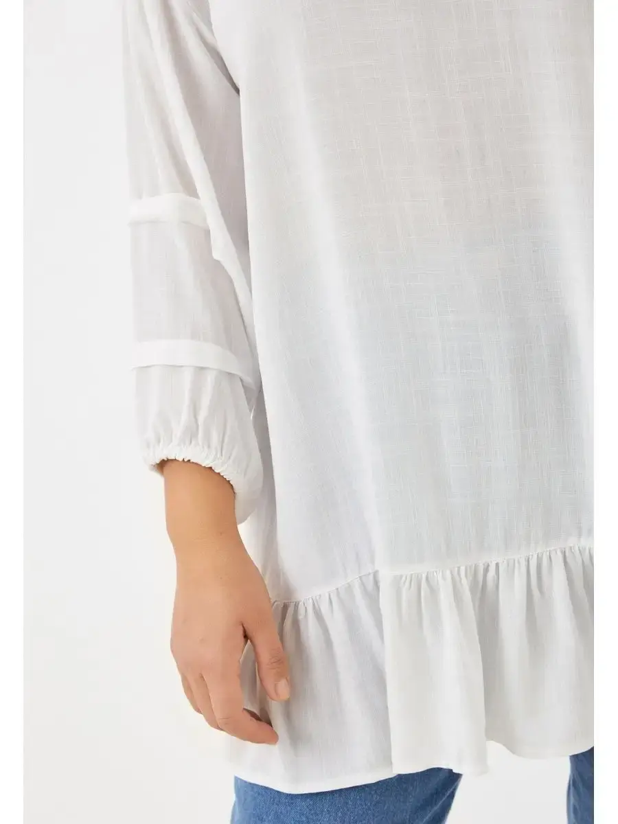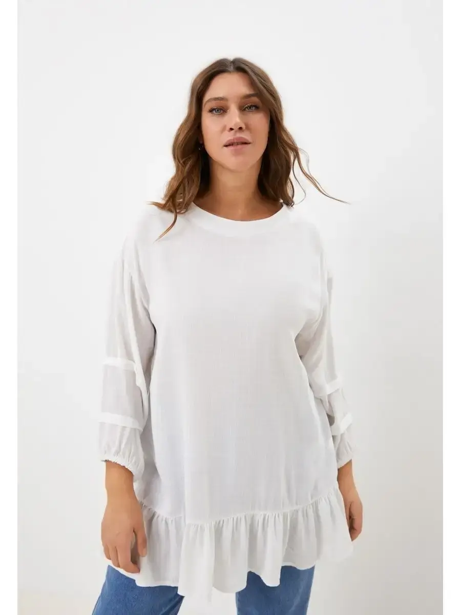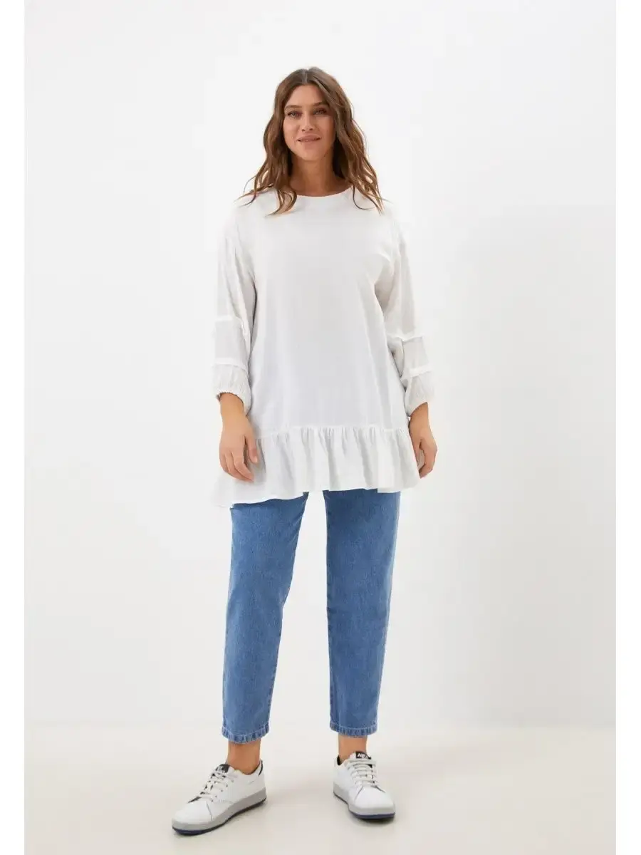 Женская повседневная туника, прямого силуэта, выполненная их вискозы. Рукав одношовный, втачной, со складками, нижний срез на резинке. Длина изделия до бёдер. Низ оформлен сборкой. Длина по спинке от 81см в р.48 до 84,5см в р.70, длина рукава 60см.