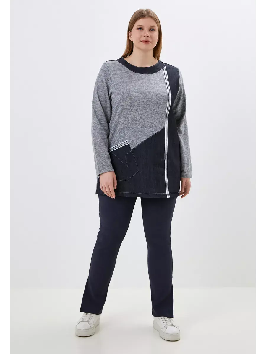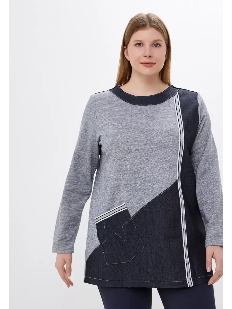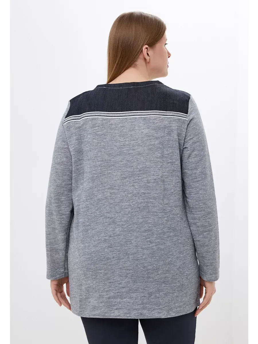 Женская стильная повседневная кофта большого размера, выполнена из мягкого приятного на ощупь полотна и джинсой, декорирована тесьмой. Джемпер женский повседневный длиной по спинке от 75см в р.48 до 80,5см в р.70. Длина рукава 62см.