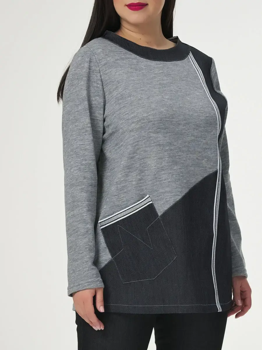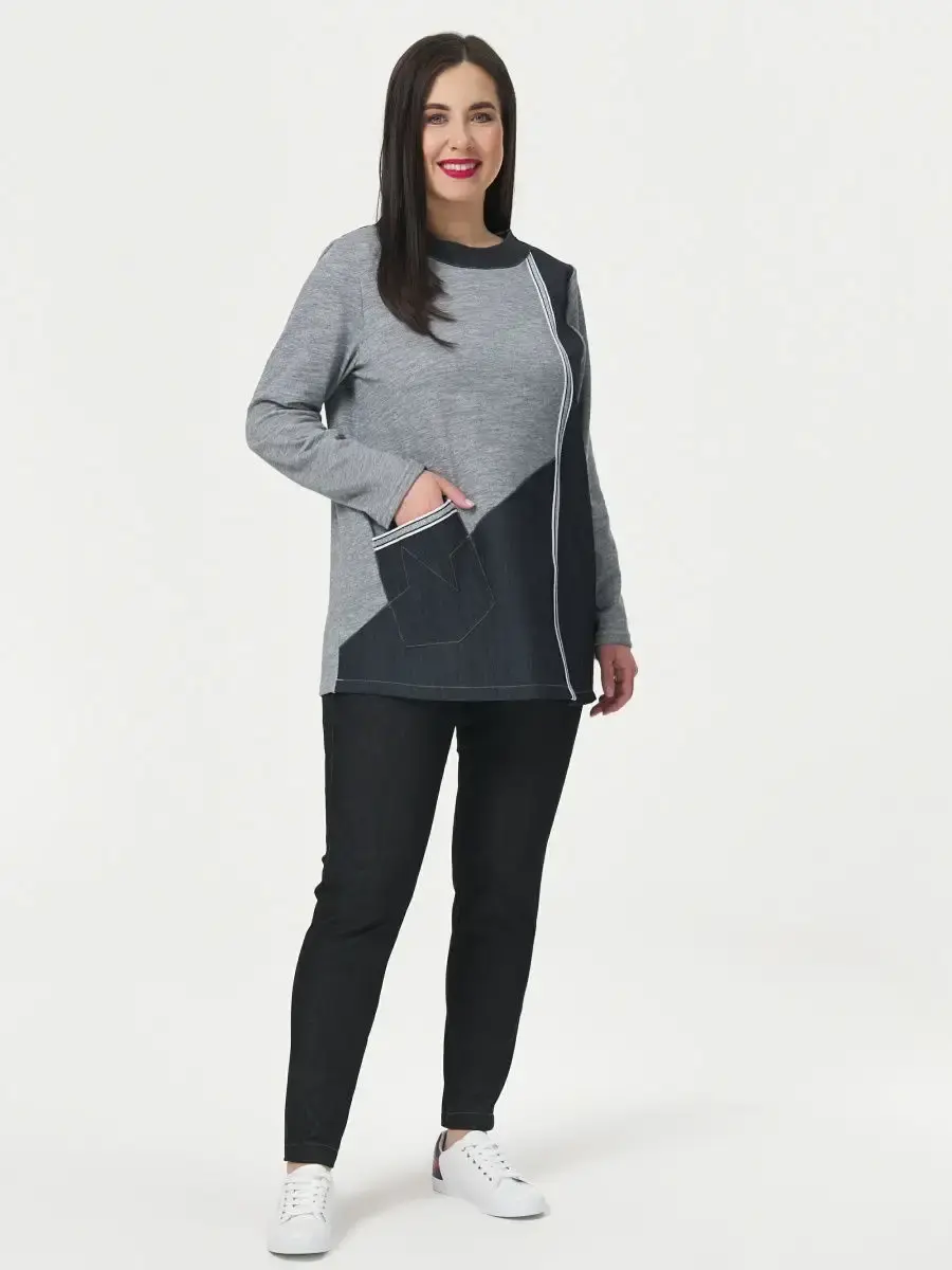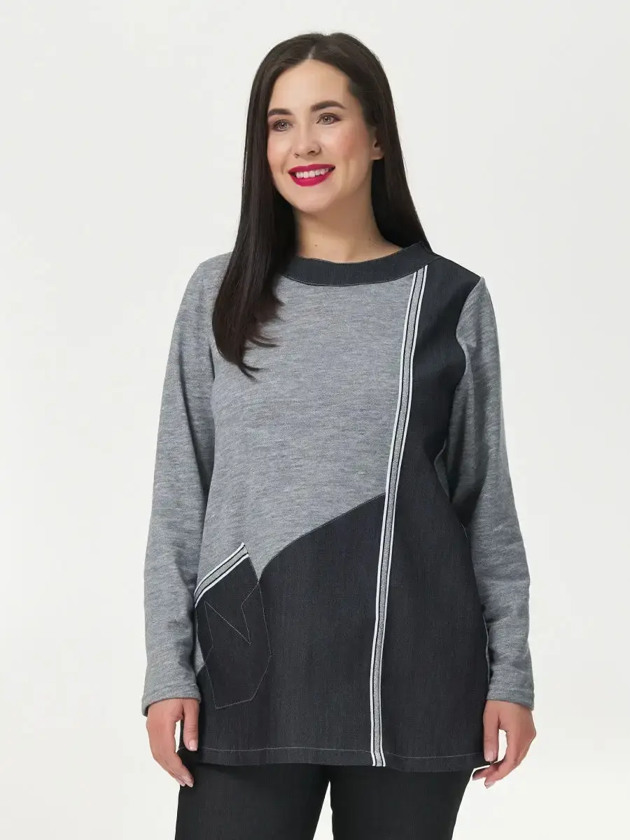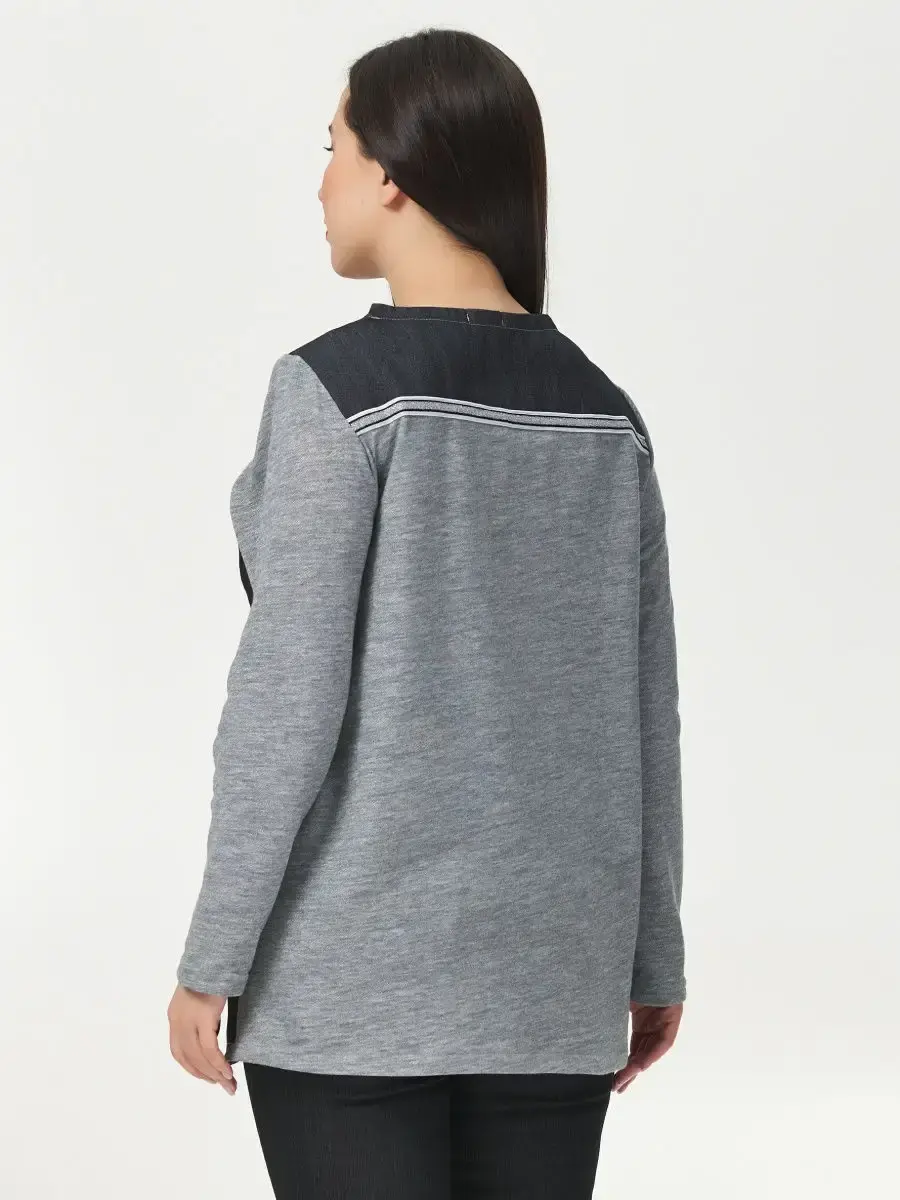 Женская стильная повседневная кофта большого размера, выполнена из мягкого приятного на ощупь полотна и джинсой, декорирована тесьмой. Джемпер женский повседневный длиной по спинке от 75см в р.48 до 80,5см в р.70. Длина рукава 62см.
