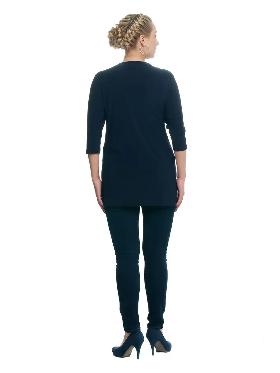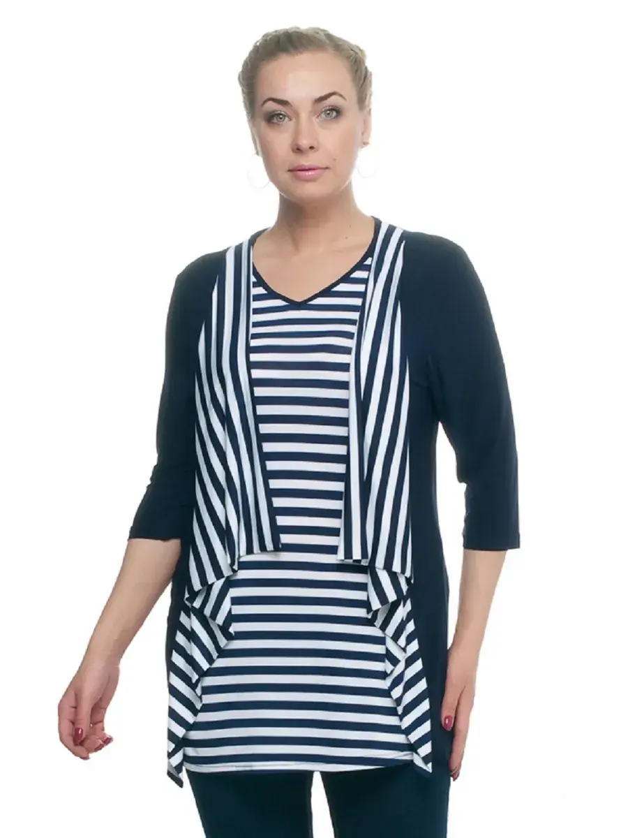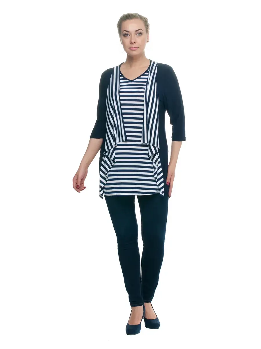 Женская удлиненная кофточка больших размеров выполнена из шелковистого немнущегося трикотажа "масло". Туника имеет округлый вырез горловины, рукава длиной 3/4, прямой силуэт. Повседневная кофта для женщин длиной ниже бедра, бренда Olsi - это Ваш вариант. Немнущаяся эластичная ткань прекрасно держит форму, не деформируется при ежедневной носке, хорошо пропускает воздух. Женская блузка декорирована сочетанием полосатой и однотонной ткани. Туника женская трикотажная рассчитана именно на демисезонную погоду и отлично подойдет для офиса, а также в качестве домашней одежды. Дополните этот удлиненный лонгслив леггинсами или носите как платье - все зависит только от вашего роста и фантазии. К такой универсальной модели легко подобрать аксессуары и практически любую обувь. Базовая кофта идеально дополнит стильные женские брюки. Туника имеет свободный крой и оверсайз фасон, не сковывает движений, не прилегает плотно к телу, так что вы сможете выбрать для себя по-настоящему комфортную и в то же время стильную кофту на каждый день. Вы сможете выбрать джемпер, который подойдет именно вам, так как подойдет любой моднице и сможет украсить ваш гардероб.