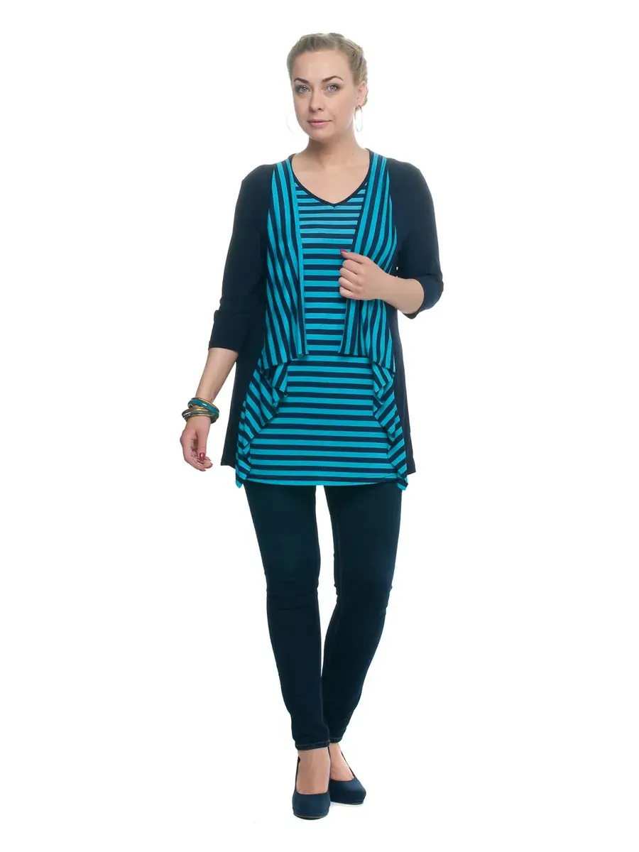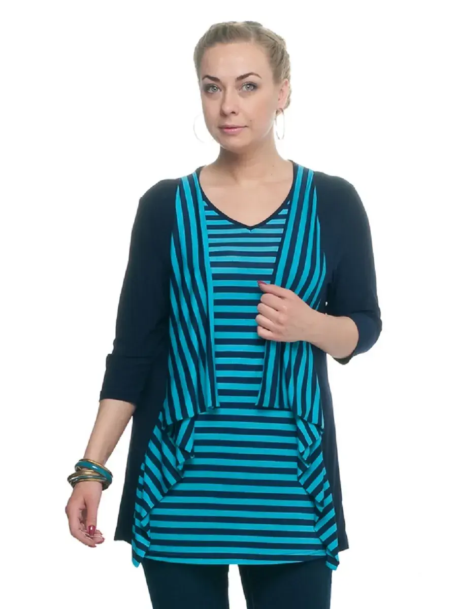 Женская удлиненная кофточка больших размеров выполнена из шелковистого немнущегося трикотажа "масло". Туника имеет округлый вырез горловины, рукава длиной 3/4, прямой силуэт. Повседневная кофта для женщин длиной ниже бедра, бренда Olsi - это Ваш вариант. Немнущаяся эластичная ткань прекрасно держит форму, не деформируется при ежедневной носке, хорошо пропускает воздух. Женская блузка декорирована сочетанием полосатой и однотонной ткани. Туника женская трикотажная рассчитана именно на демисезонную погоду и отлично подойдет для офиса, а также в качестве домашней одежды. Дополните этот удлиненный лонгслив леггинсами или носите как платье - все зависит только от вашего роста и фантазии. К такой универсальной модели легко подобрать аксессуары и практически любую обувь. Базовая кофта идеально дополнит стильные женские брюки. Туника имеет свободный крой и оверсайз фасон, не сковывает движений, не прилегает плотно к телу, так что вы сможете выбрать для себя по-настоящему комфортную и в то же время стильную кофту на каждый день. Вы сможете выбрать джемпер, который подойдет именно вам, так как подойдет любой моднице и сможет украсить ваш гардероб.
