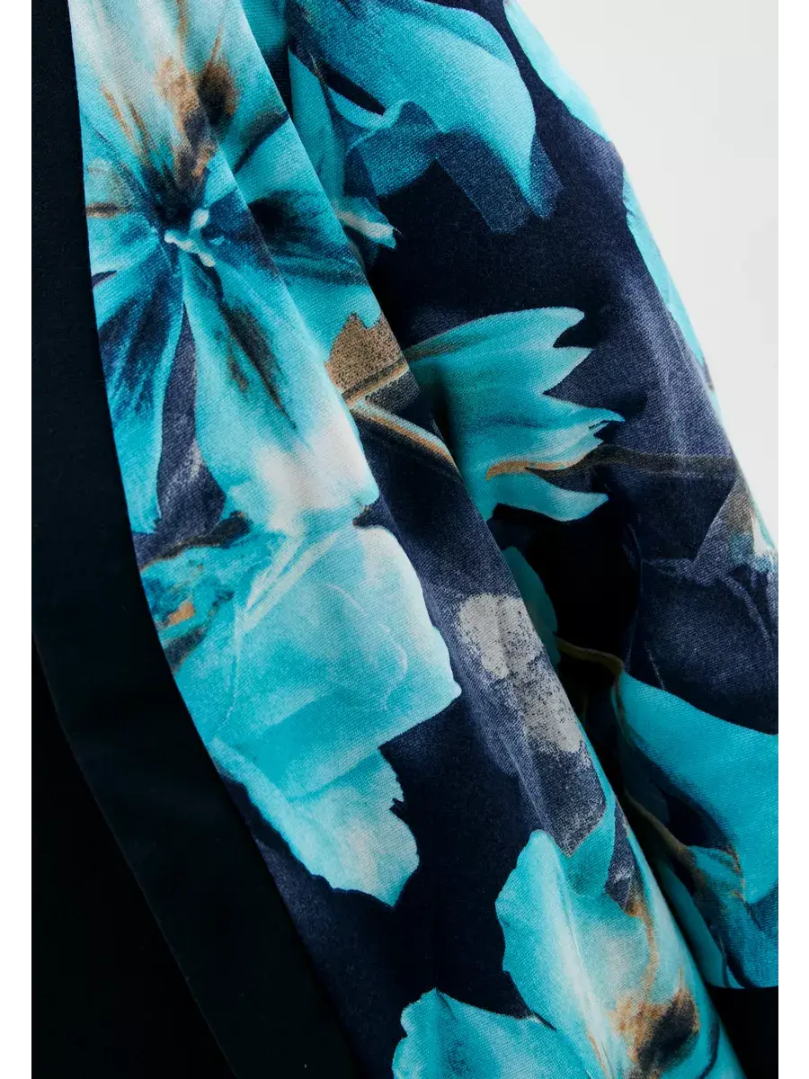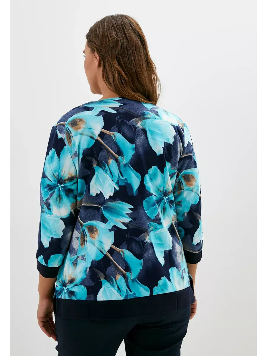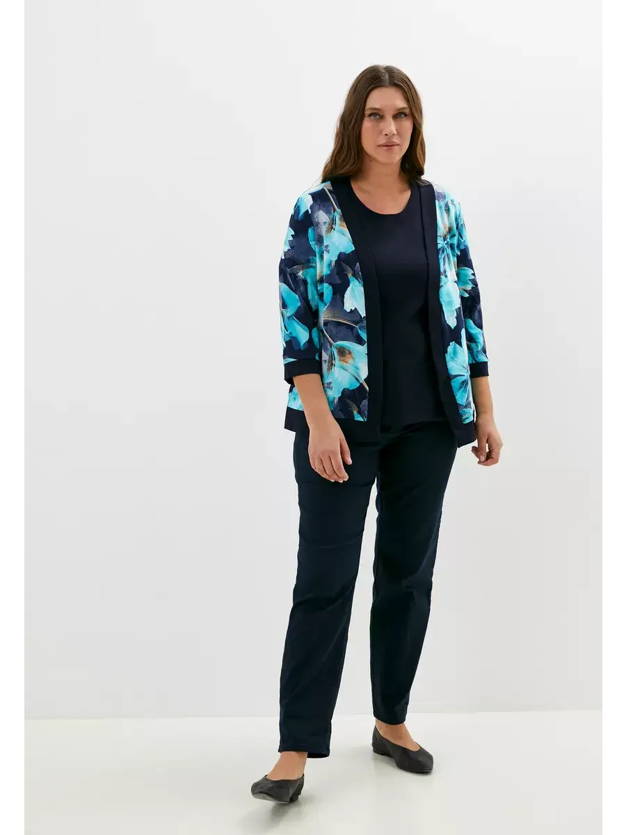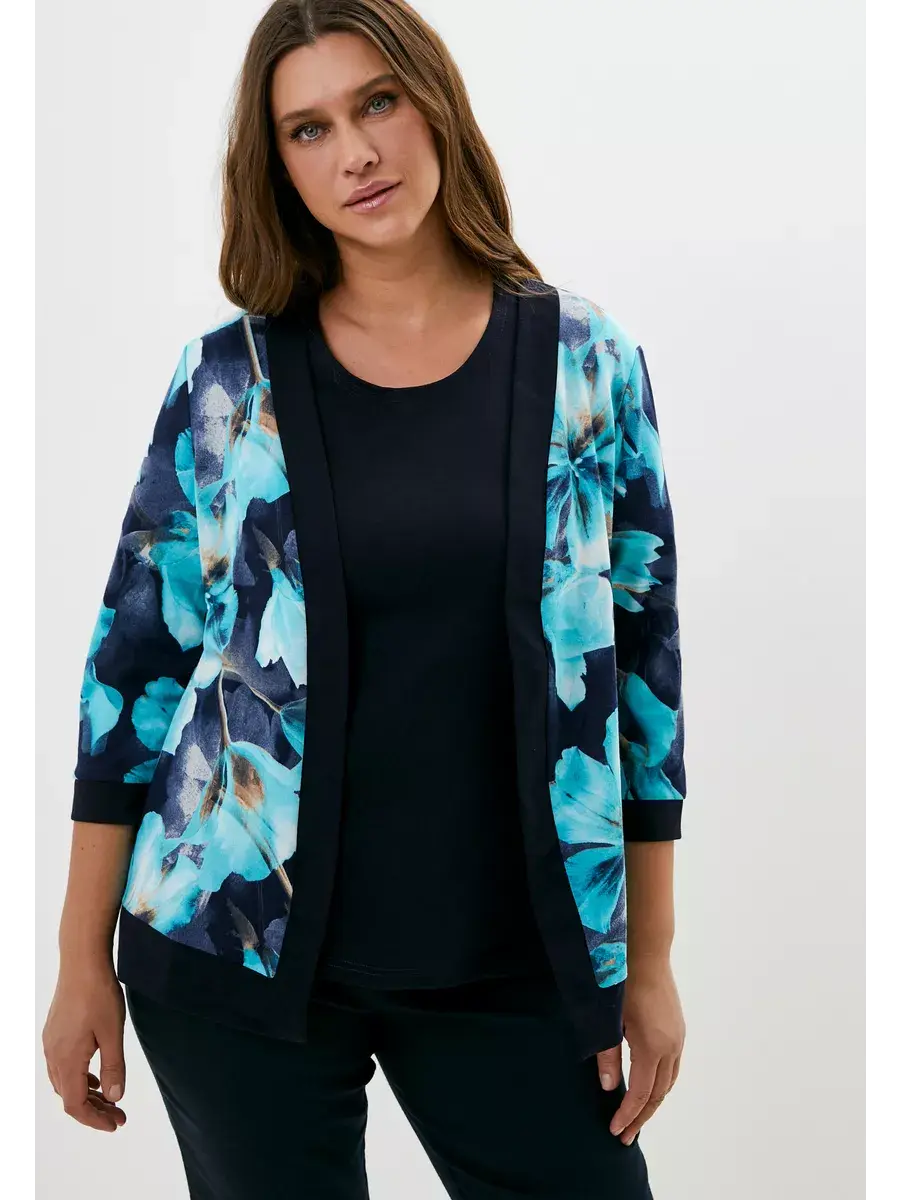 Эффектный костюм кардиган плюс блуза. Кардиган из плотного триккотажа с крупным цветочным принтом; полуприлегающего силуэта; с V – образным вырезом; втачными рукавами длиной 3/4. Вырез, полочки, манжеты и низ кардигана оформлены окантовкой из однотонной ткани. Блуза выполнена в цвет отделки. Модель с округлым вырезом горловины, короткими втачными рукавами до локтя. Изделие позволяет чувствовать себя комфортно, а выглядеть - элегантно в любой ситуации. Комплект кардиган с блузкой, Твинсет женский больших размеров, твинсет большой размер, комплект женский , костюм женский в офис