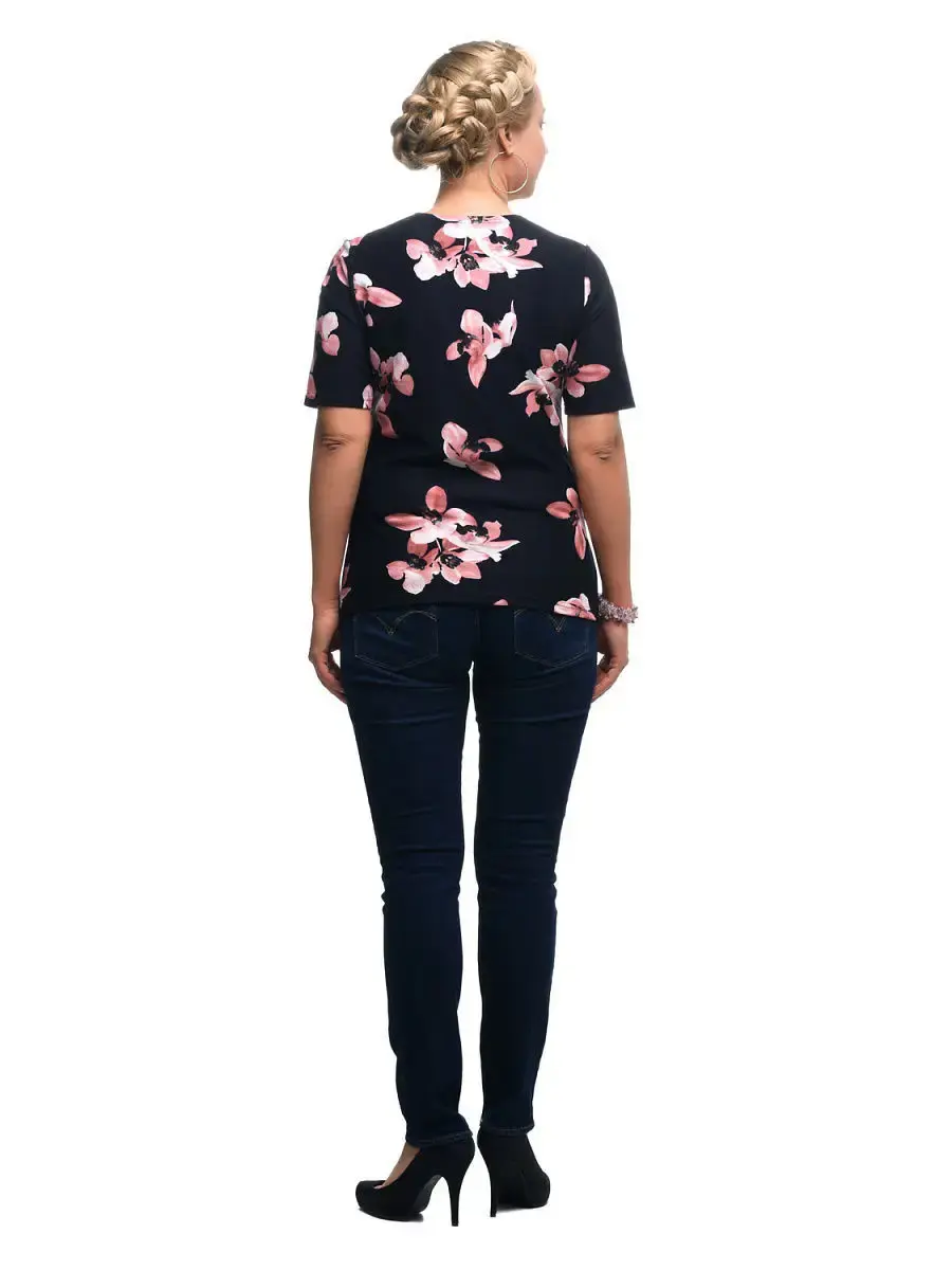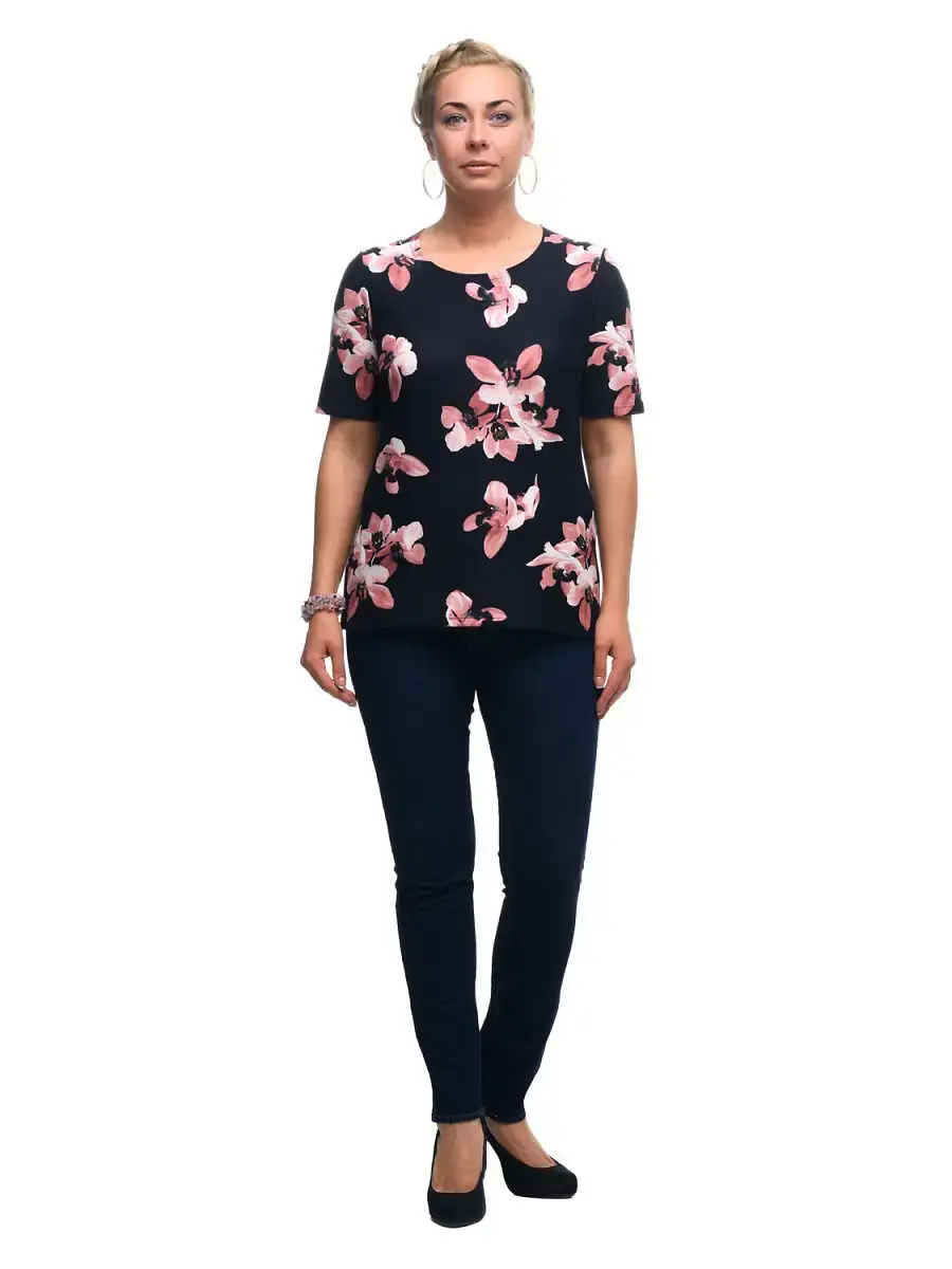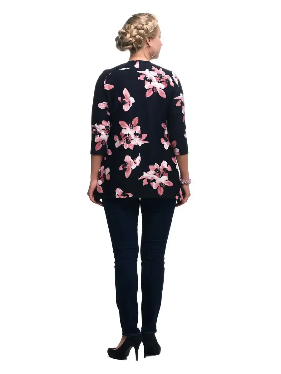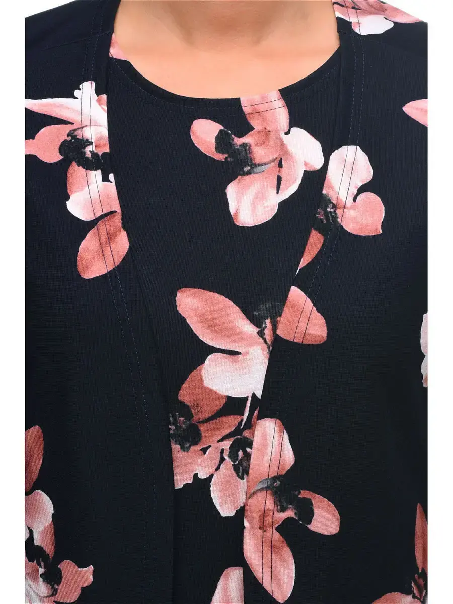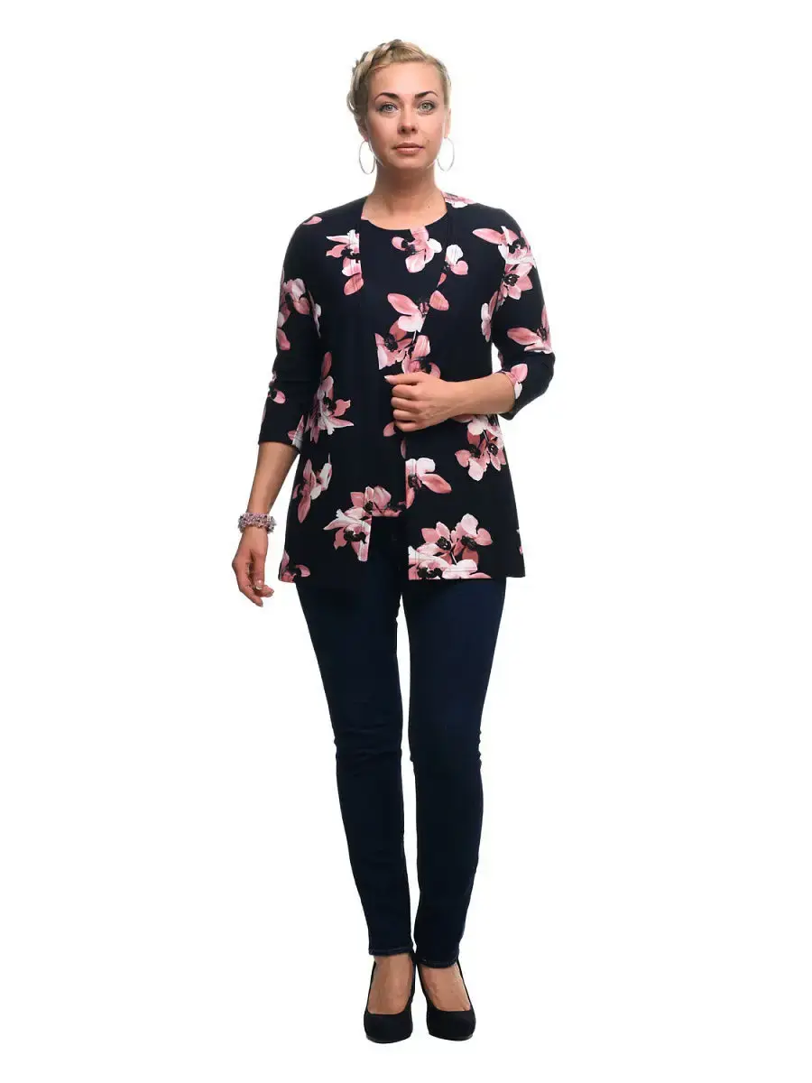 Эффектный комплект - кардиган плюс блузка из плотного трикотажного полотна с крупным цветочным принтом. Кардиган полуприлегающего силуэта; с V-образной горловиной, втачными рукавами со спущенной проймой длиной 3/4. Комплект кардиган с блузкой, Твинсет женский больших размеров, твинсет большой размер, комплект женский , костюм женский в офис, твин сет топ, Твинсет трикотажный