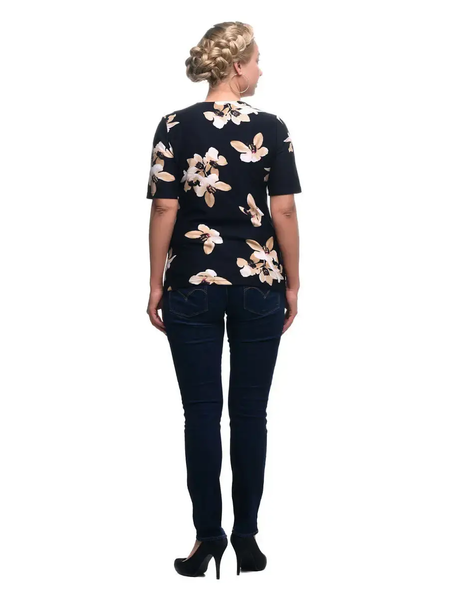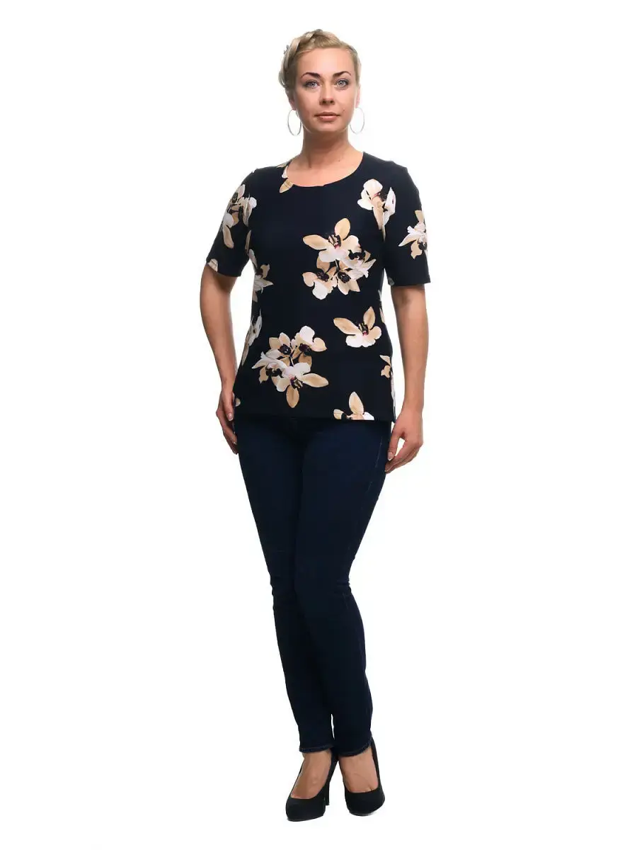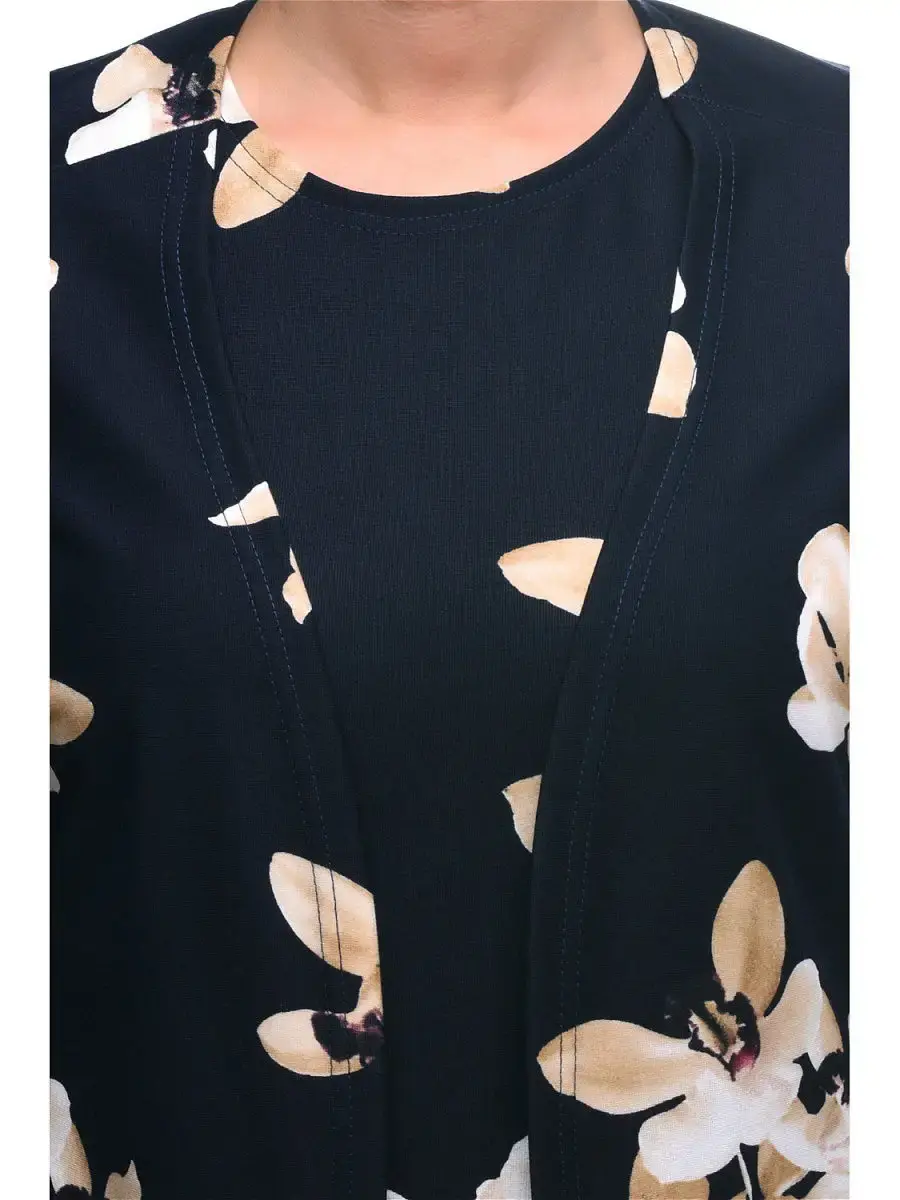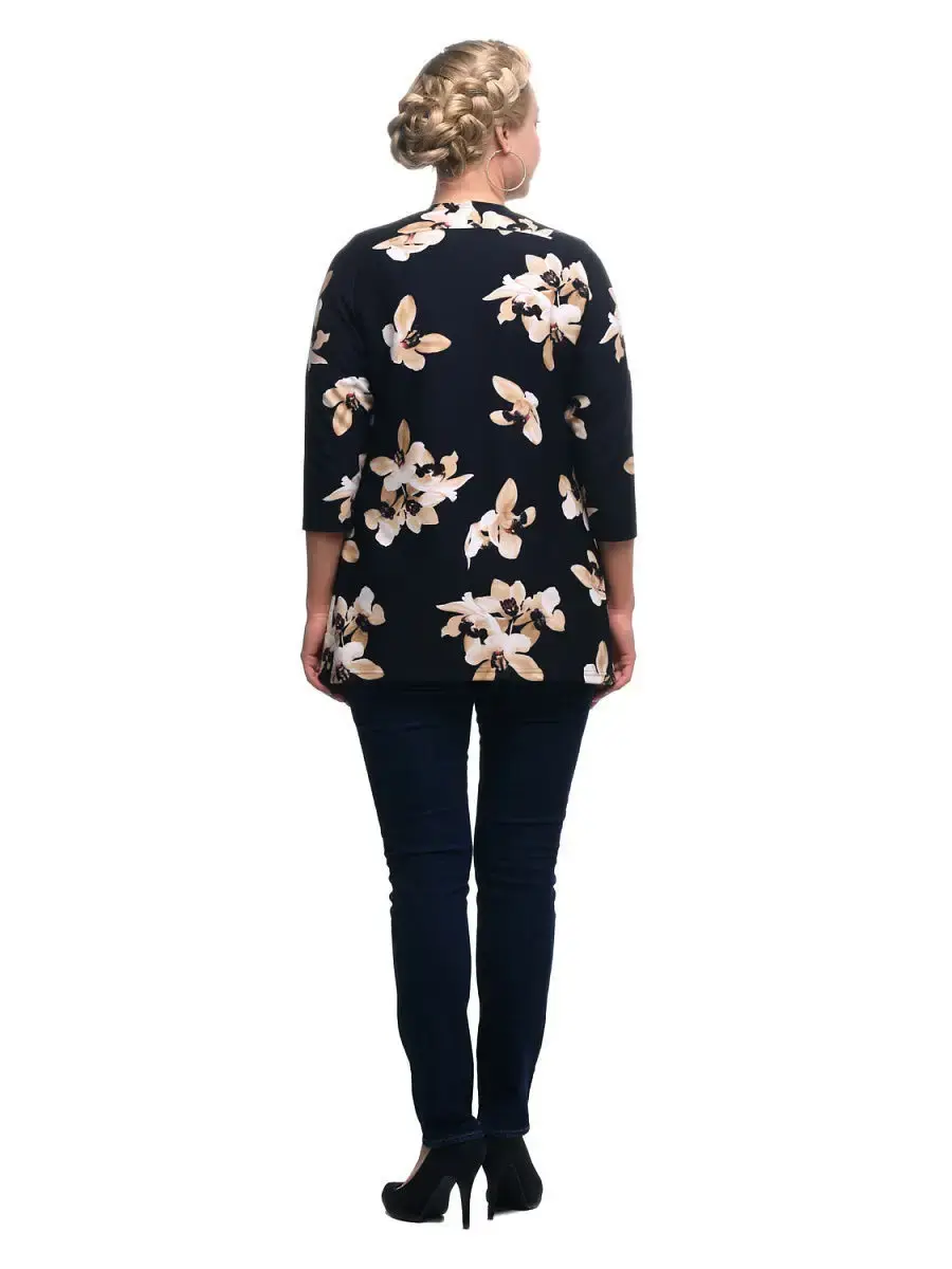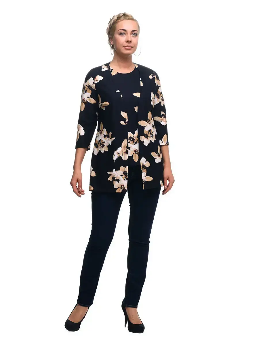 Эффектный комплект - кардиган плюс блузка из плотного трикотажного полотна с крупным цветочным принтом. Кардиган полуприлегающего силуэта; с V-образной горловиной, втачными рукавами со спущенной проймой длиной 3/4. Комплект кардиган с блузкой, Твинсет женский больших размеров, твинсет большой размер, комплект женский , костюм женский в офис, твин сет топ, кардиган с футболкой комплект, 2в1 кардиган с блузкой, кардиган и футболка, Твинсет трикотажный