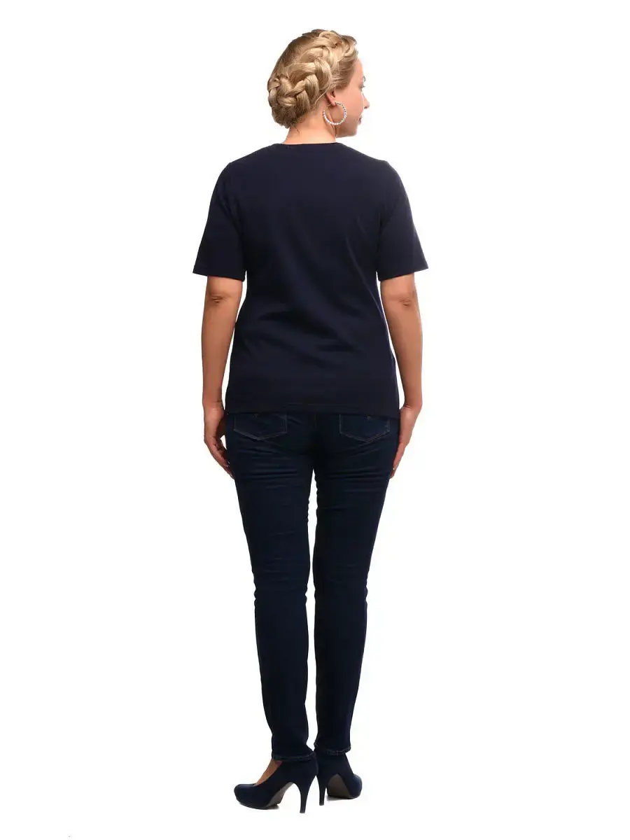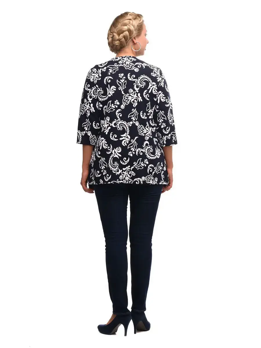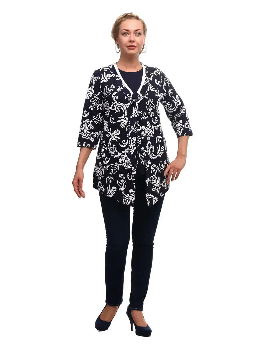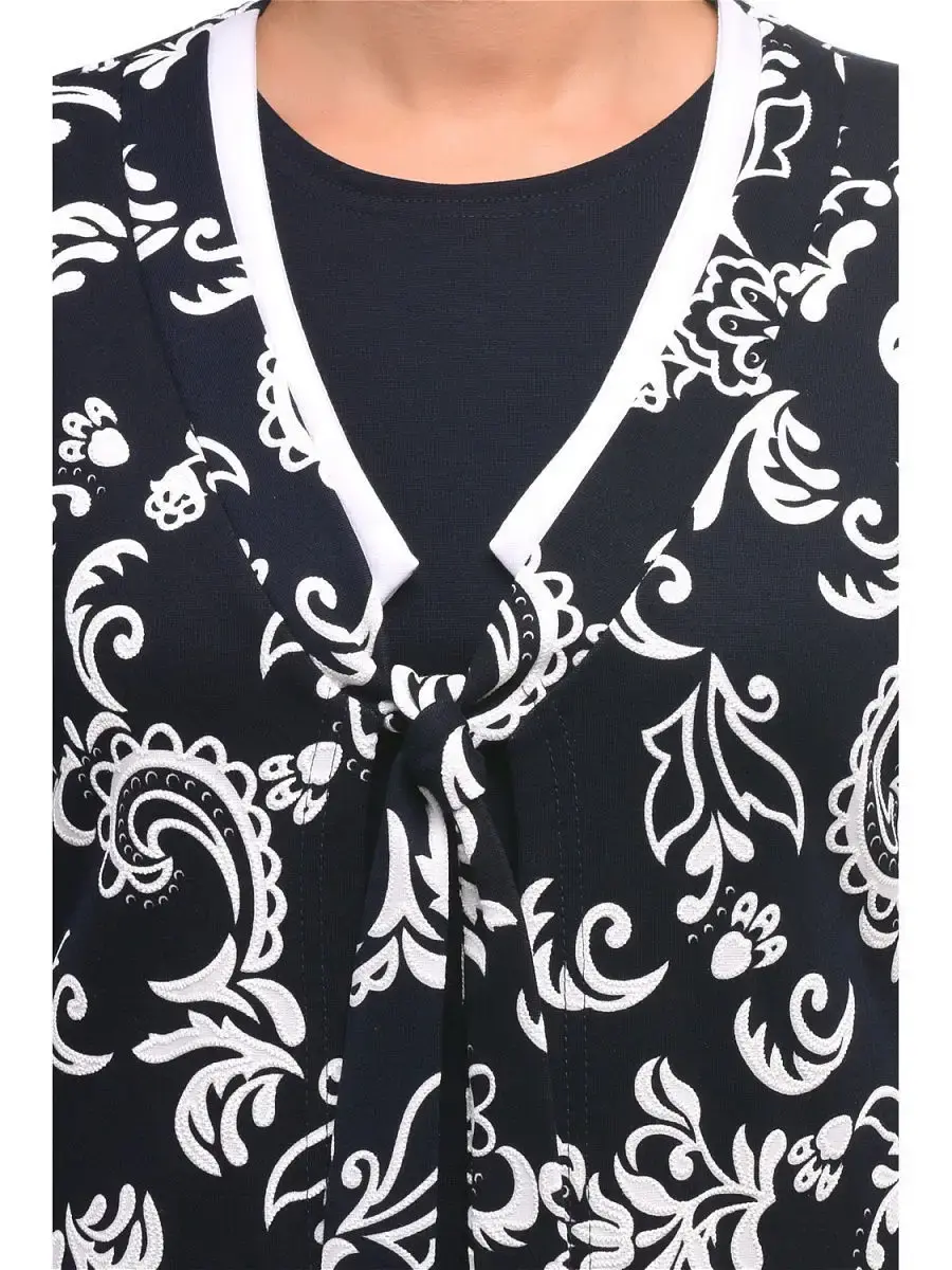 Стильный костюм состоит из кардигана с топом в комплекте. Кардиган треугольного силуэта, с конусным подолом спереди и прямым сзади; с широкими втачными рукавами длиной 3/4; V-образным вырезом, отделанным белой окантовкой и декорированный завязкой-галстуком, выполнен из плотного трикотажа с монохромным растительным принтом. Топ с округлой горловиной, втачными рукавами по локоть, сшит из однотонной ткани. Крой и декор делают костюм одновременно деловым и нарядным. Твинсет женский больших размеров, комплект кардиган с блузкой большой размер, Твинсет женский больших размеров.