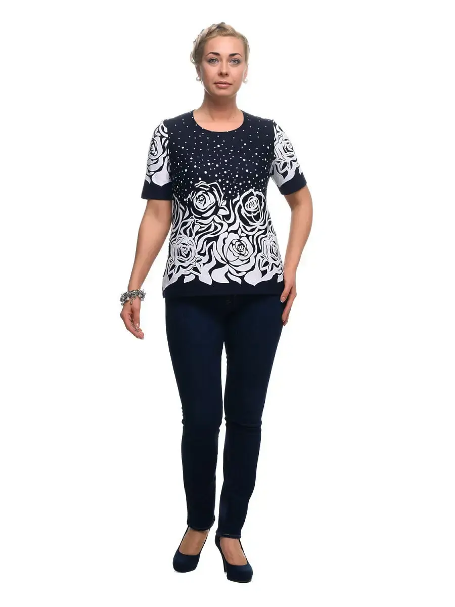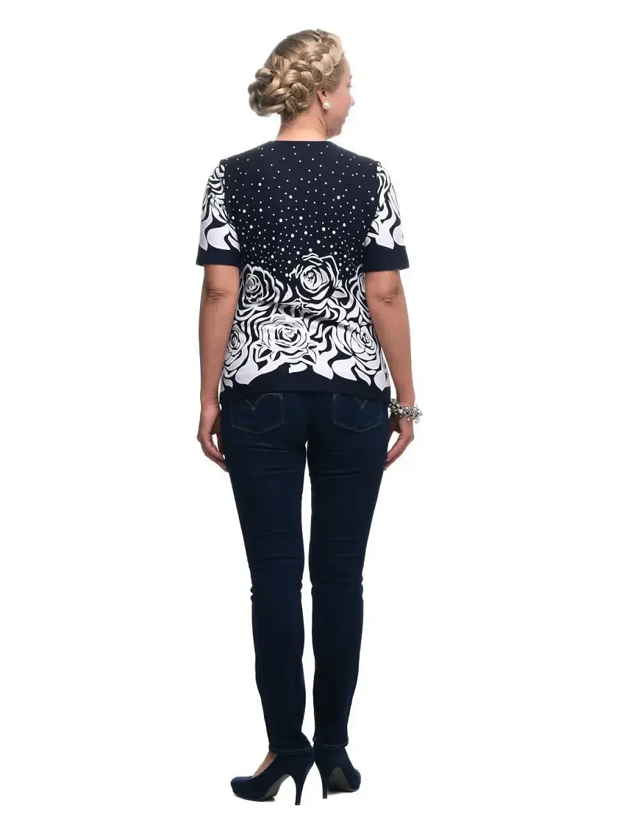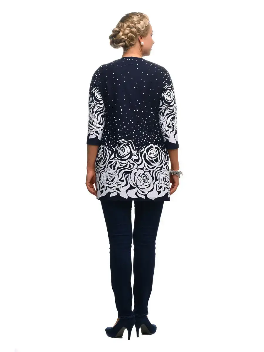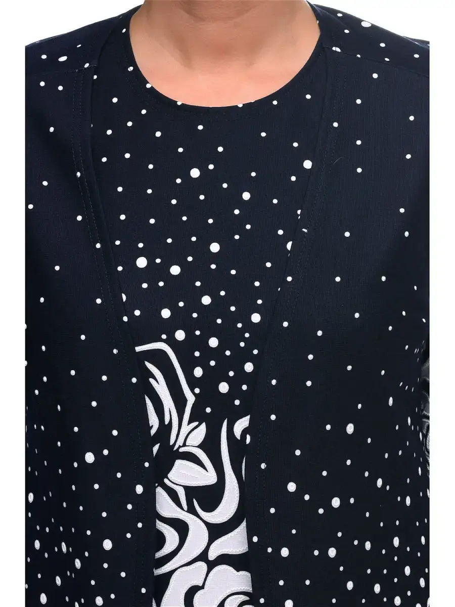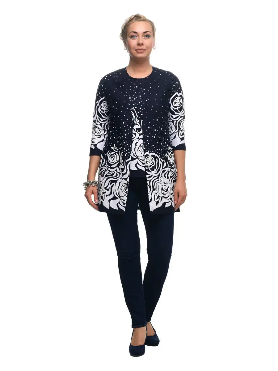 Оригинальный элегантный костюм состоит из кардигана и блузки, выполненные из плотного трикотажного полотна с рельефным монохромным принтом 3D, сочетающим крупные цветы и польский горошек. Кардиган удлиненный, приталенный, с рукавом 3/4, V-образной горловиной. Топ с округлой горловиной, коротким рукавом, длиной до середины бедра, выполнен из того же материала, что и кардиган.