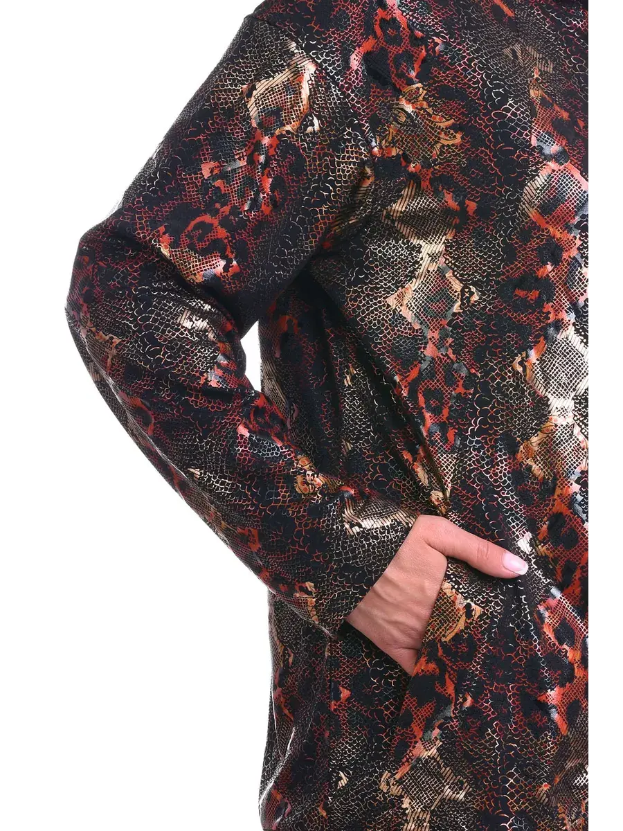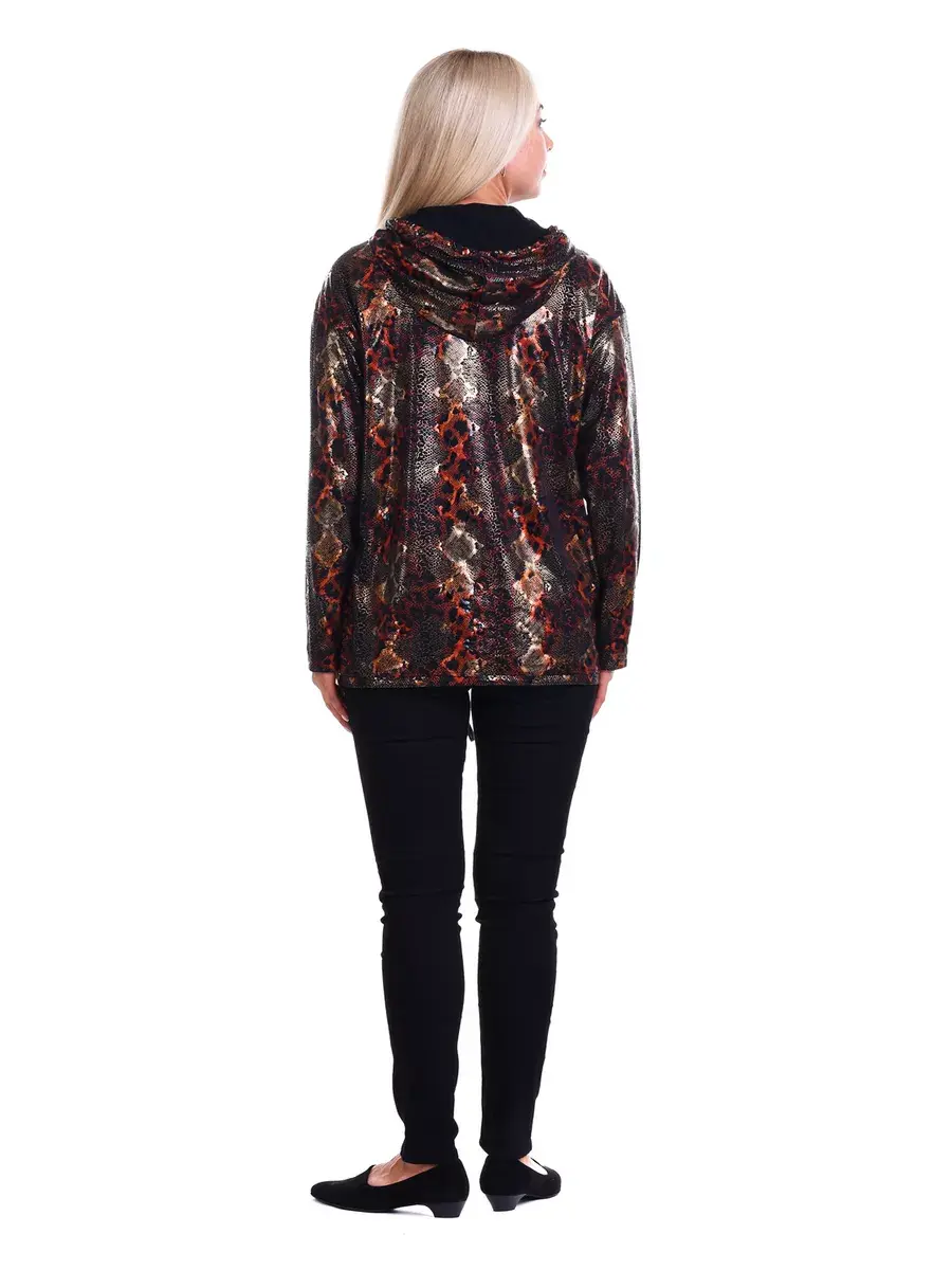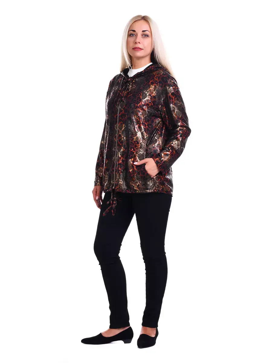 Стильная куртка ветровка из ткани с «природным» блестящим принтом-глиттером. Модель прямого кроя, с V-образным вырезом и капюшоном-воротником на завязках, с длинными рукавами со спущенной проймой, на застежке-молнии. Ветровка на подкладке, низ изделия затягивается на кулиску.