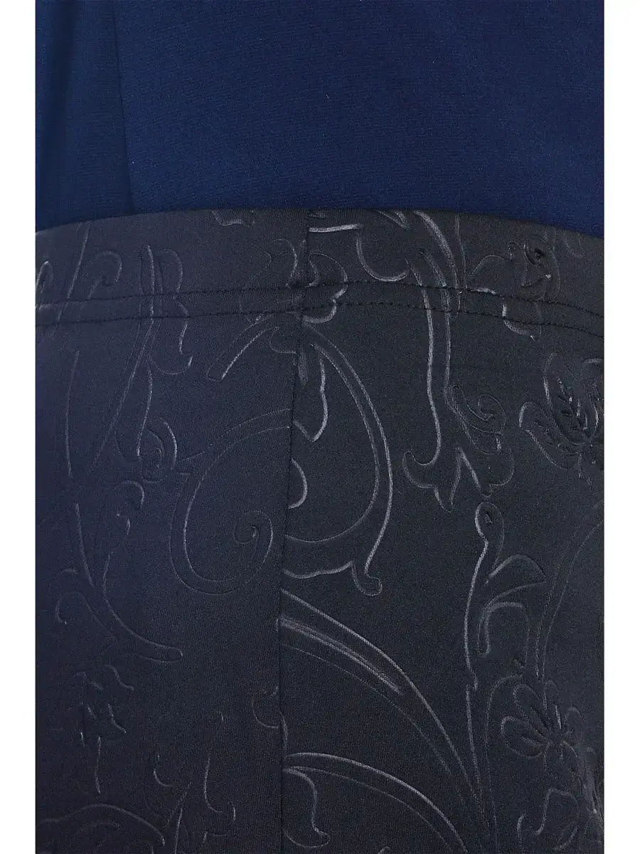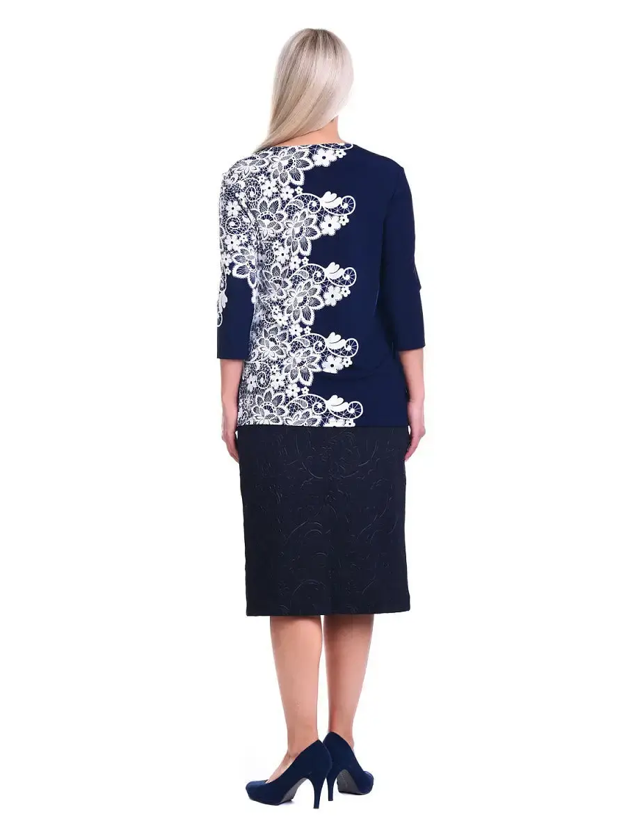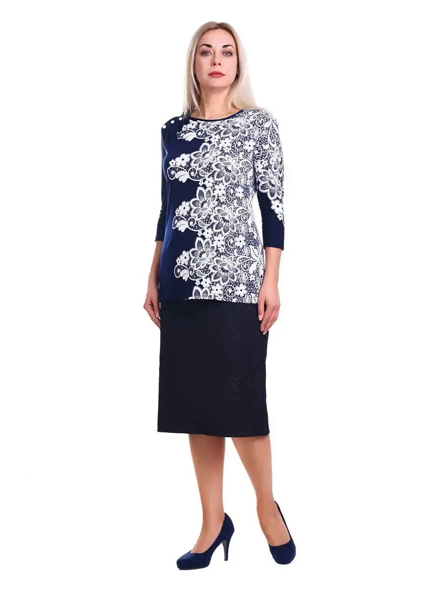 Элегантная юбка из эластичного трикотажа с рельефным растительным принтом. Модель классического прямого кроя; длиной до середины голени; небольшим разрезом сзади; на антистрессовом поясе-резинке сверху. Состав ткани помогает изделию держать форму, облегчает уход за ним.