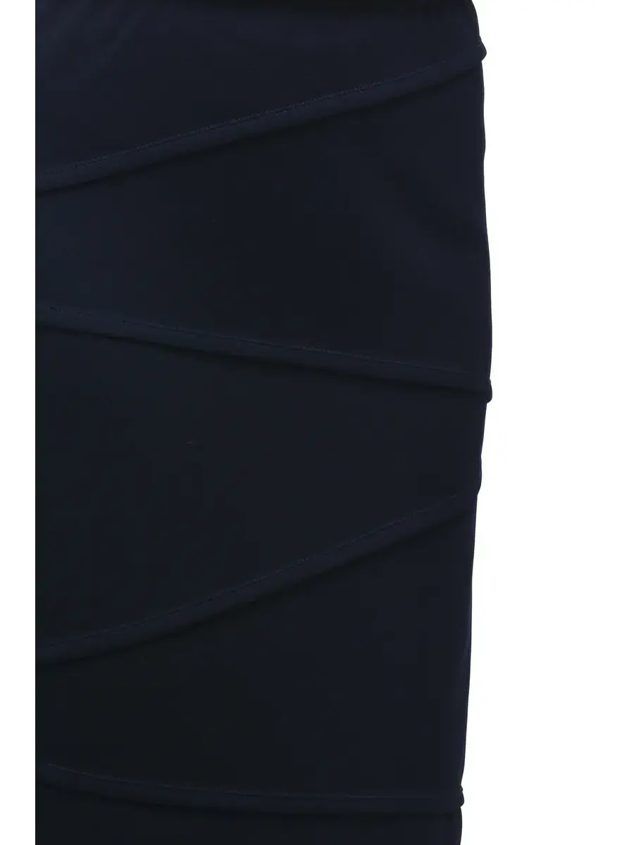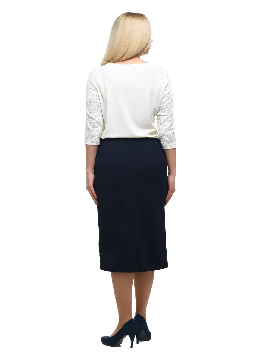 Элегантная прямая юбка из тонкой эластичной ткани, длиной чуть ниже колен. Модель на антистрессовом поясе с резинкой; со шлицей-разрезом на подоле, позволяющем сохранять легкую походку.